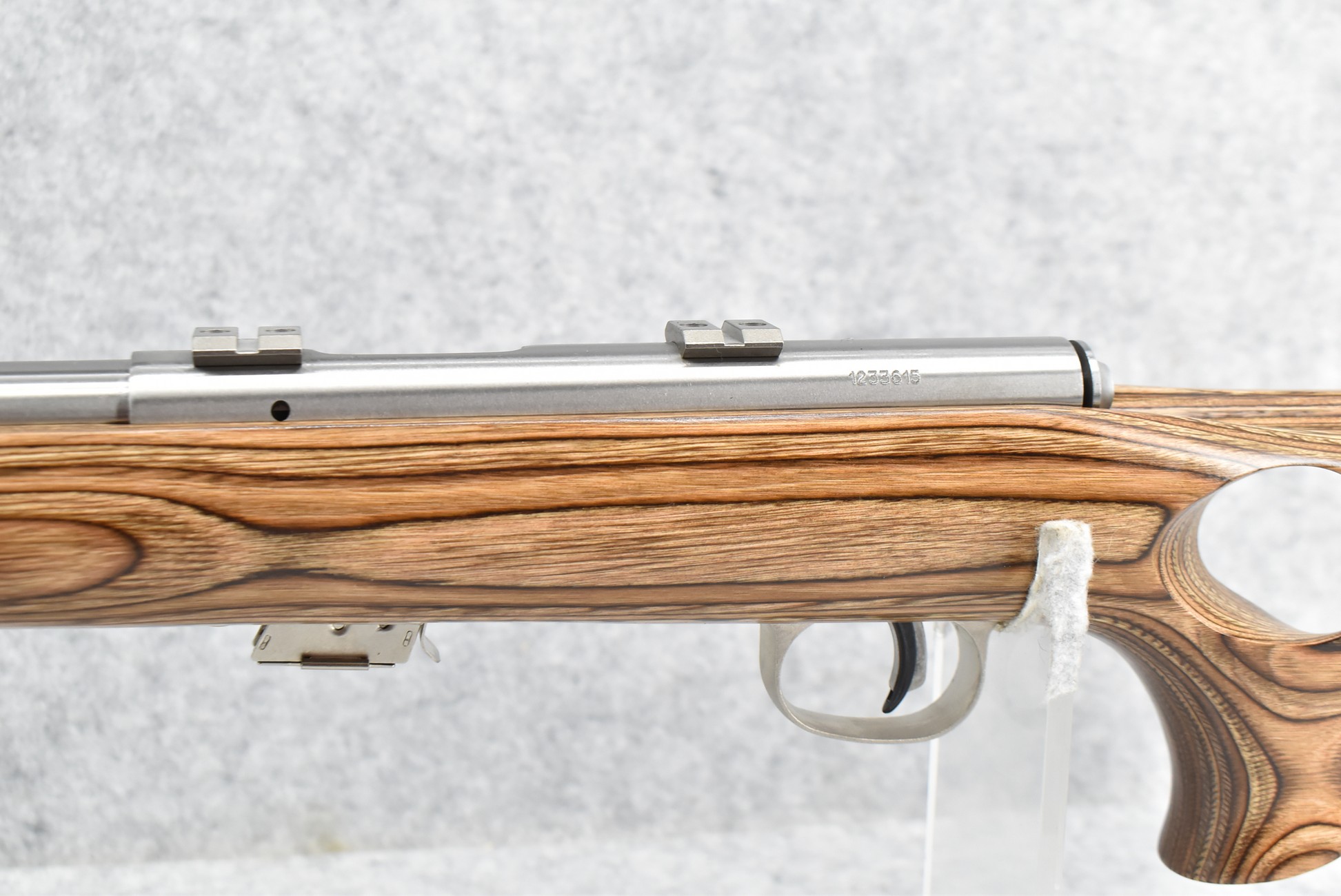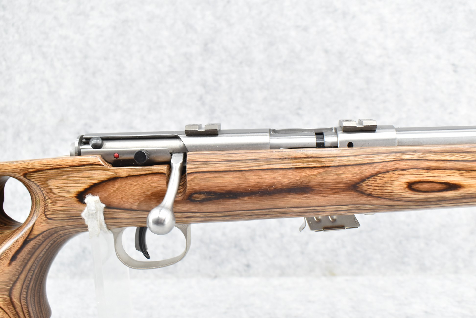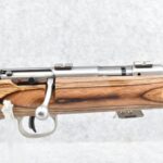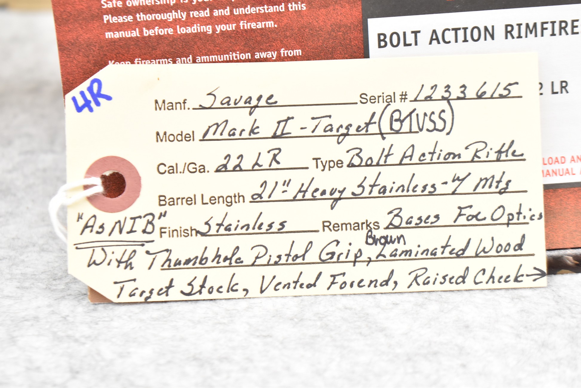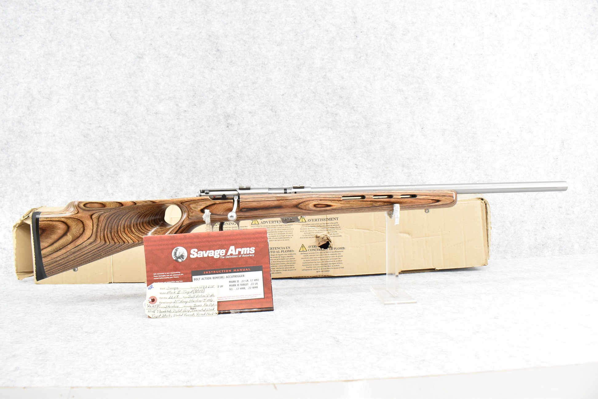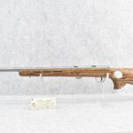 4R. Savage – Mod. Mark II (BTVSS) – 22LR Cal. Bolt Action Rifle – w/21” Stainless Heavy Barrel w/Mounting Bases for Optics – Stainless Finish – w/Thumbhole Pistol Grip Brown Laminated Wood Target Stock w/Vented Forend and Factory Butt Pad – w/1 Factory Detachable Magazine – As New w/Factory Box, Manual