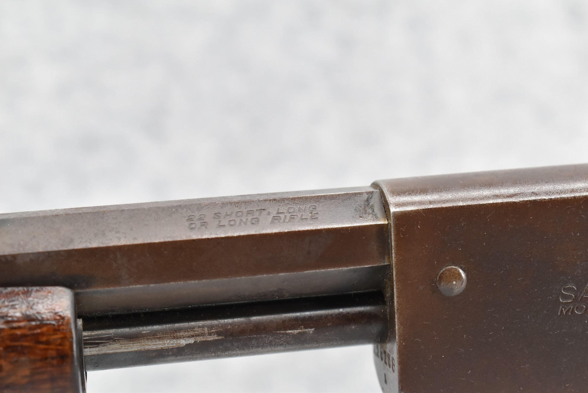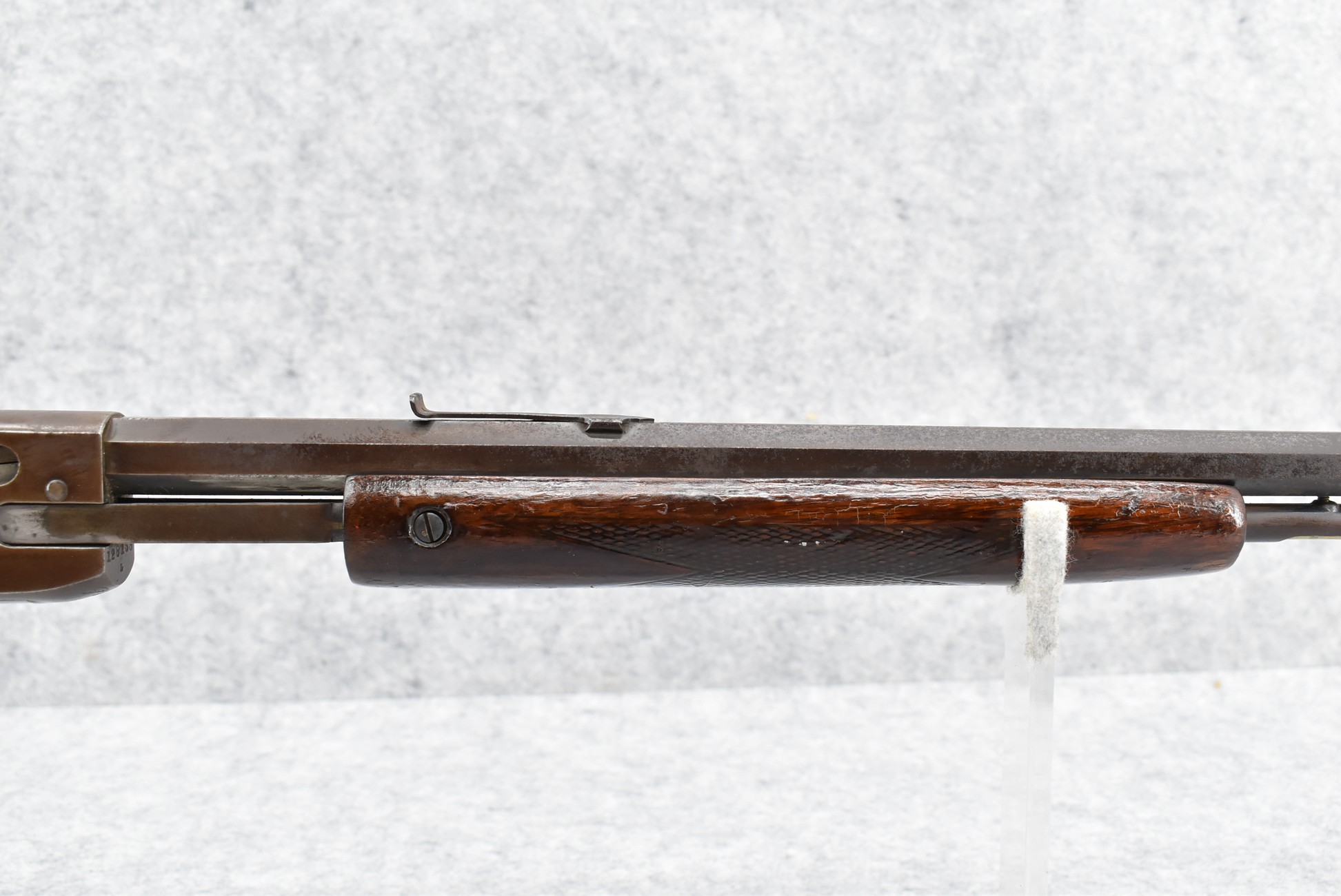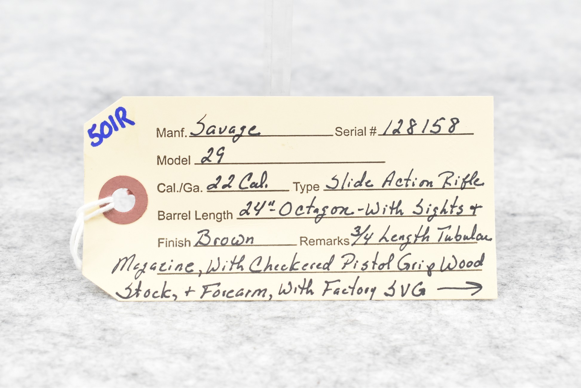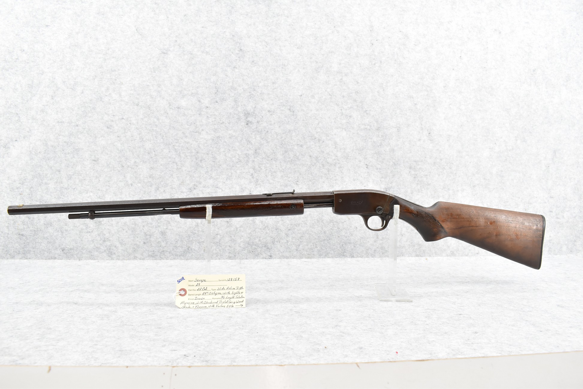 501R. Savage – Mod. 29 – 22 Cal. Pump Action Rifle – w/24” Octagon Barrel w/Sights & ¾ Length Tubular Magazine – Brown Finish – w/Checkered Pistol Grip Wood Stocks w/Factory Butt Plate w/1964 Kennedy Half Dollar Inlaid in Stock