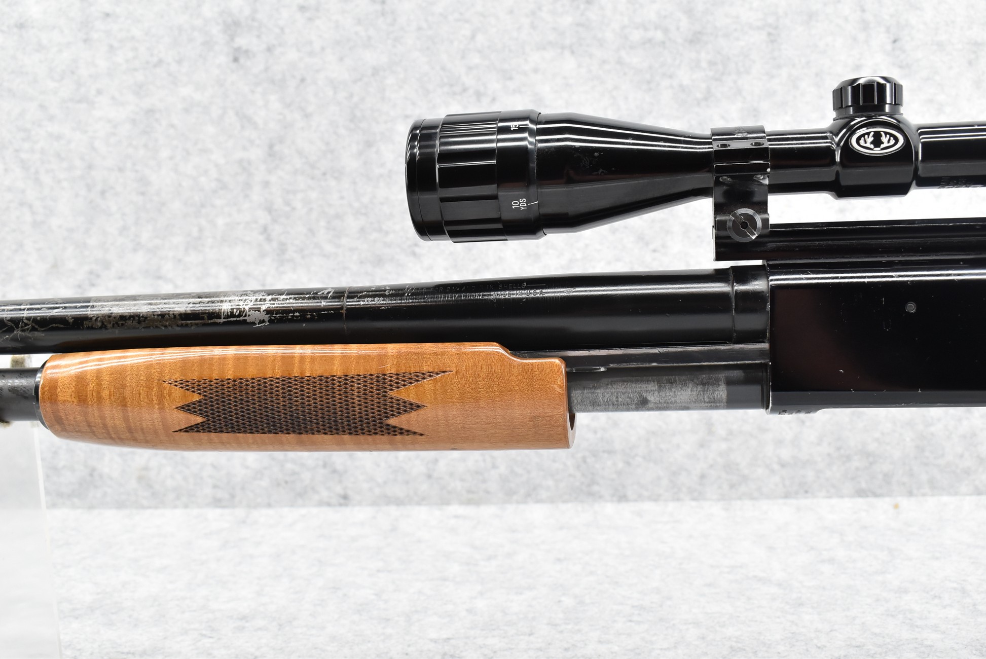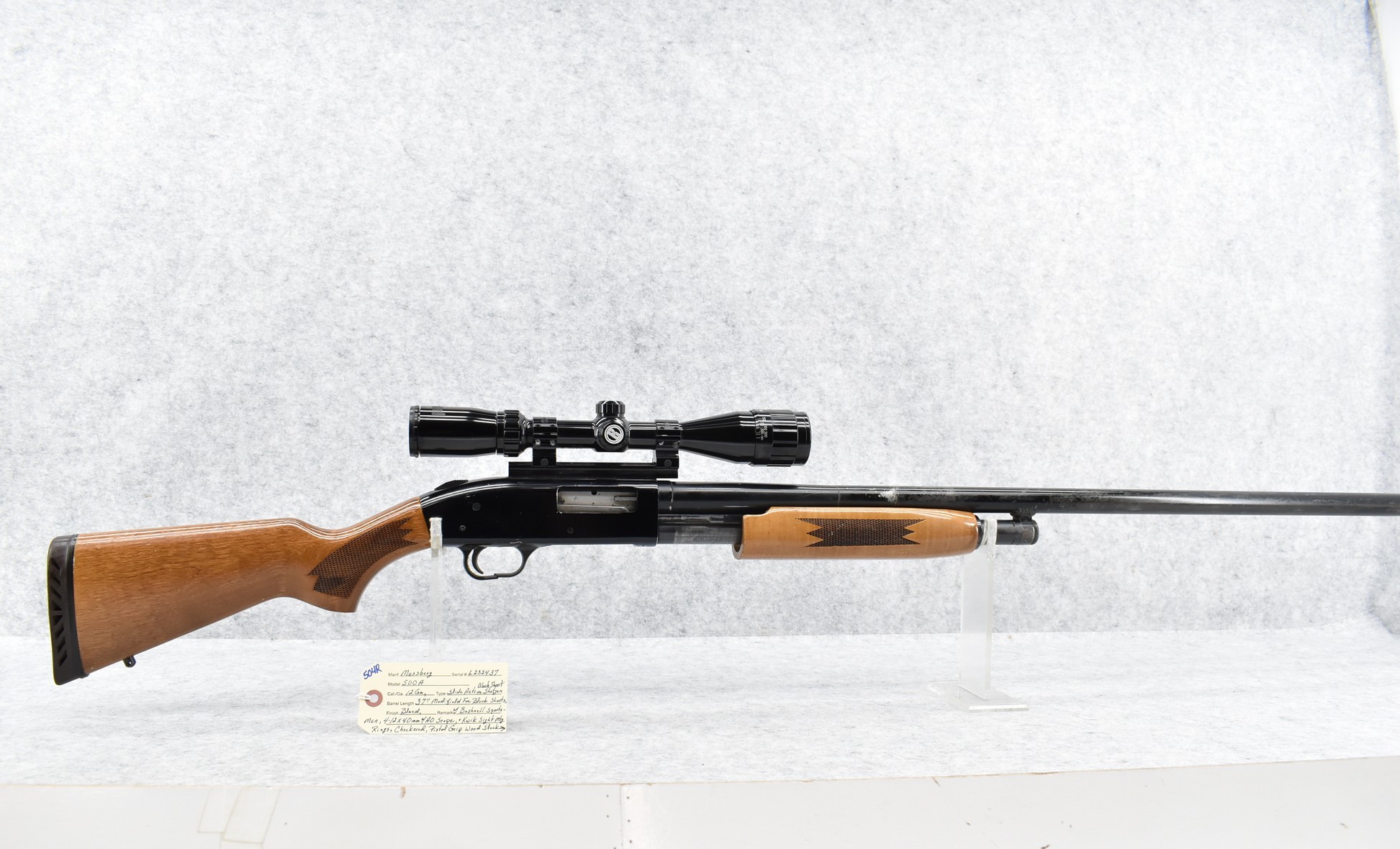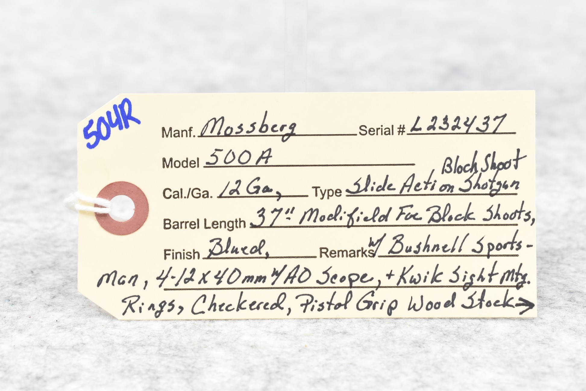504R. Mossberg – Mod. 500A – 12ga. Pump Action Block Shoot Shotgun – w/37” Barrel Modified for Block Shooting – Blued Finish – w/Checkered Pistol Grip Wood Stocks w/Butt Pad – w/Bushnell 4-12x40mm Scope w/AO – Note: Trigger Guard Cracked