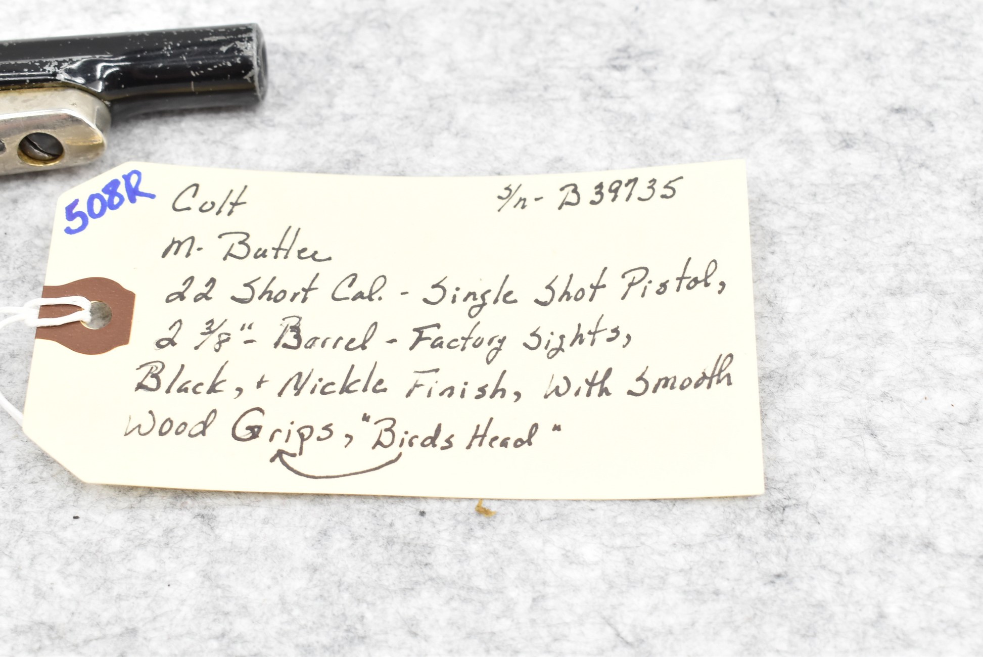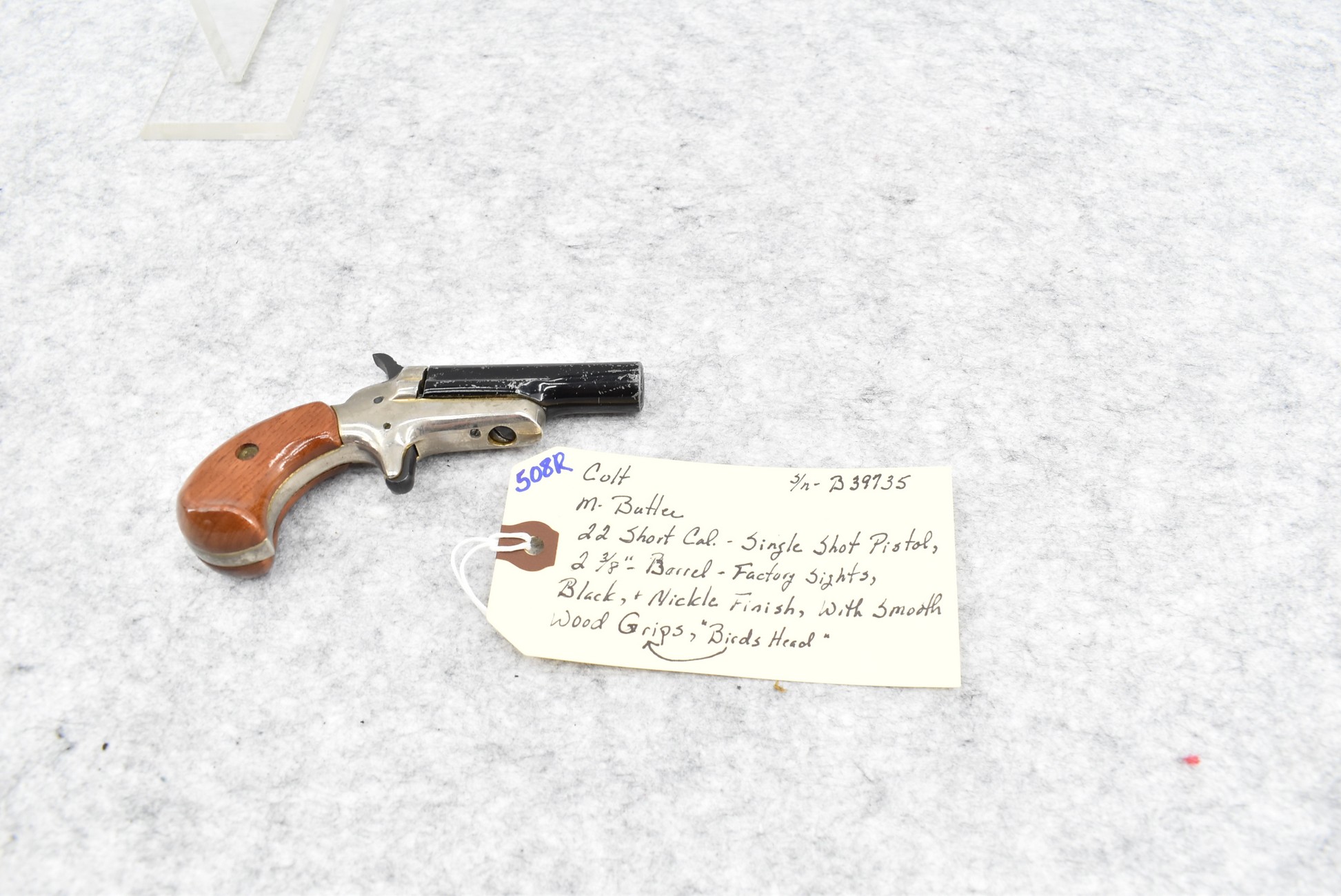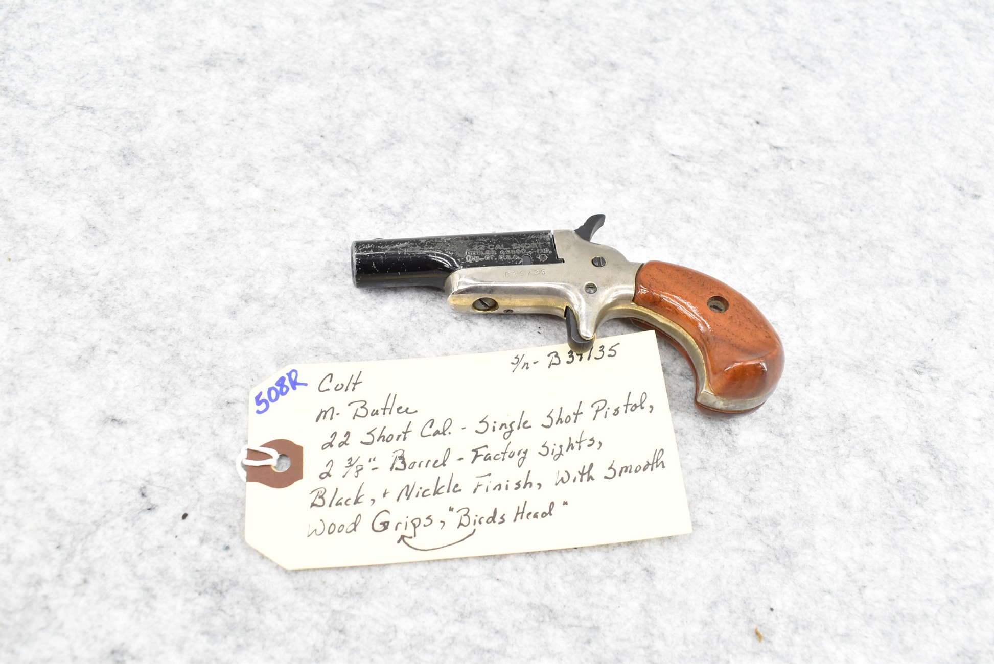 508R. Colt – Mod. Butler – 22 Short Cal. Single Shot Pistol – w/2 3/8” Barrel w/Factory Sights – Black/Nickel Finish – w/Smooth Wood Birds Head Grips (CANNOT GO TO MARYLAND!)