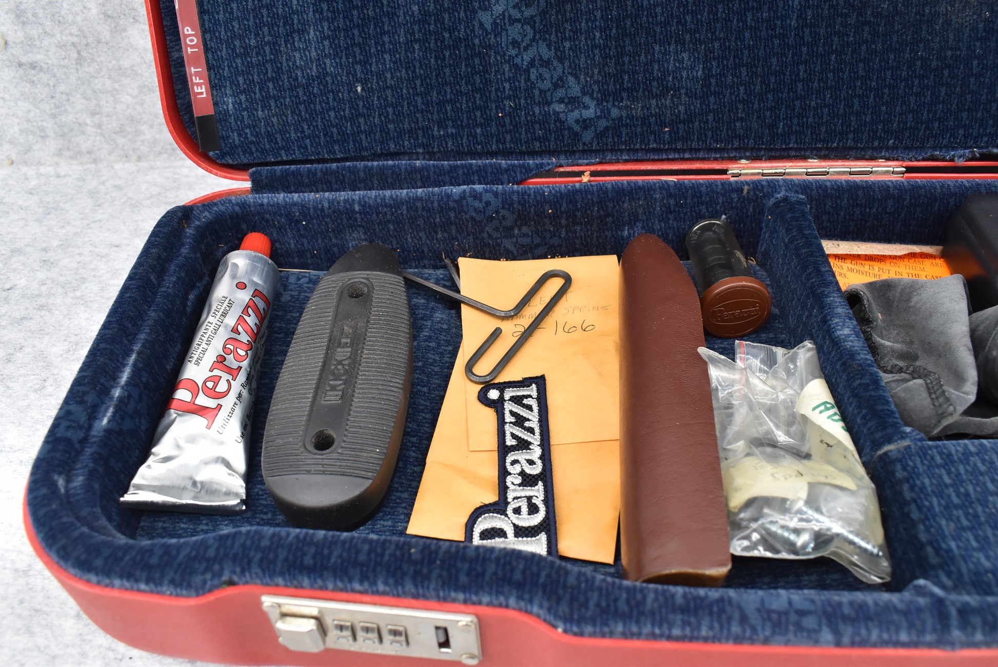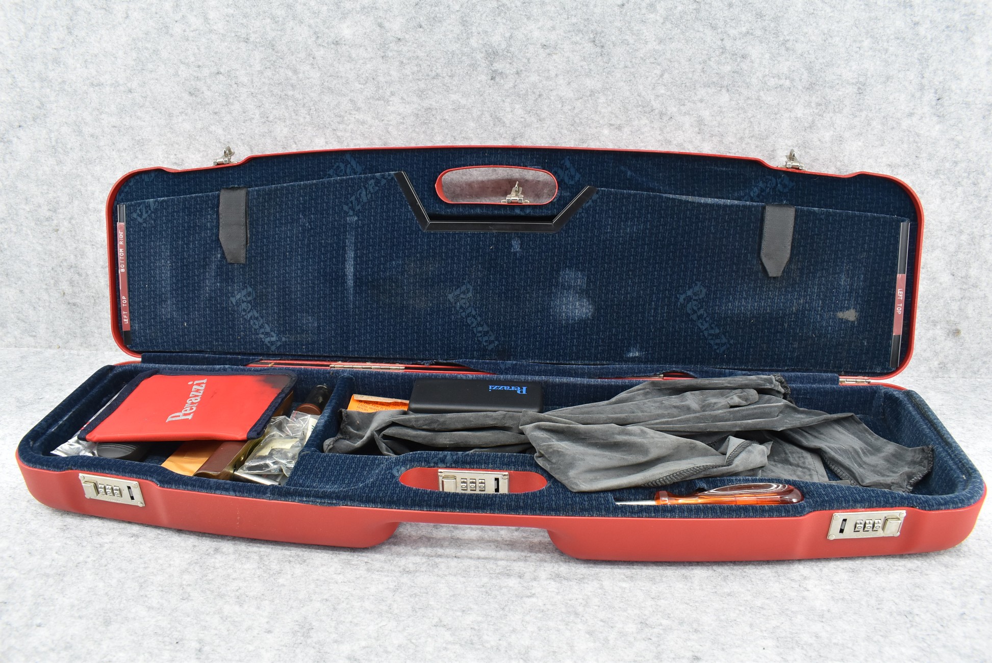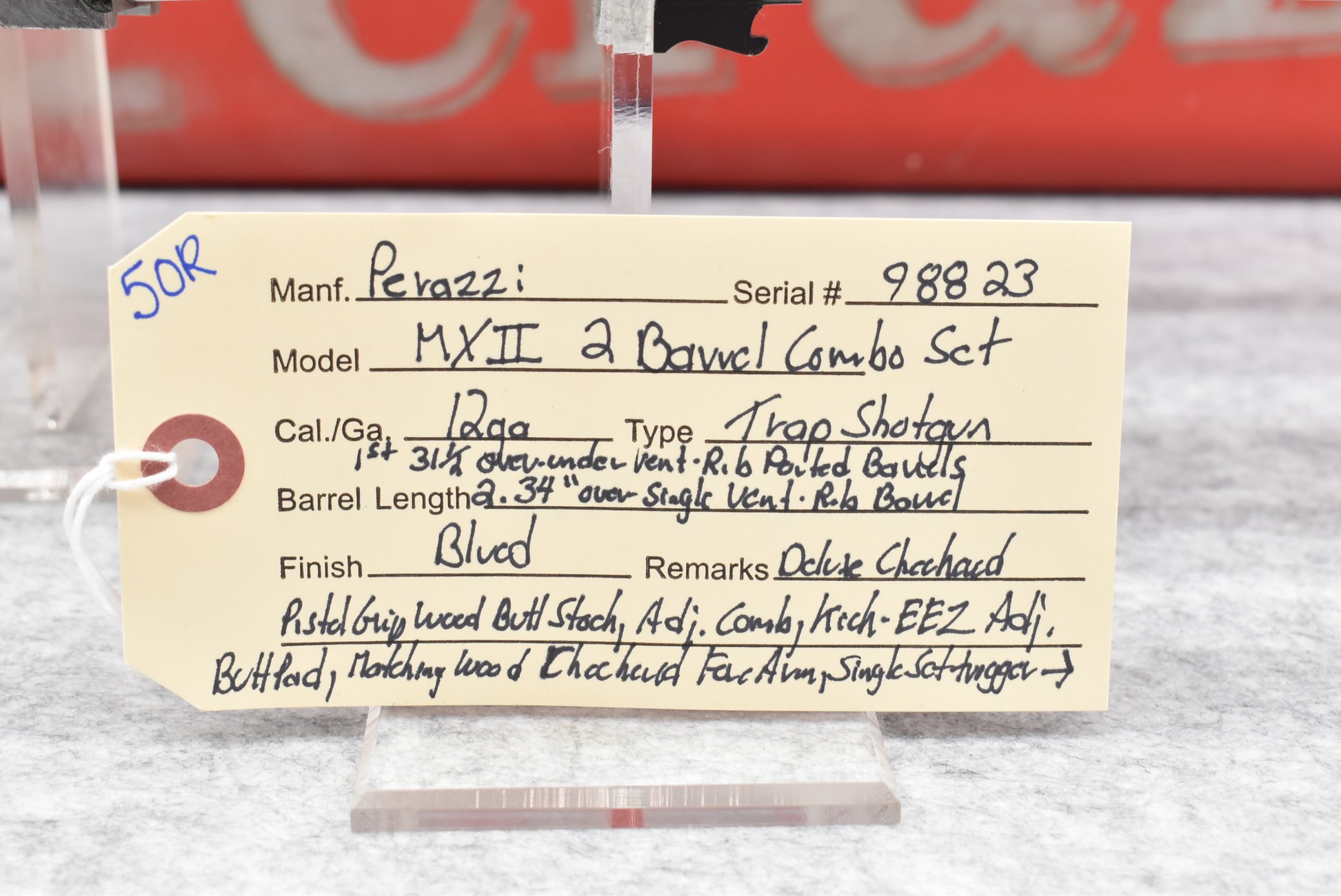50R. Perazzi – Mod. MXII 2-Barrel Trap Combo Set – 12ga. Trap Shotgun – 1st Barrel is 31½” Over/Under Vent Rib Ported Barrel and 2nd is 34” Over/Single Vent Rib Barrel – Blued Finish – w/Deluxe Checkered Pistol Grip Wood Butt Stock and Matching Wood Checkered Forearm w/Adjustable Comb and Adjustable Butt Pad – w/Single Select Trigger – Gun Comes Fitted with a Perazzi Takedown Case, Tools, Extra Leather Comb, Grease, and Internals