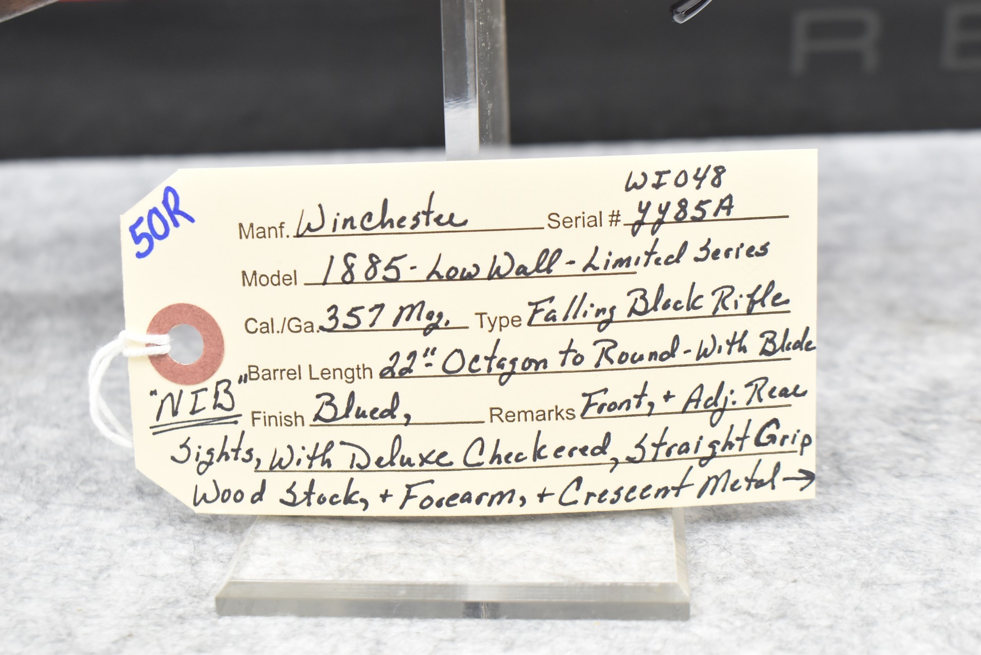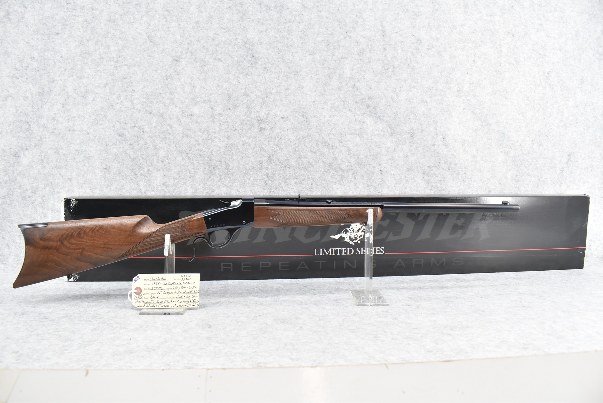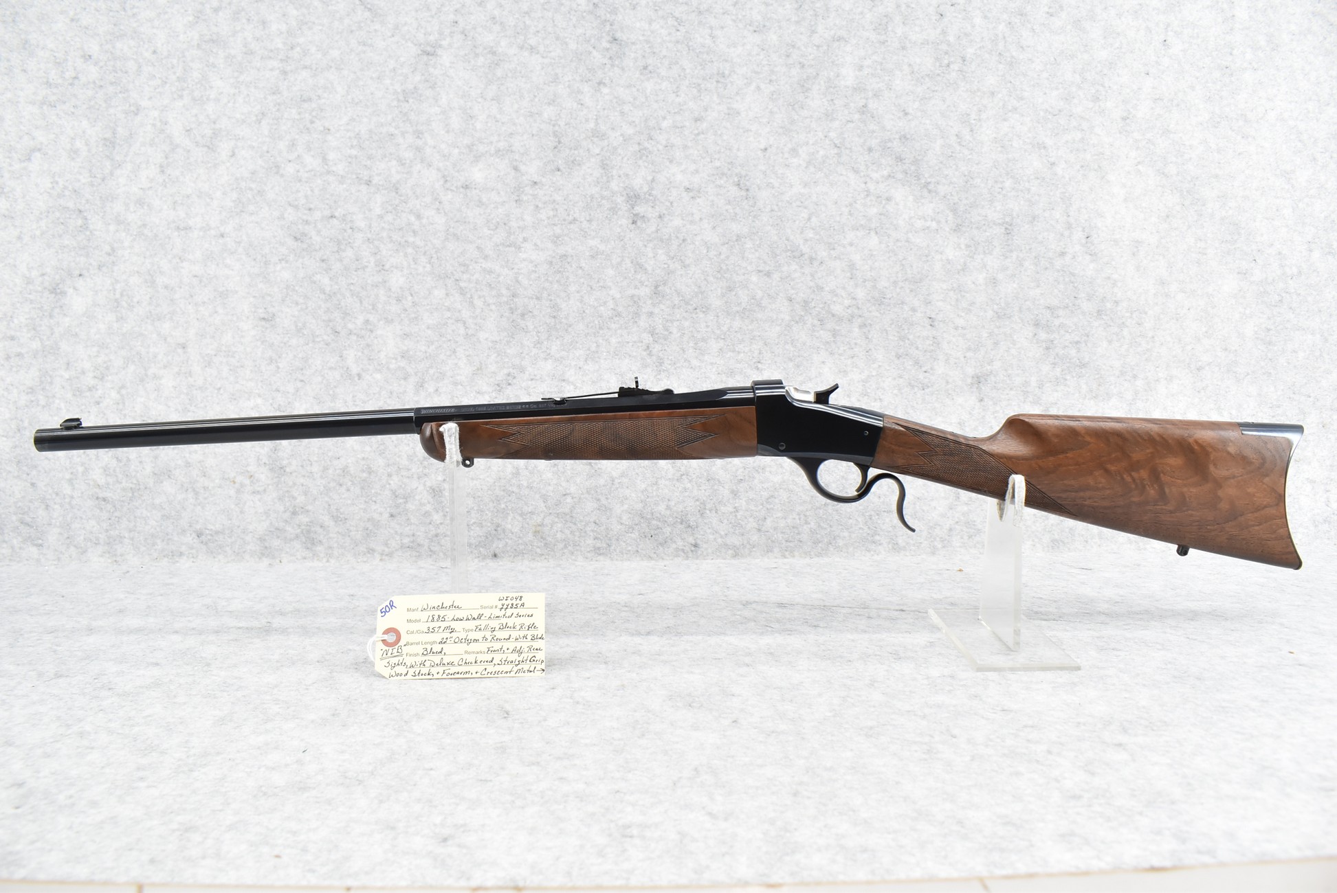 50R. Winchester – Mod. 1885 Low Wall (Limited Series-Davidson Dist. Exclusive) – 357 Mag. Cal. Falling Block Single Shot Rifle – w/22” Octagon to Round Barrel w/Blade Front and Adjustable Rear Sights – Blued Finish – w/Deluxe Checkered Straight Grip Wood Stock and Matching Wood Forearm w/Crescent Metal Butt Plate – New in Factory Box w/Manuals and Accessories