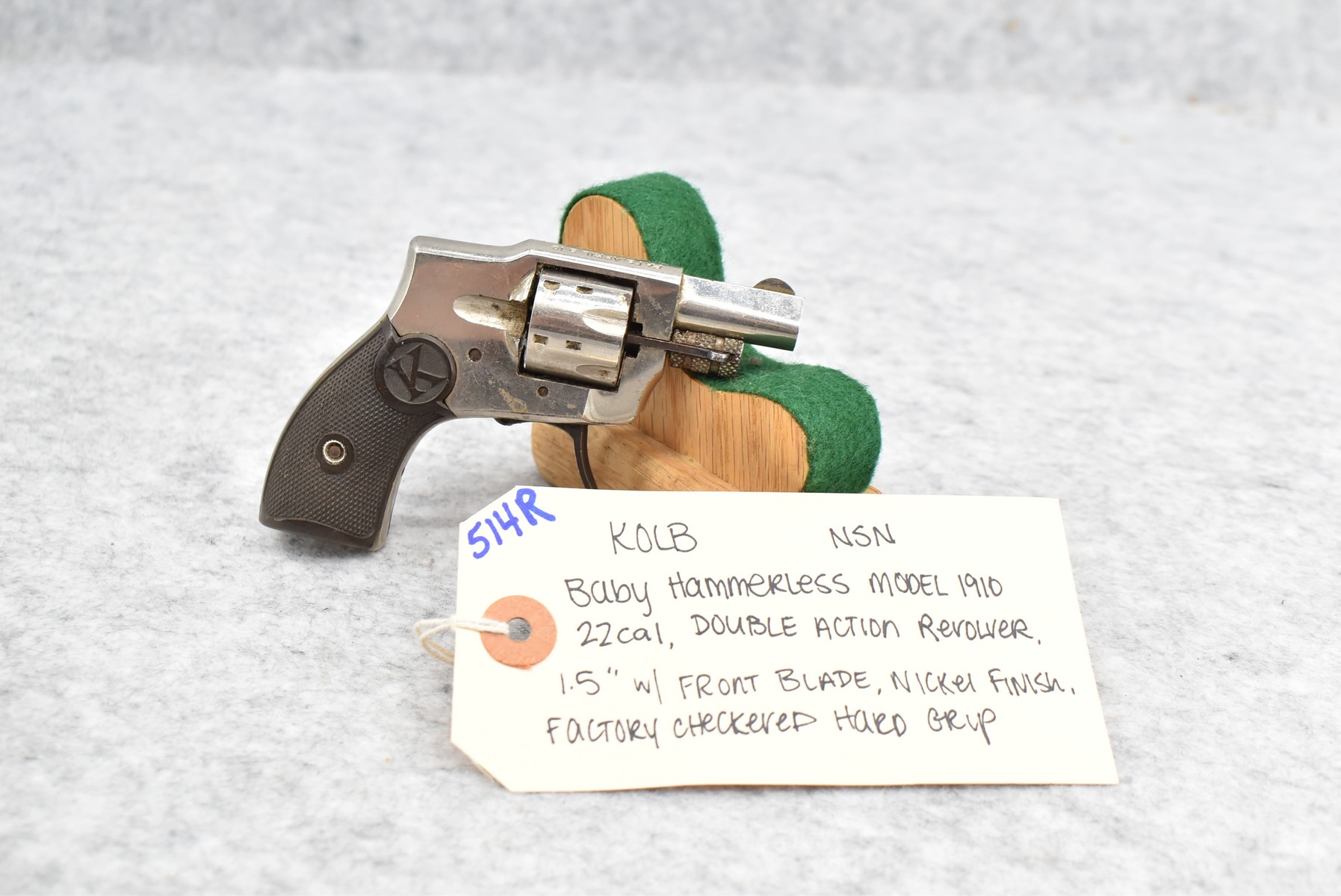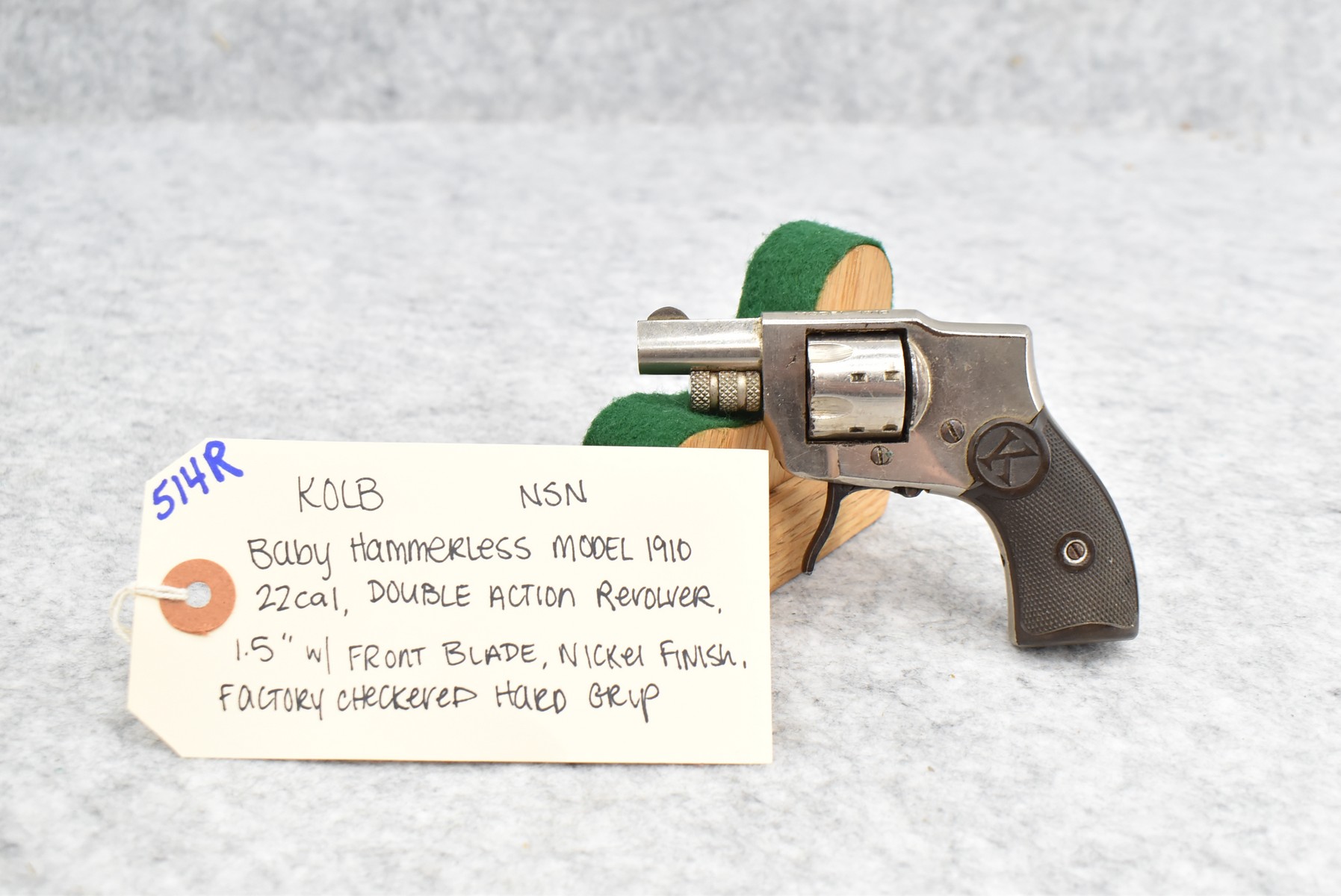 514R. Kolb – Mod. Baby Hammerless Model 1910 – 22 Cal. Double Action Revolver – w/1.5” Barrel w/Front Blade Sight – Nickel Finish – w/Factory Checkered Hard Grip – Note: Action Needs Adjustment