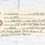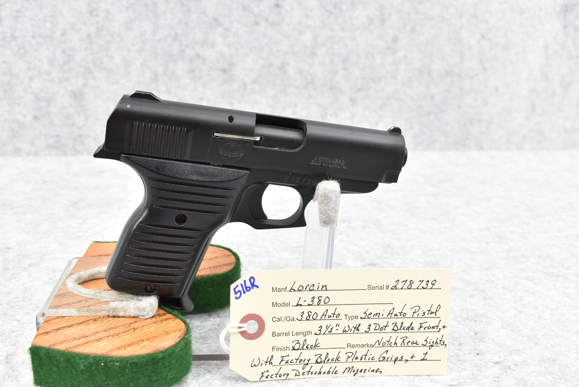 516R. Lorcin – Mod. L-380 – 380 Auto Cal. Semi-Auto Pistol – w/3 ½” Barrel w/3-Dot Blade Front & Notch Rear Sights – Black Finish – w/Factory Black Plastic Grips – w/Factory Detachable Magazine