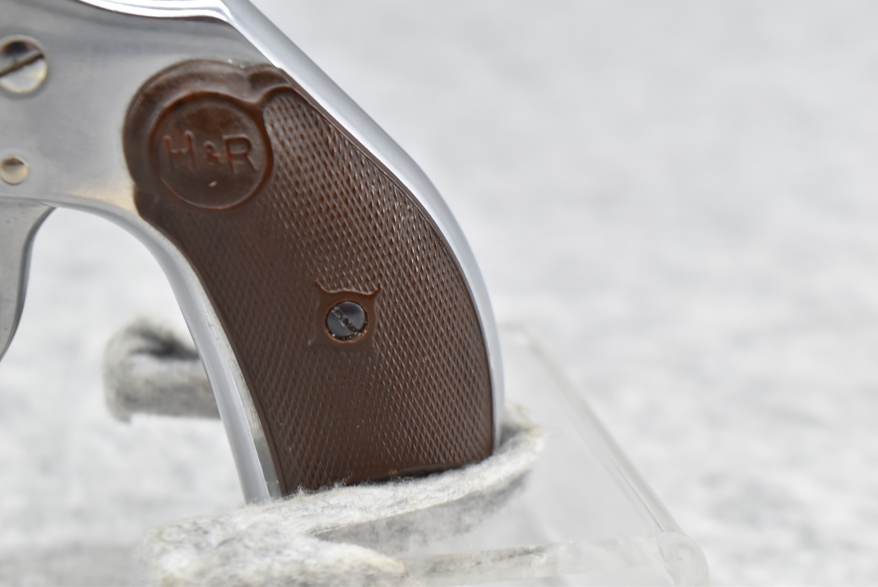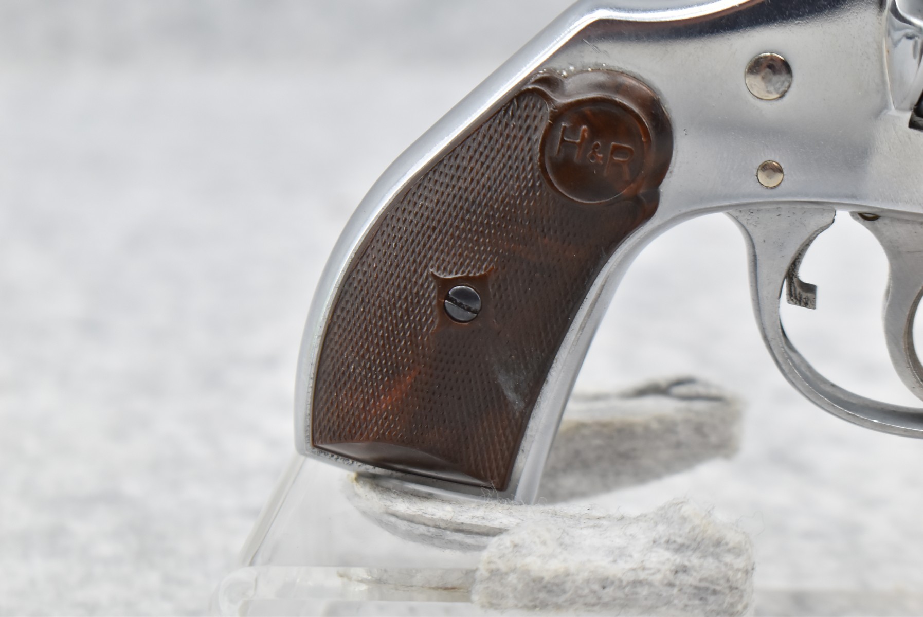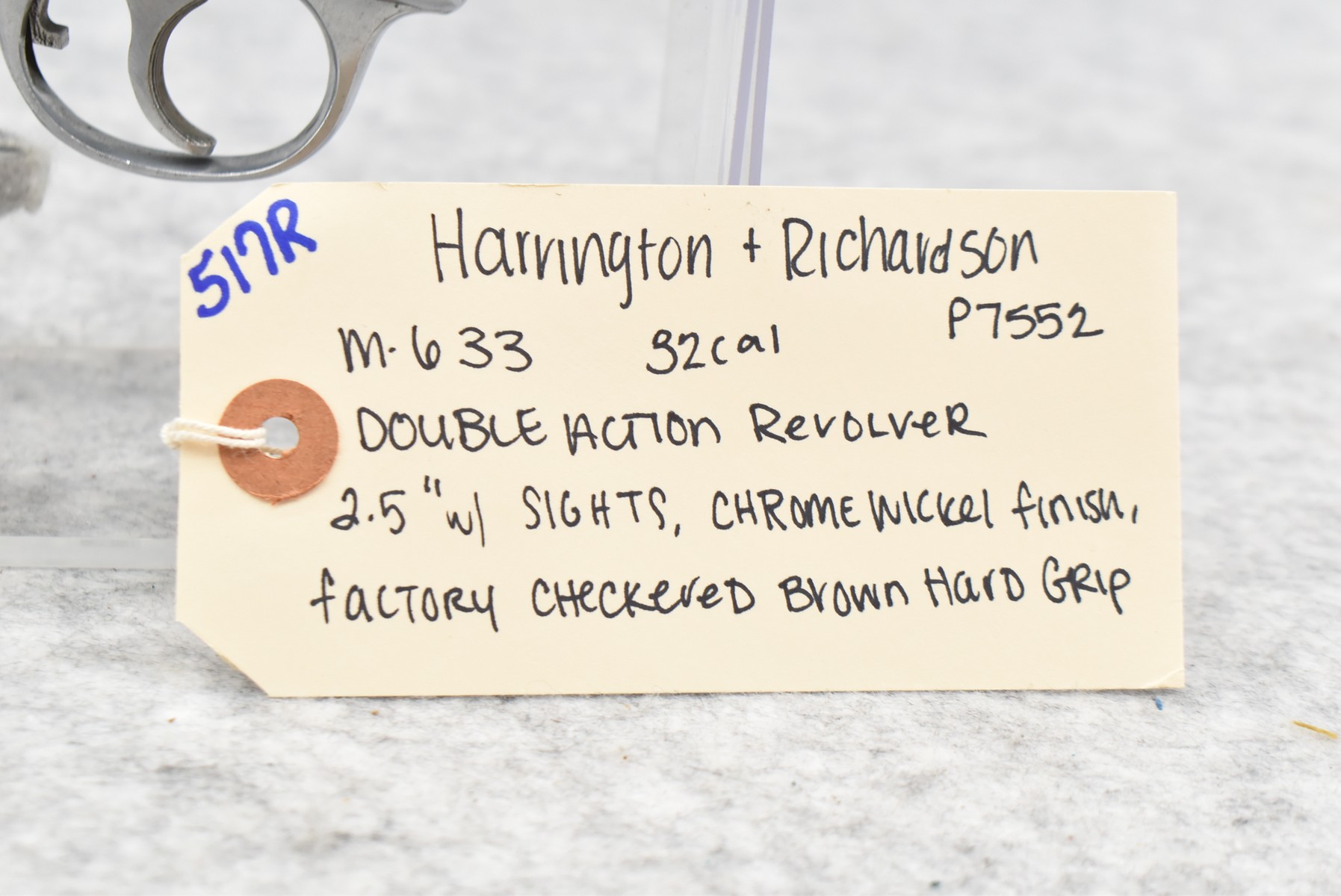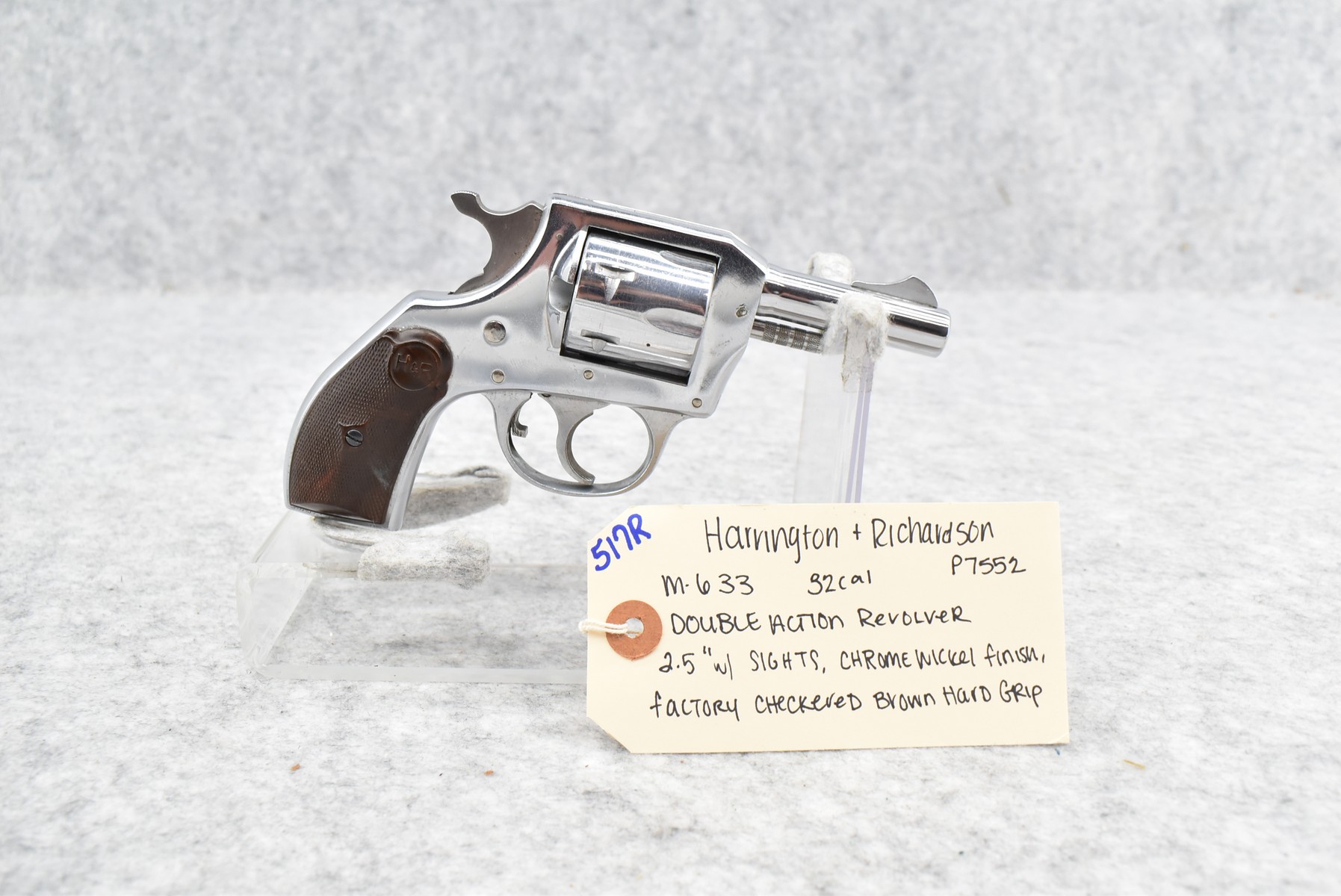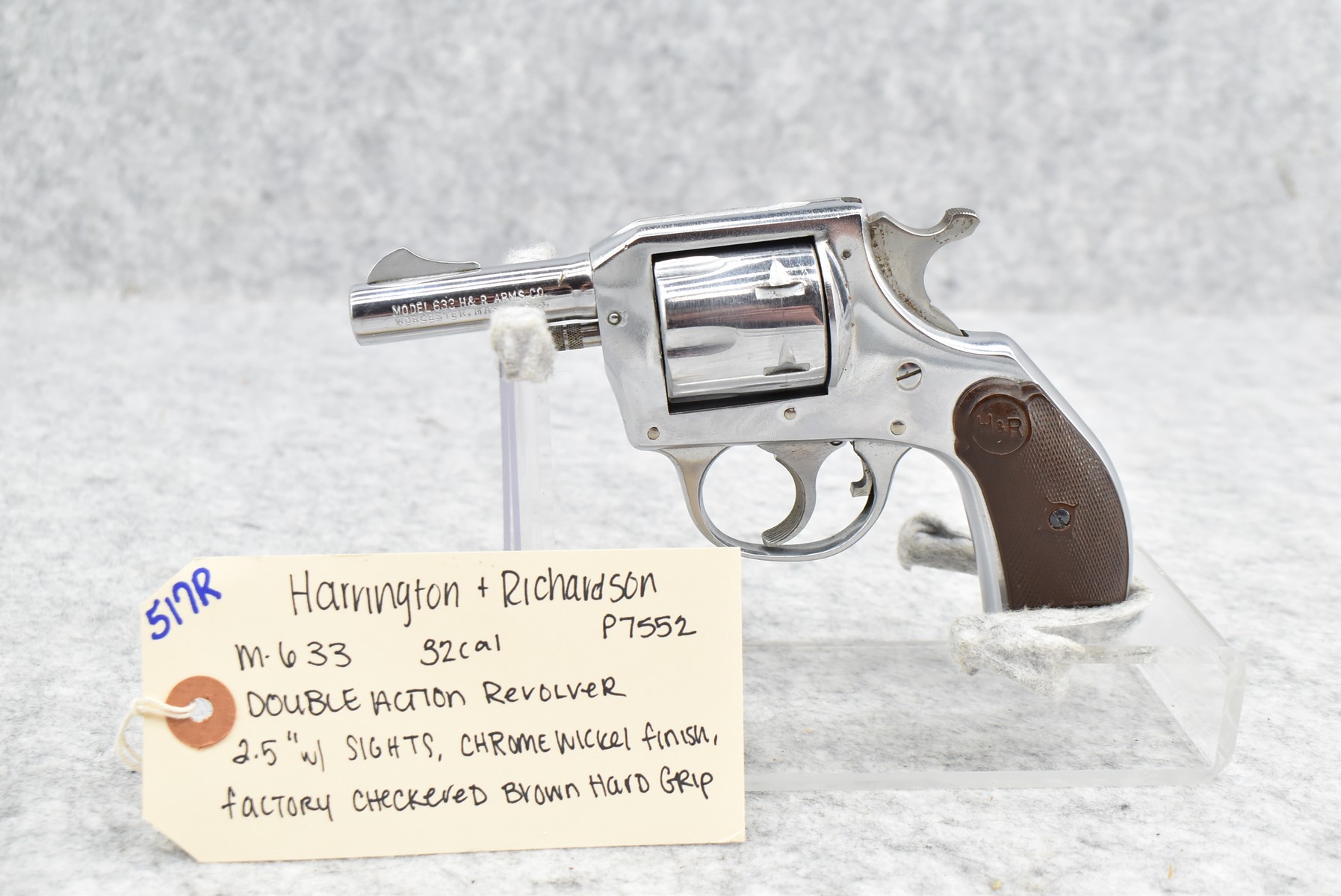 517R. Harrington & Richardson – Mod. 633 – 32 S&W Cal. Double Action Revolver – w/2.5” Barrel w/Sights – Chrome Finish – w/Factory Checkered Brown Hard Grip – Fully Functional