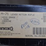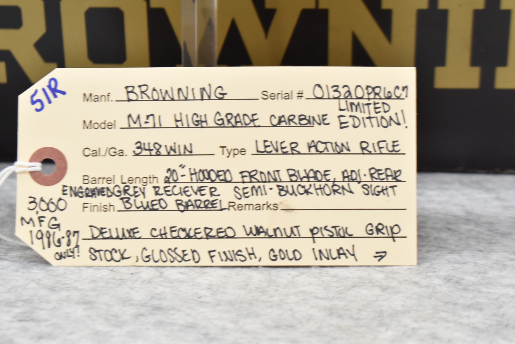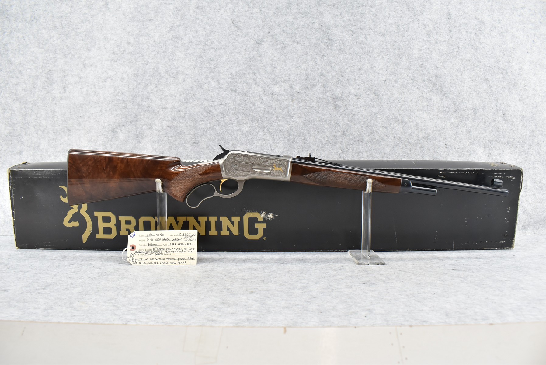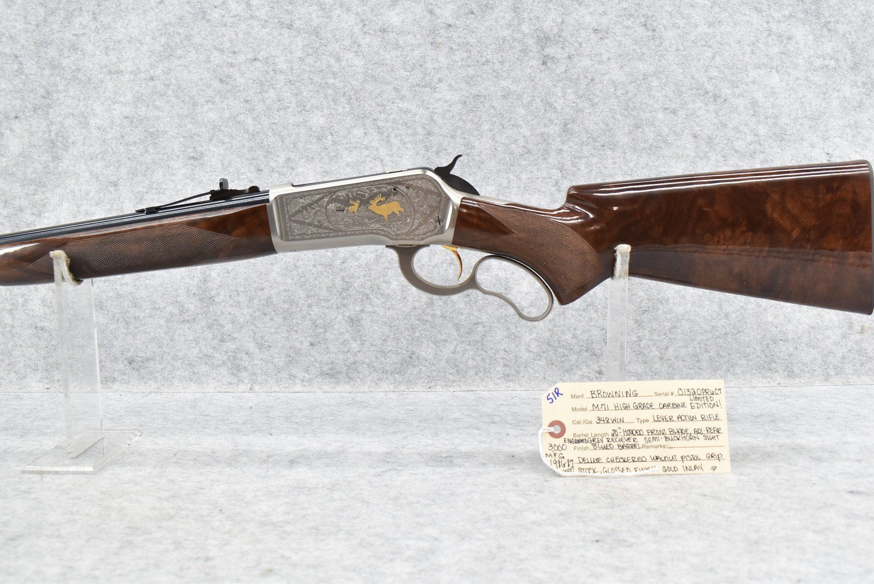 51R. Browning – Mod. M-71 High Grade Carbine Limited Edition – 348 Win. Cal. Lever Action Rifle – w/20” Barrel w/Hooded Front Blade and Adjustable Rear Semi-Buckhorn Sights – Blued Finish – w/Deluxe Checkered Walnut Gloss Finished Pistol Grip Wood Stocks w/Factory Butt Plate – w/Engraved Receiver, Gold Animal Inlay – Only 3,000 Manufactured in 1986 and 1987 – Unfired w/Factory Box and Manual