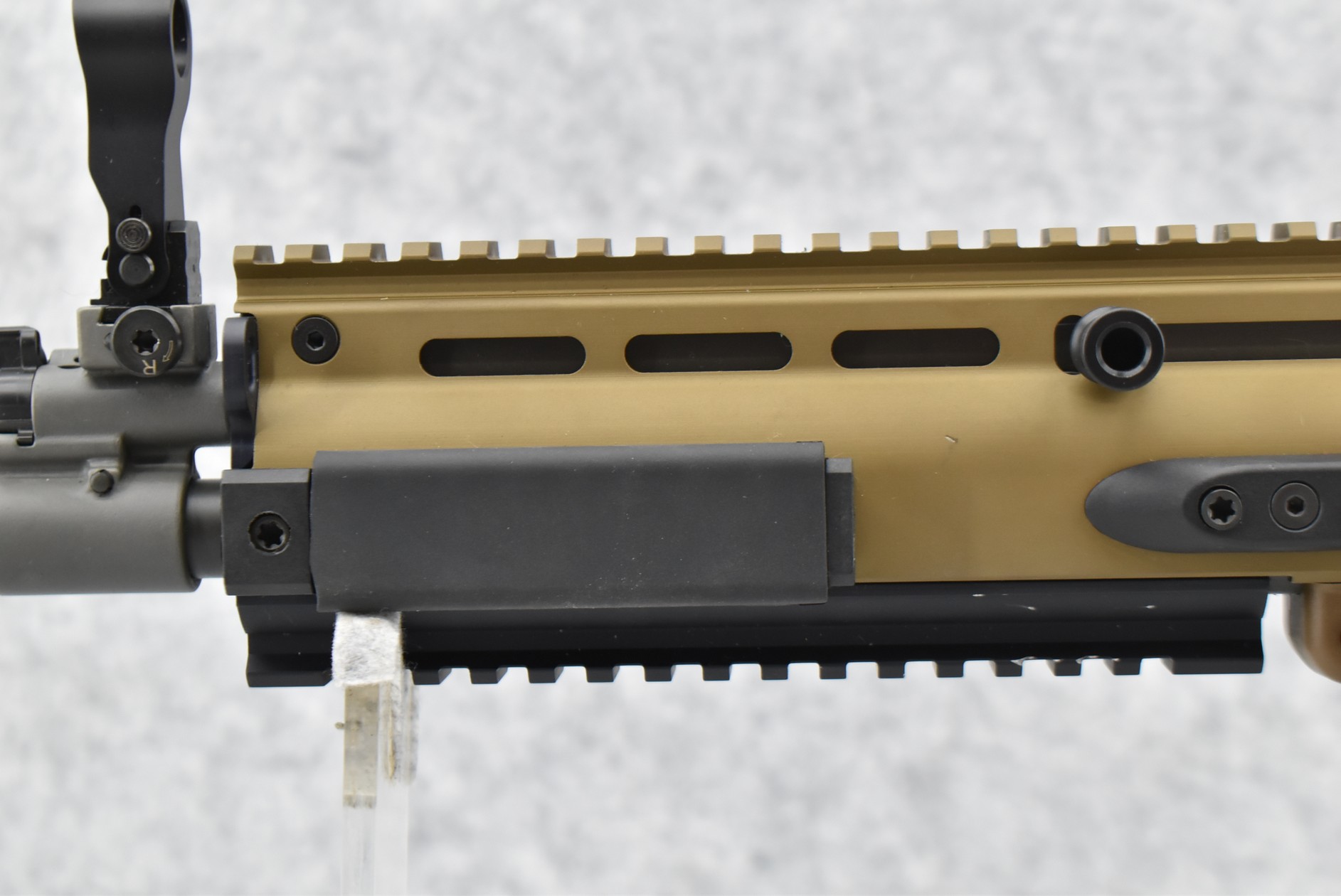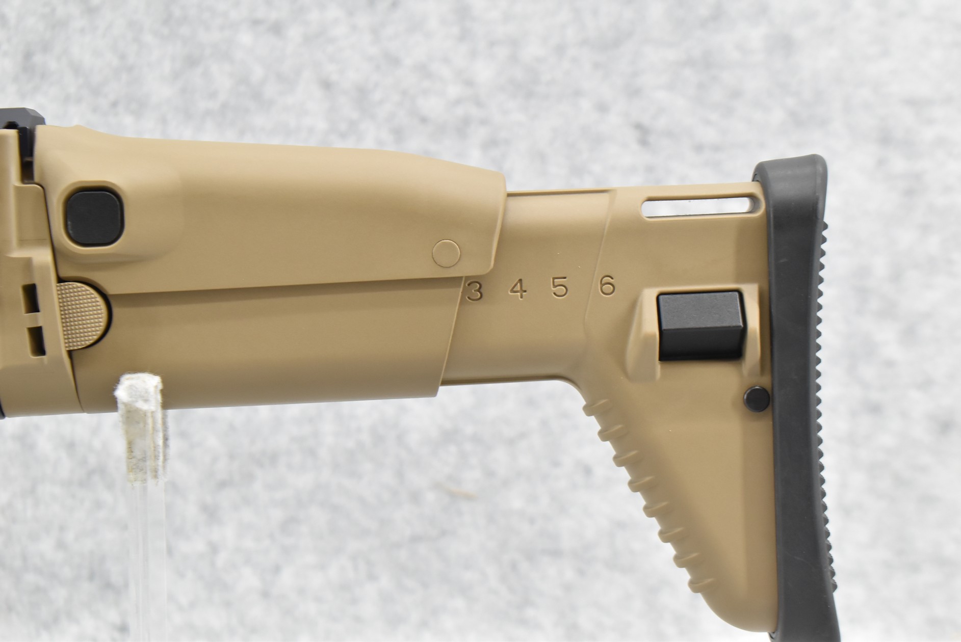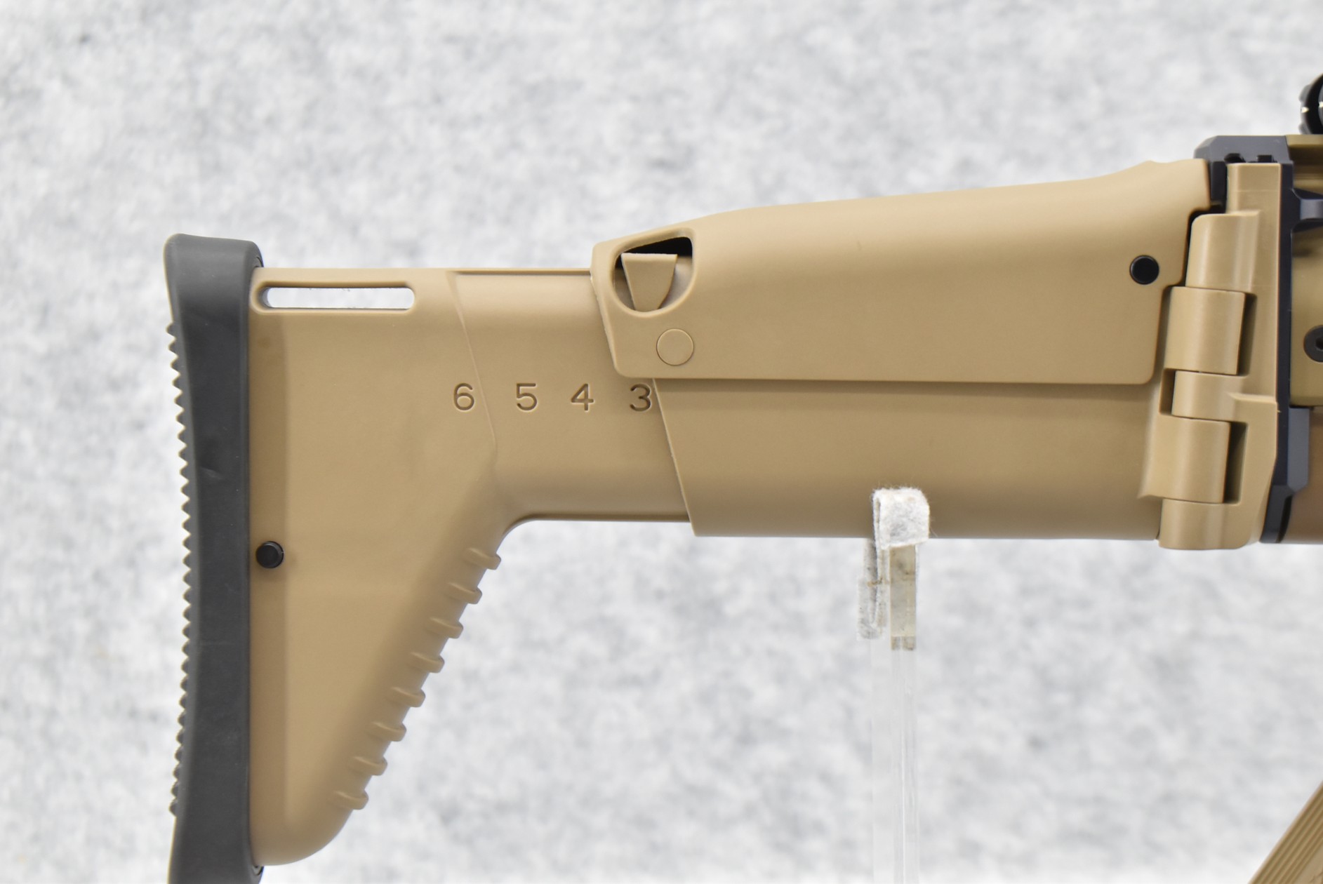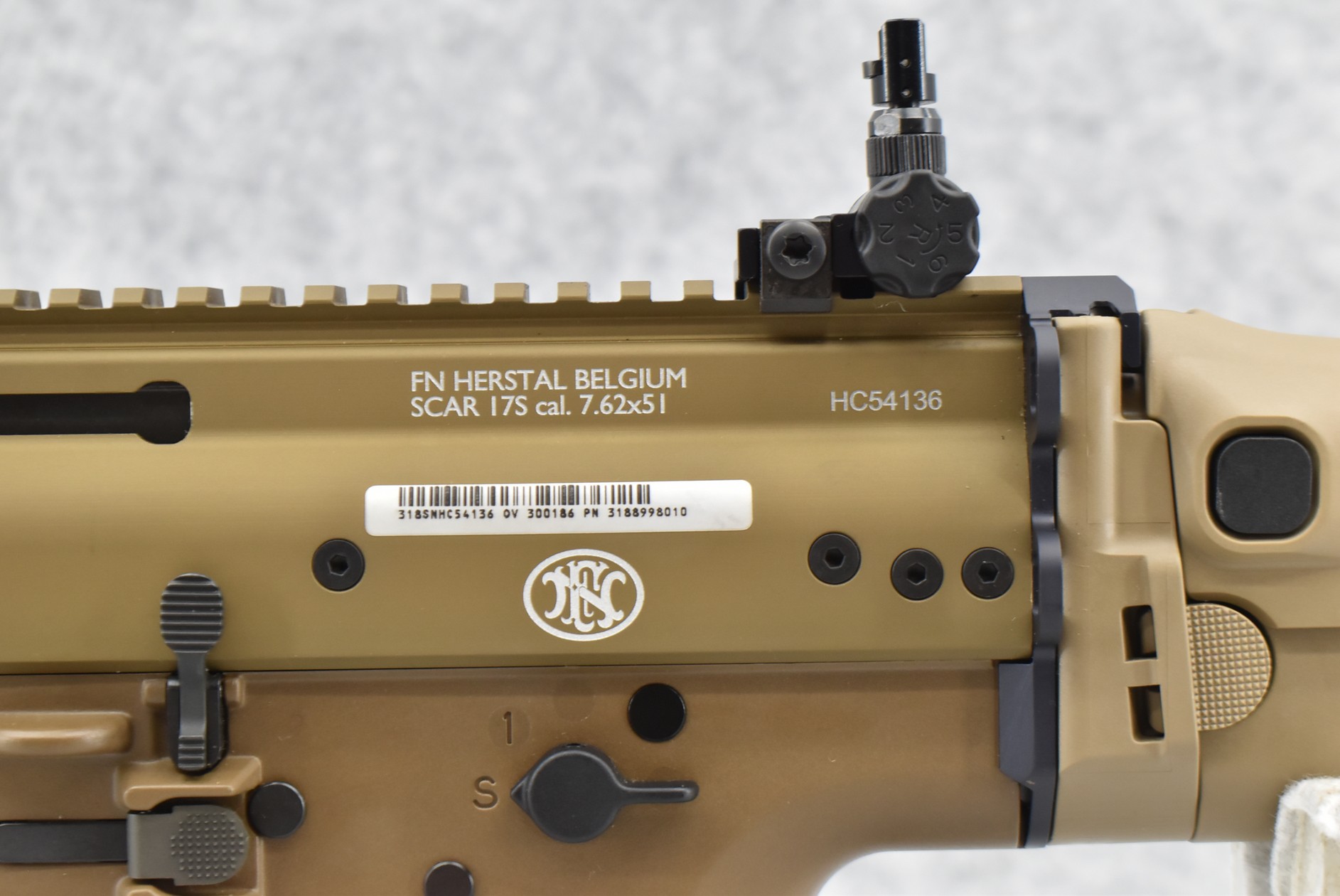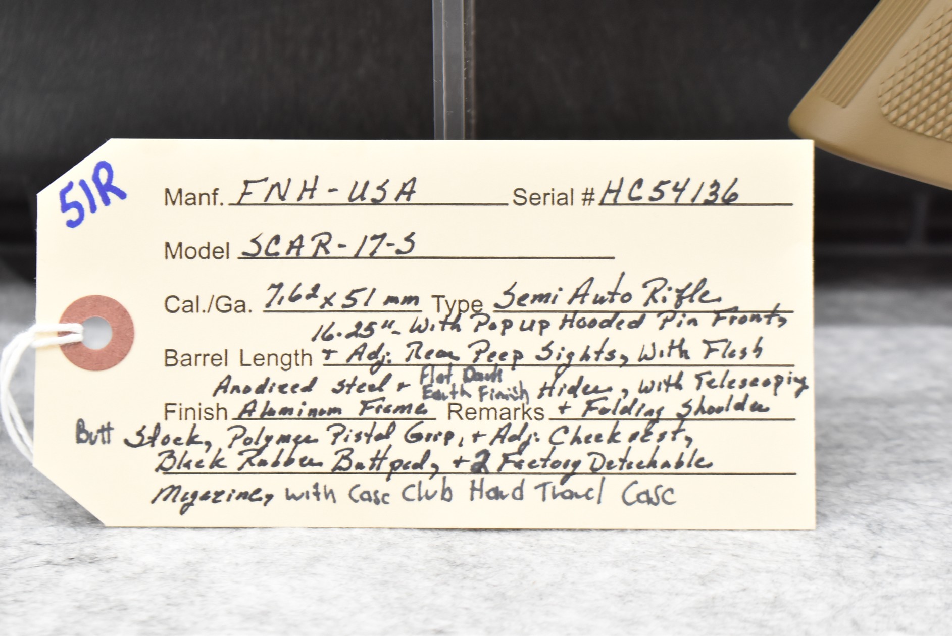 51R. FNH-USA – Mod. Scar-17-S – 7.62x51mm Cal. Semi-Auto Rifle – w/16.25” Barrel w/Pop Up Hooded Pin Front & Adj. Rear Peep Sights w/Flash Hider – Anodized Steel & Flat Dark Earth Finish Aluminum Frame – w/Telescoping & Folding Shoulder Butt Stock, Polymer Pistol Grip & Adj. Cheek Piece w/Butt Pad – w/2 Factory Detachable Magazines – w/Case Club Hard Travel Case (CANNOT GO TO MARYLAND!)