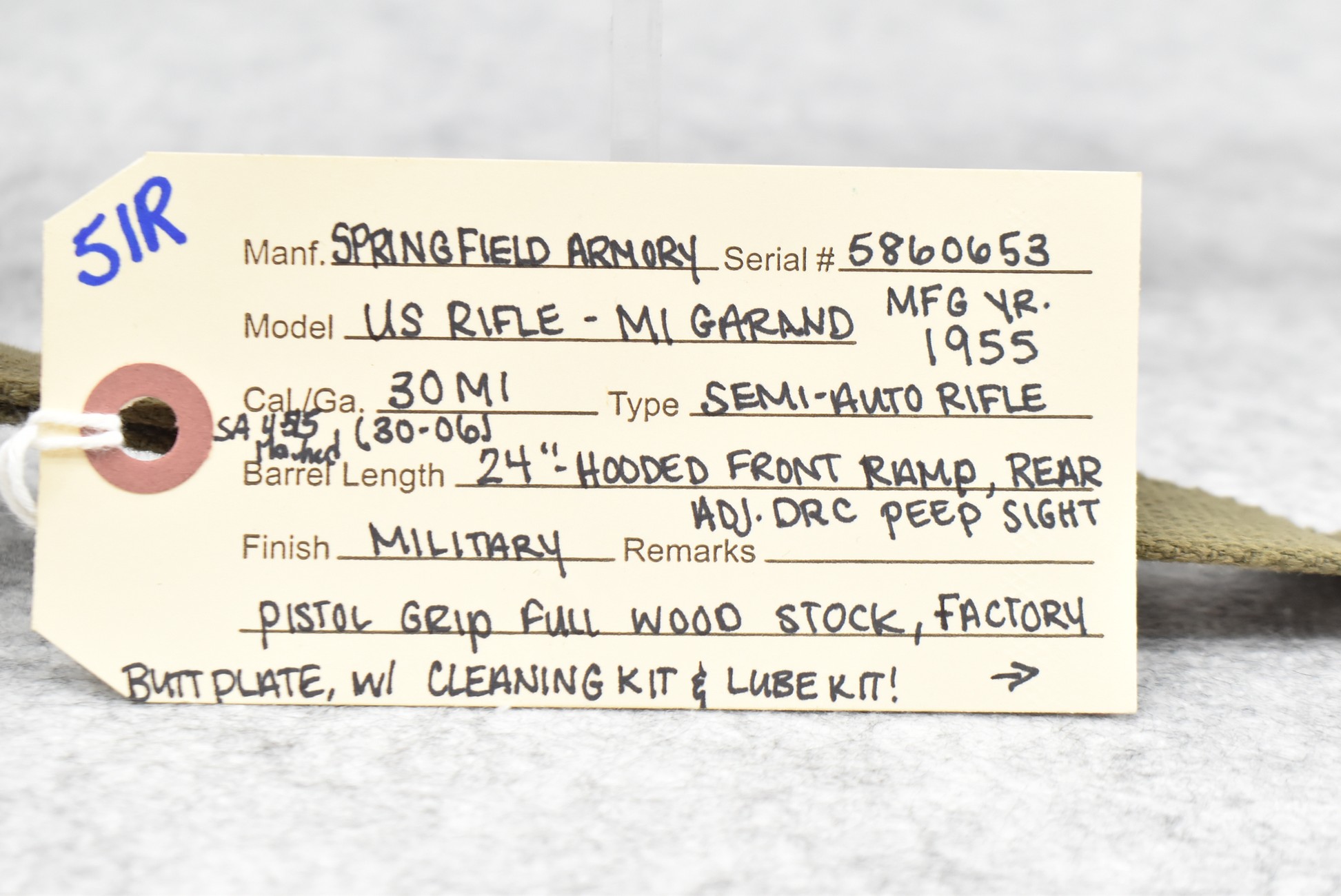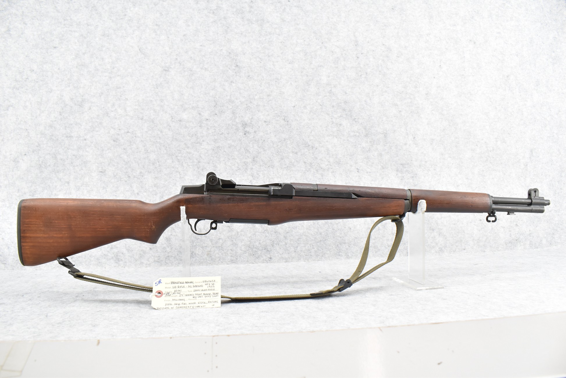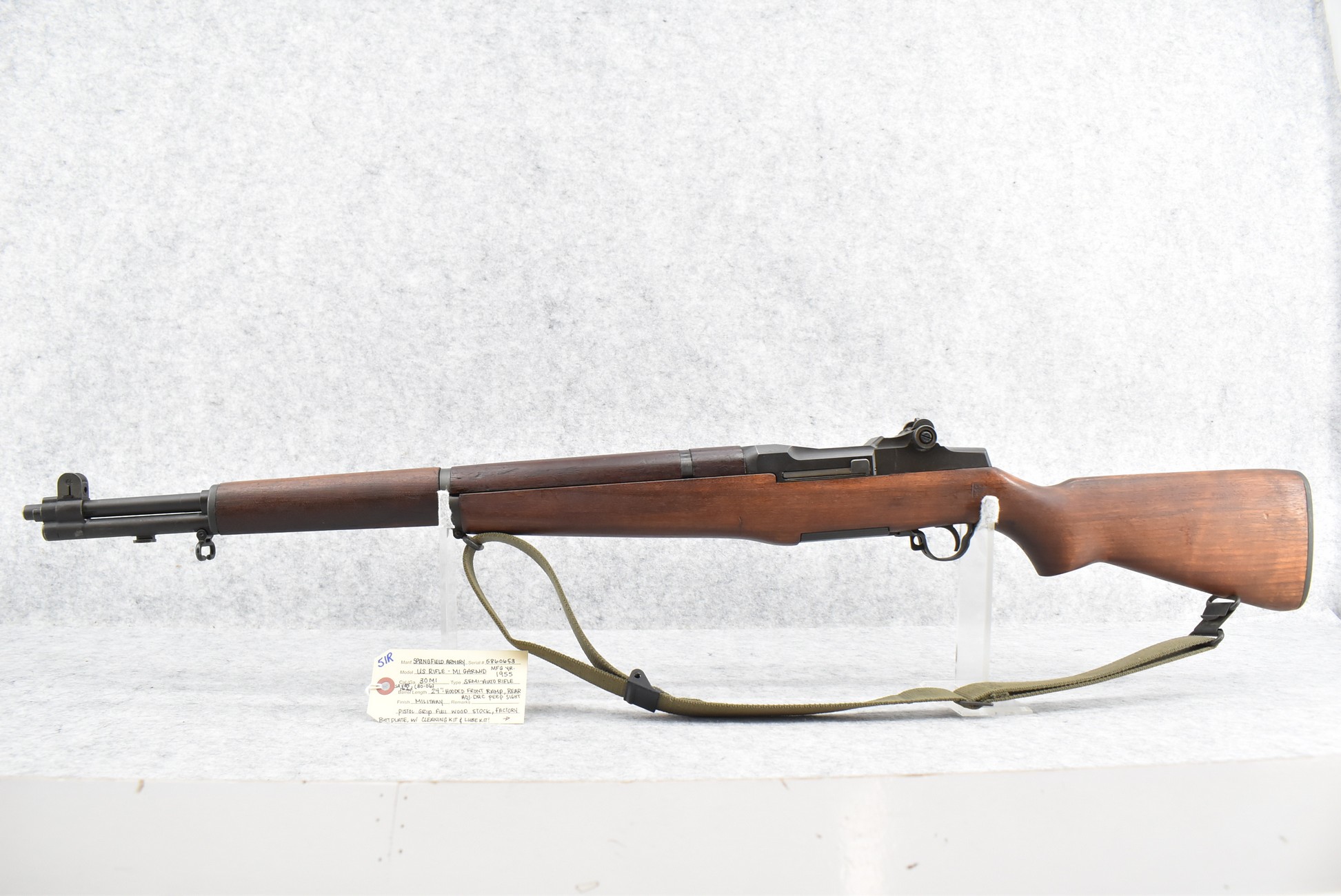 51R. Springfield Armory – Mod. U.S. Rifle M1 Garand – 30 M1 (30-06) Cal. Semi-Auto Rifle – w/24” SA 4/55 Dated Barrel w/Hooded Ramp Front and Adjustable Rear DRC Peep Sights – Military Finish – w/Pistol Grip Full Wood Stock w/Factory Butt Plate – w/Military Sling – w/Cleaning Rod and Tool in Butt