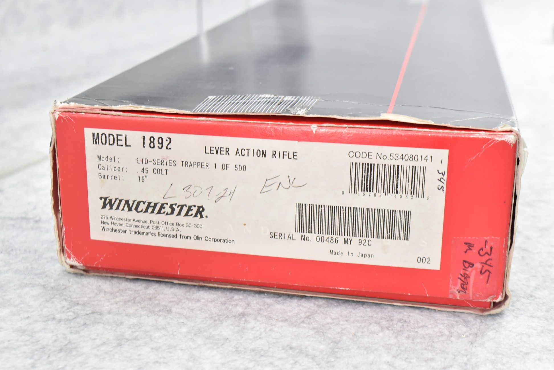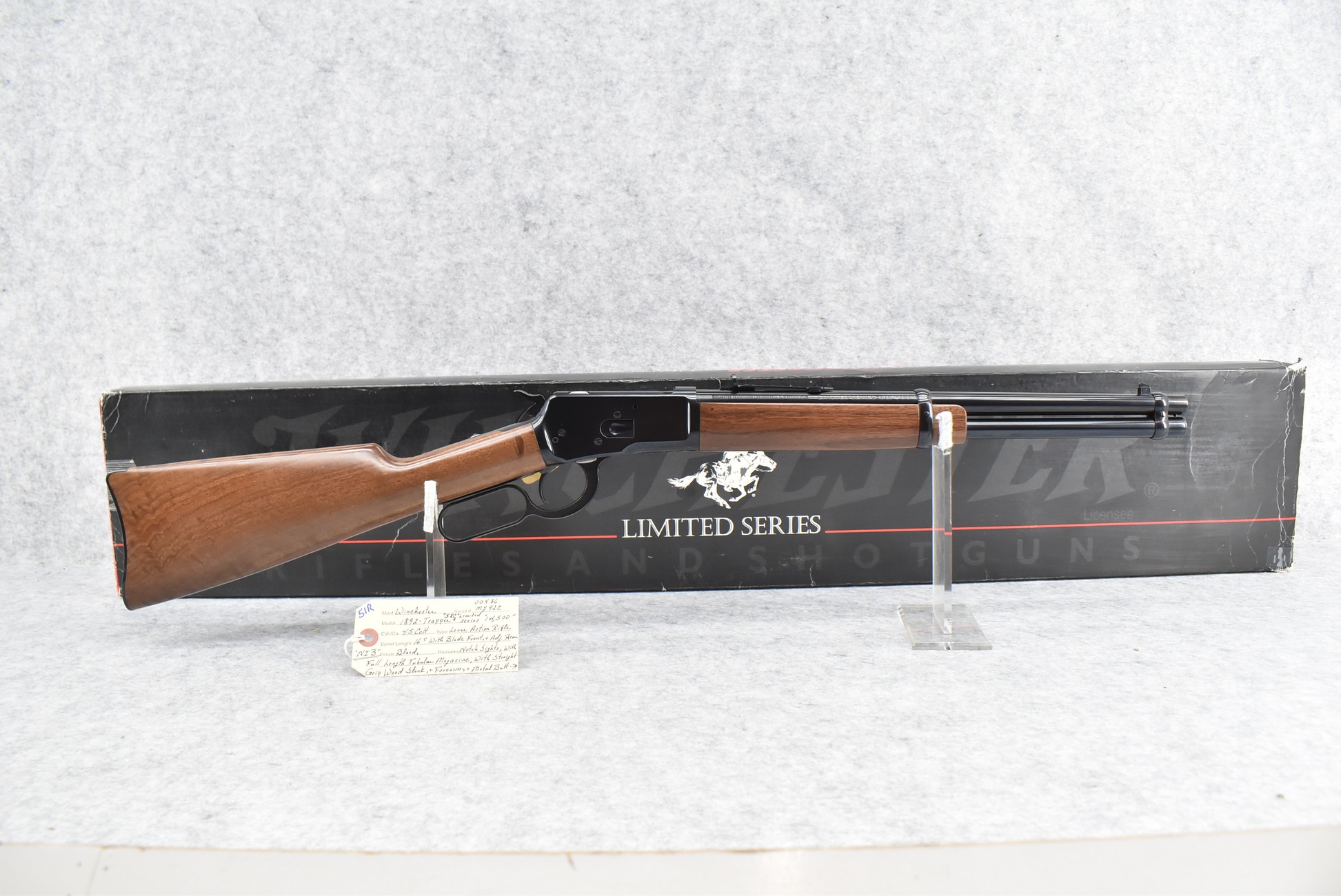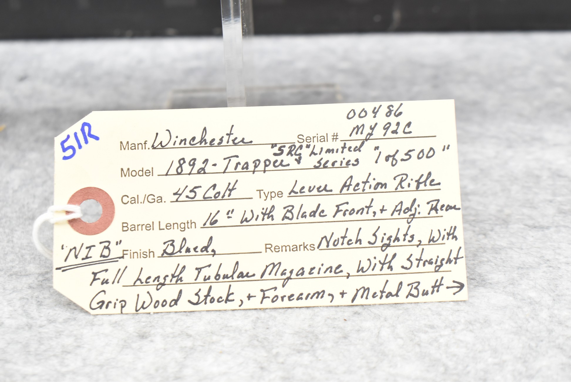 51R. Winchester – Mod. 1892 Trapper “SRC” Limited Series 1 of 500 – 45 Colt Cal. Lever Action Rifle – w/16” Barrel w/Blade Front and Adjustable Rear Notch Sights – Blued Finish – w/Straight Grip Wood Stock and Forearm w/Metal Butt Plate – w/Full Length Tubular Magazine – Manufactured 1997-1998 – New in Factory Box w/Manual and Accessories