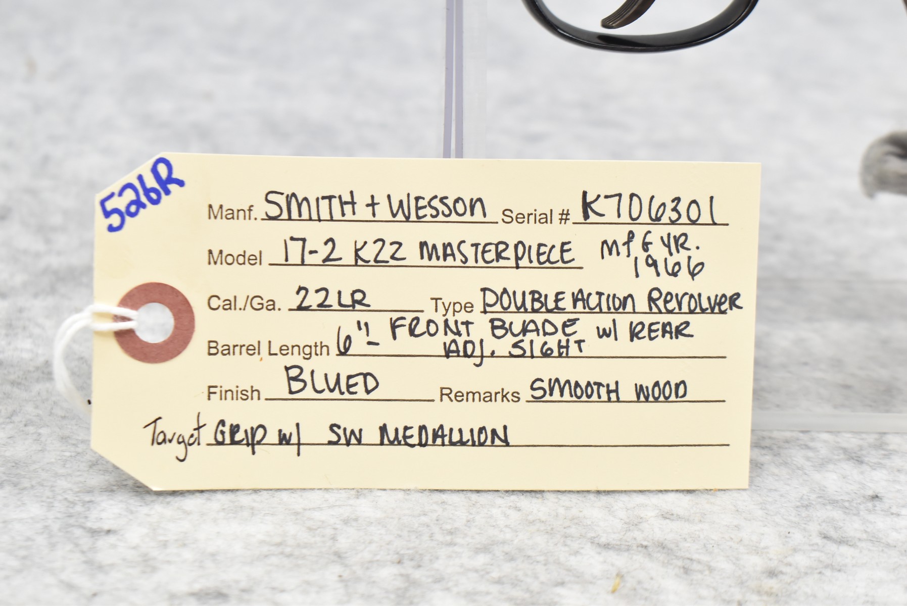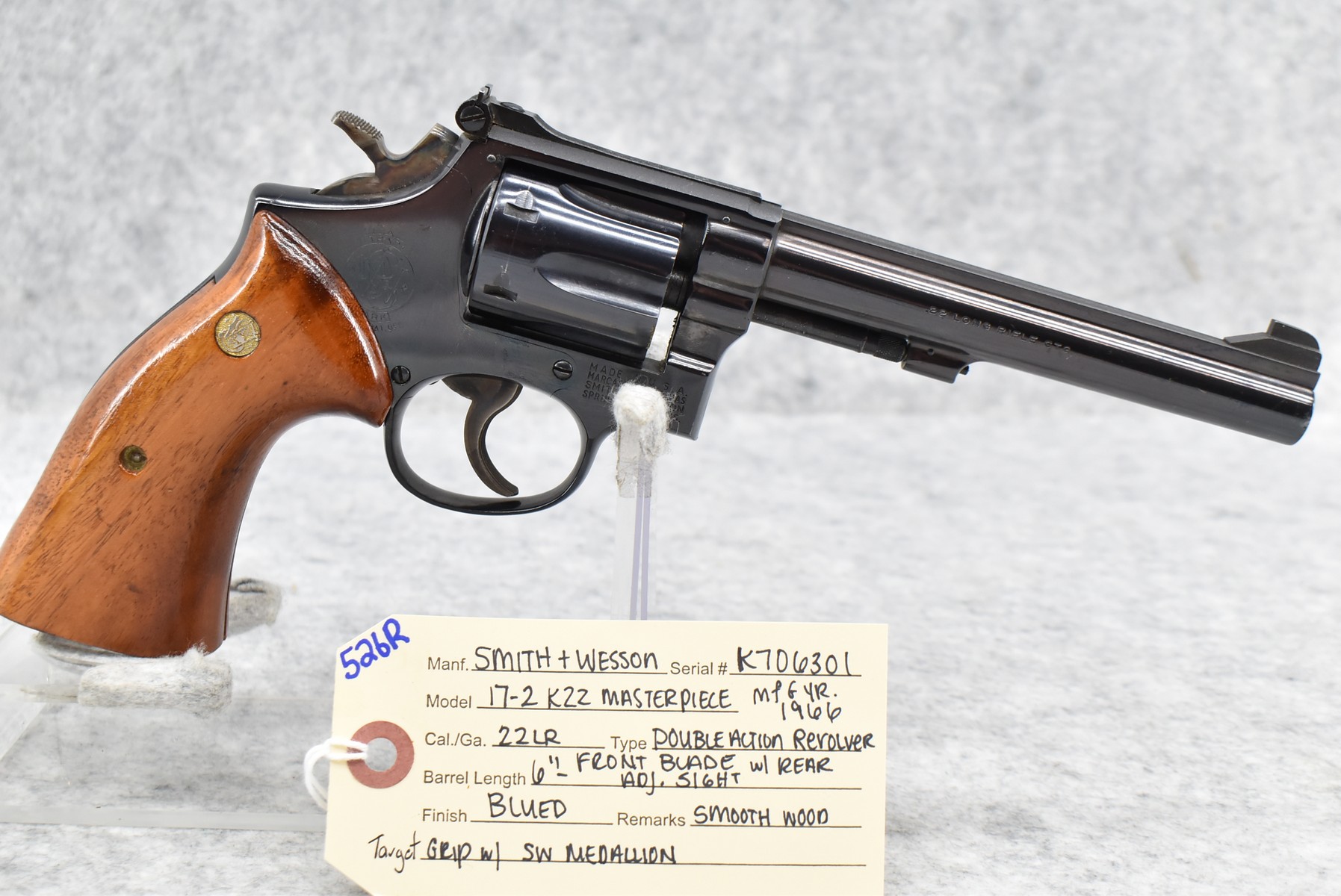 526R. Smith & Wesson – Mod. 17-2 K22 Masterpiece – 22LR Cal. Double Action Revolver – w/6” Barrel w/Front Blade & Rear Adj. Sights – Blued Finish – w/Smooth Wood Target Grip w/S&W Medallion