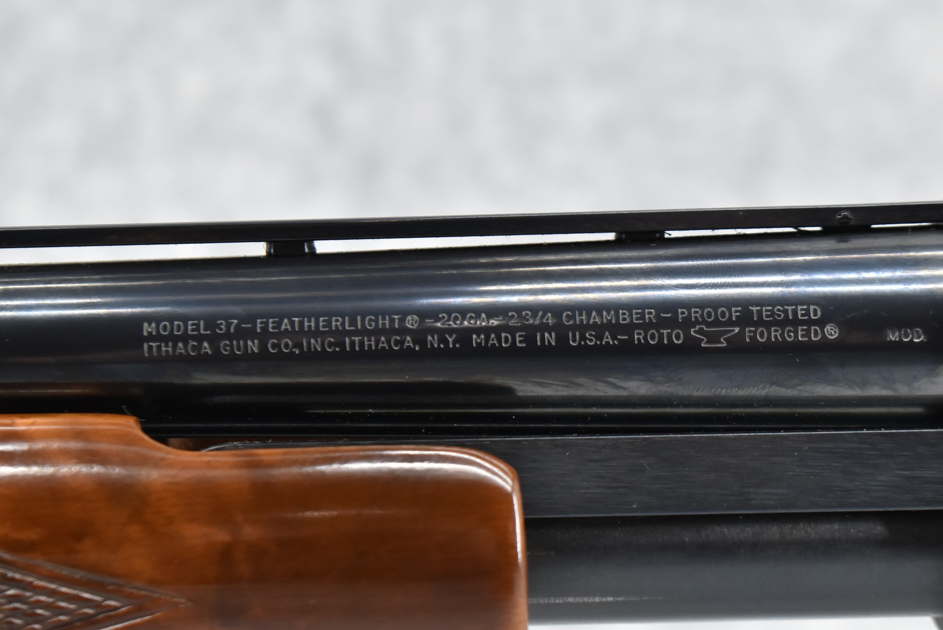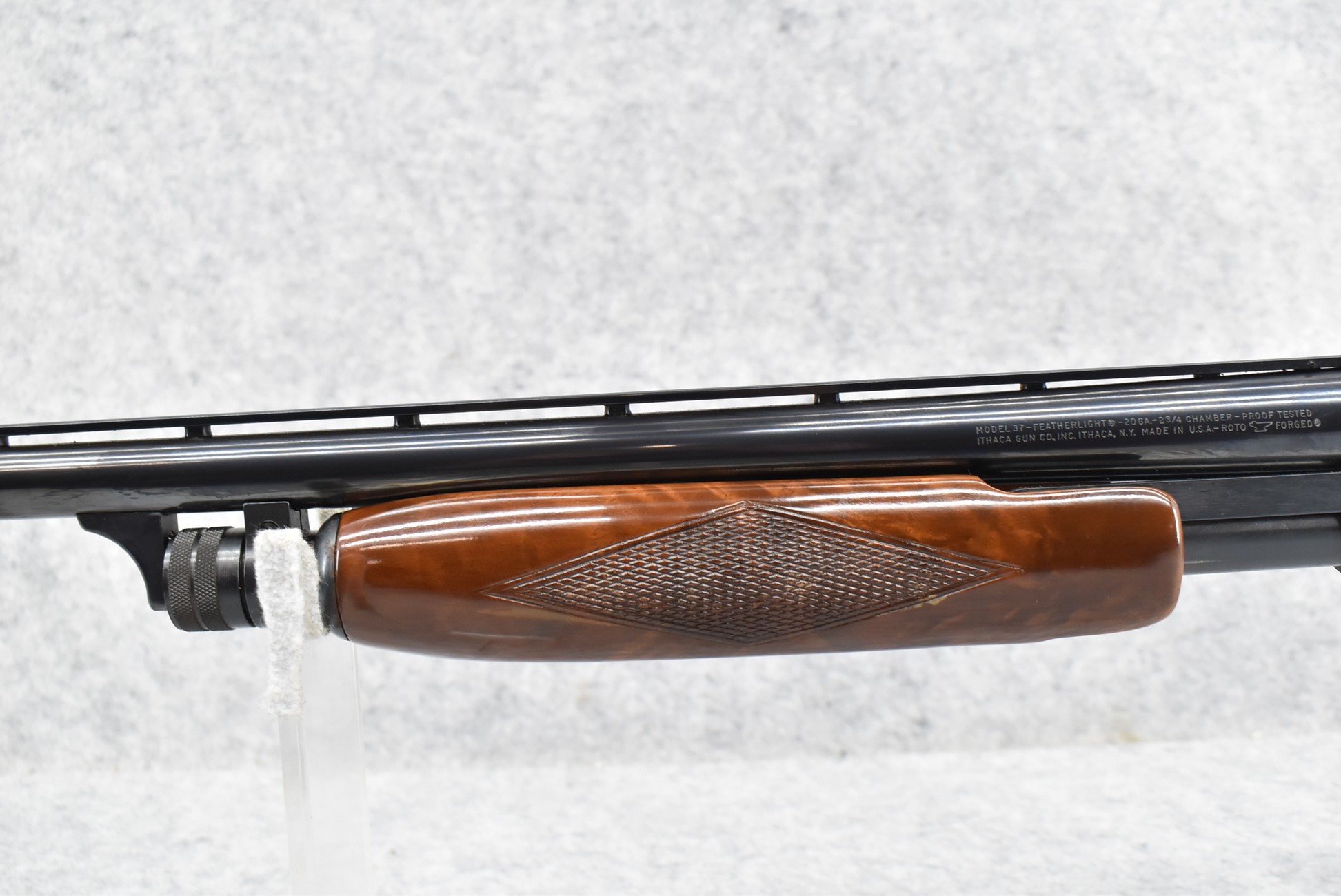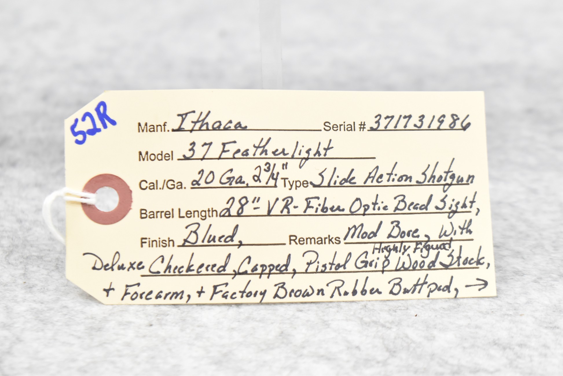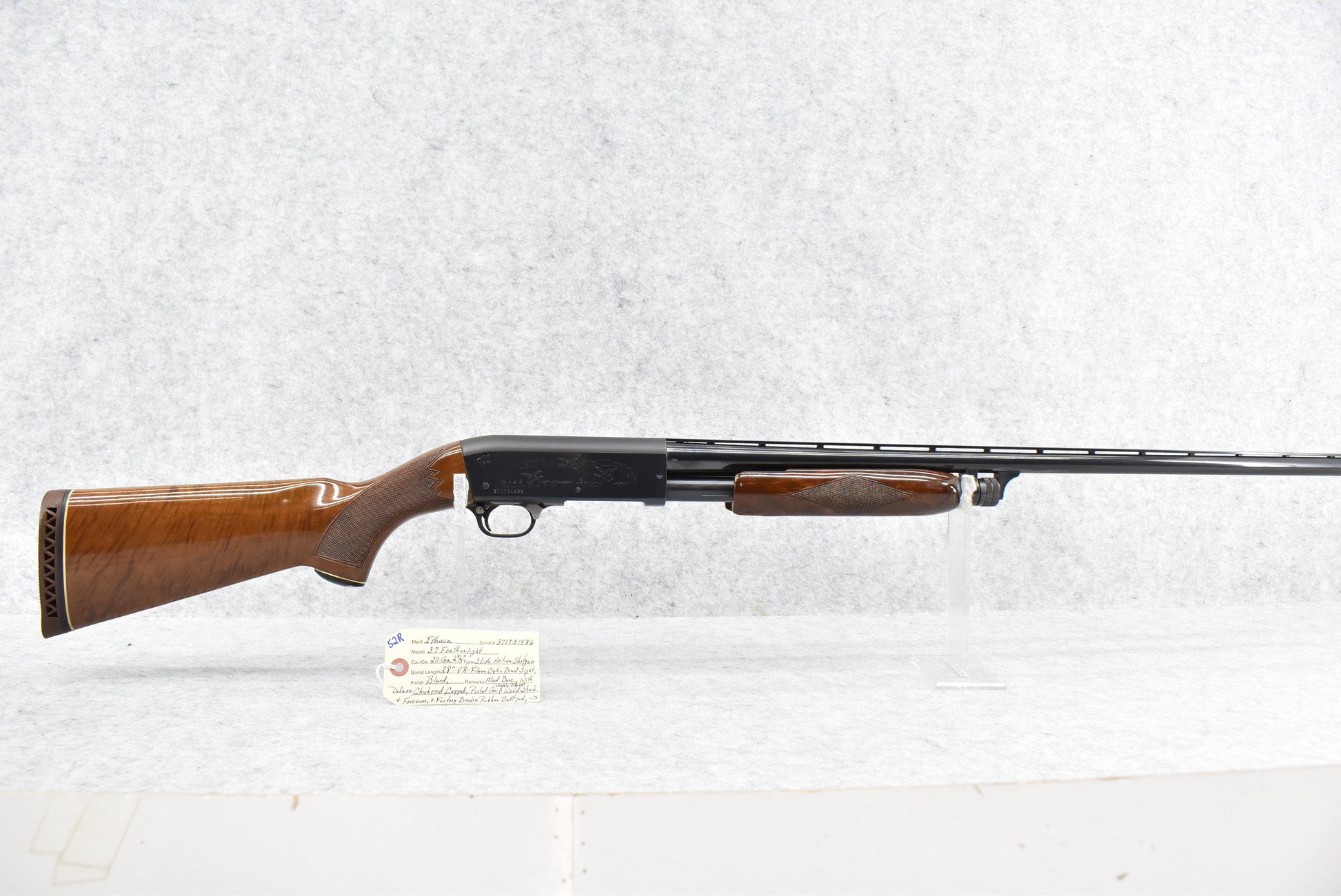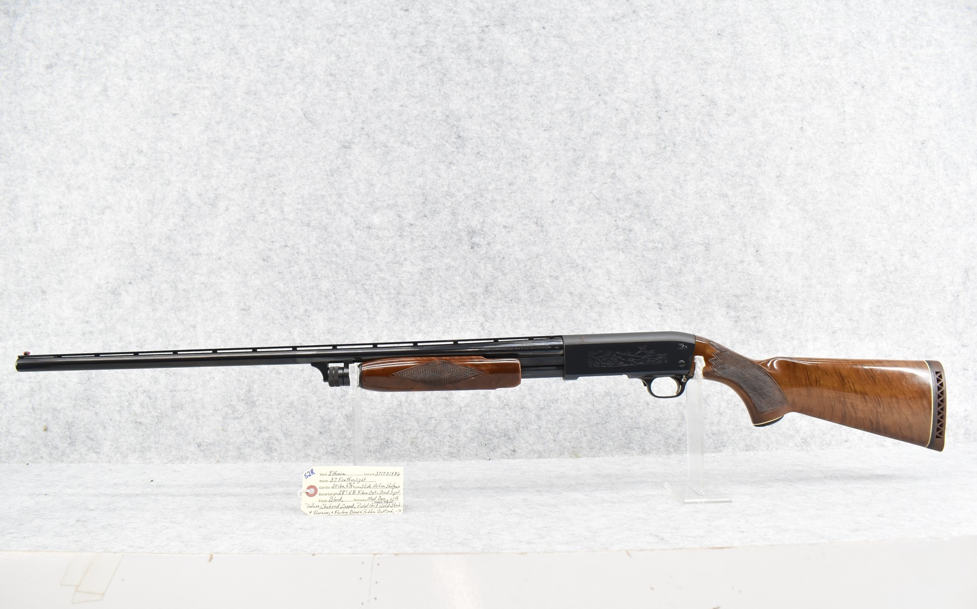 52R.       Ithaca – Mod. 37 Featherlight – 20ga. 2 ¾” Pump Action Shotgun – w/28” Mod. Choke, Vent-Rib Barrel w/Fiber Optic Bead Sight – Blued Finish – w/Engraved Receiver on Both Sides – w/Deluxe Checkered Capped Pistol Grip Highly Figured Wood Stocks w/Factory Butt Pad