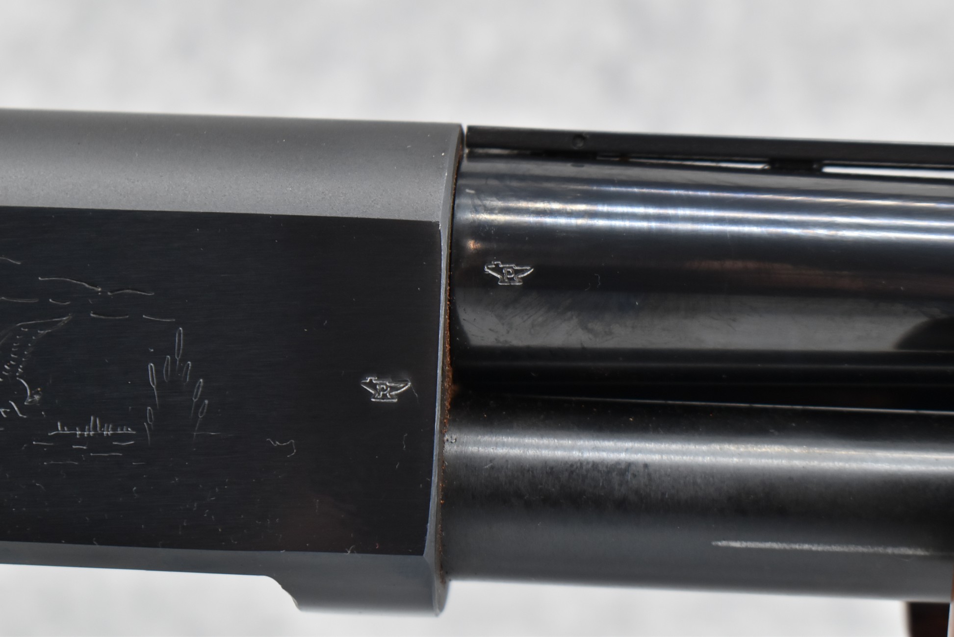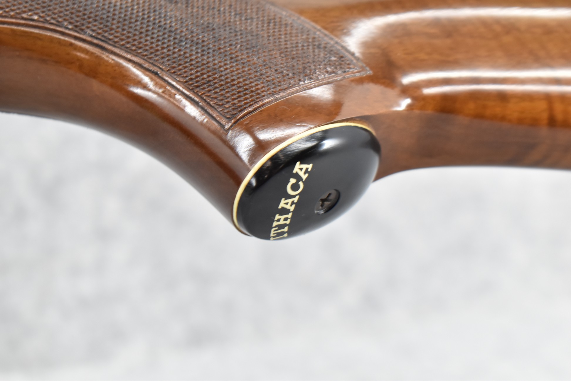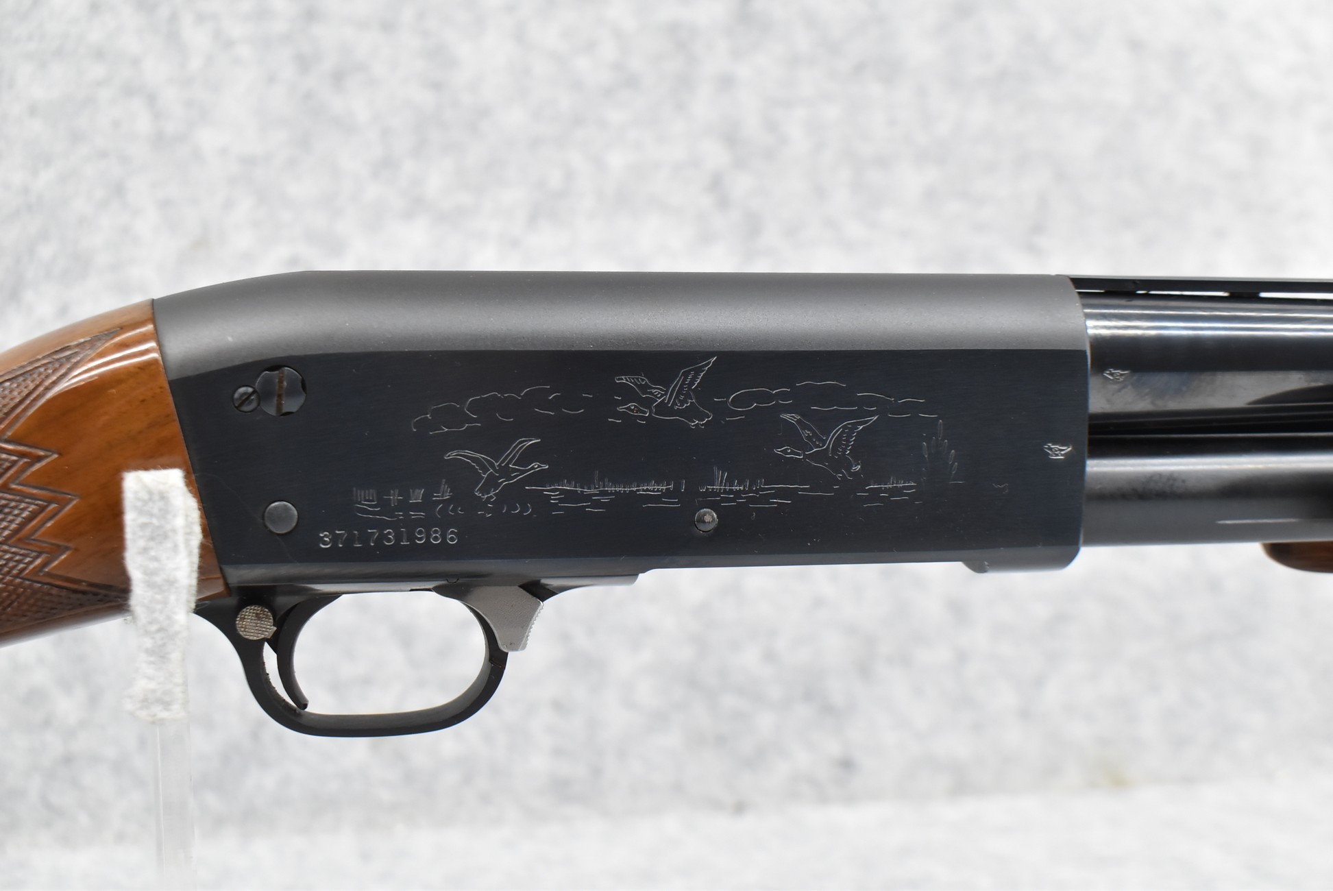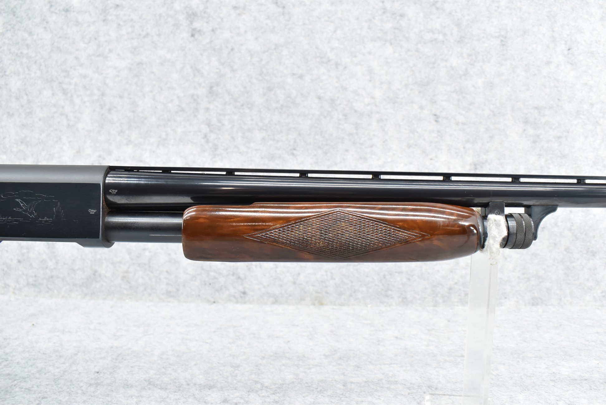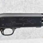 52R.       Ithaca – Mod. 37 Featherlight – 20ga. 2 ¾” Pump Action Shotgun – w/28” Mod. Choke, Vent-Rib Barrel w/Fiber Optic Bead Sight – Blued Finish – w/Engraved Receiver on Both Sides – w/Deluxe Checkered Capped Pistol Grip Highly Figured Wood Stocks w/Factory Butt Pad