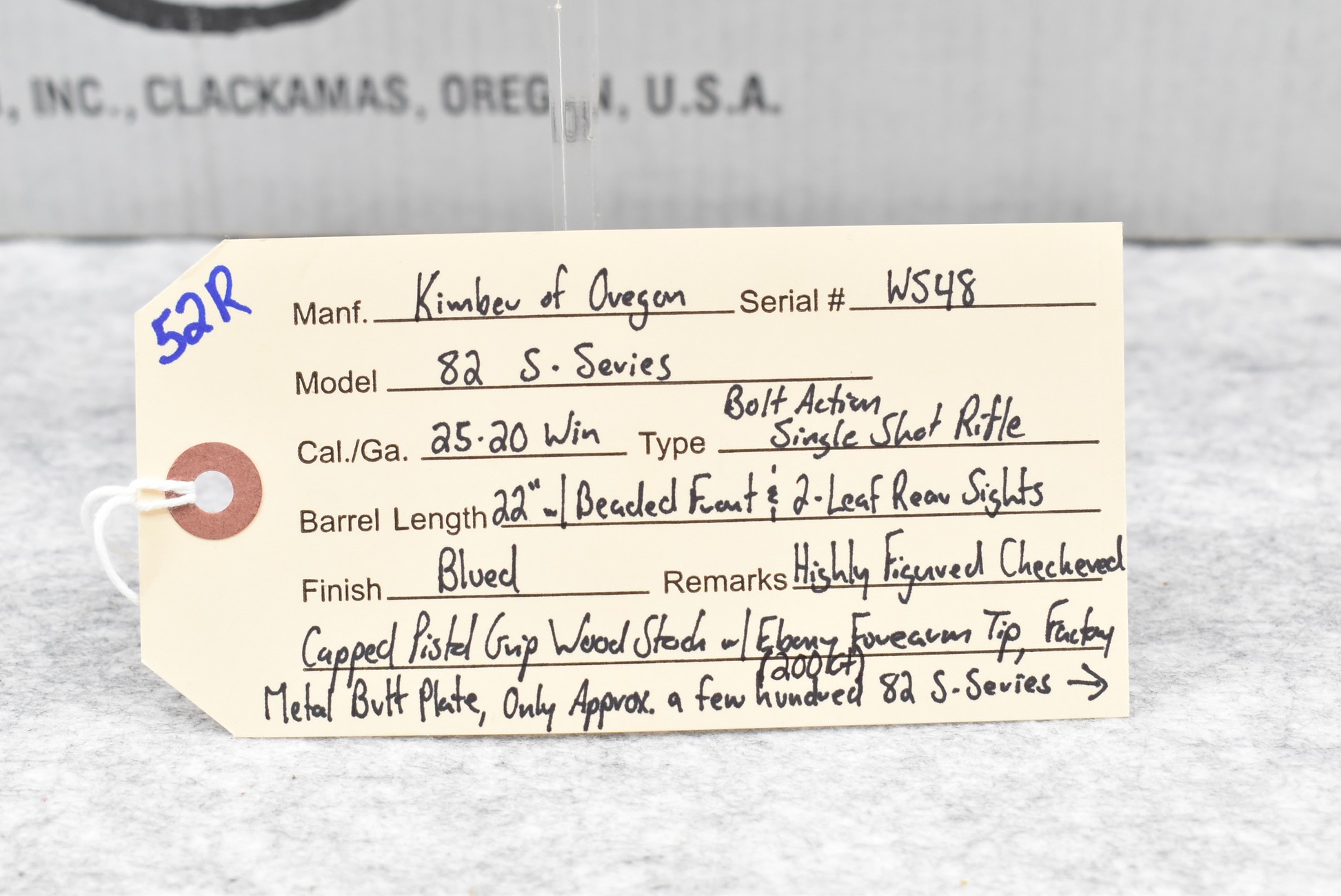 52R. Kimber of Oregon – Mod. 82 S-Series – 25-20 Win. Cal. Single Shot Bolt Action Rifle – w/22” Barrel w/Beaded Front and 2-Leaf Rear Sights – Blued Finish – w/Highly Figured Checkered Capped Pistol Grip Wood Stock w/Ebony Forearm Tip and Factory Metal Butt Plate – Unfired w/Factory Box and Manual – Only Approximately 200 Mod. 82 S-Series were Manufactured in the 25-20 Caliber! Great Find!