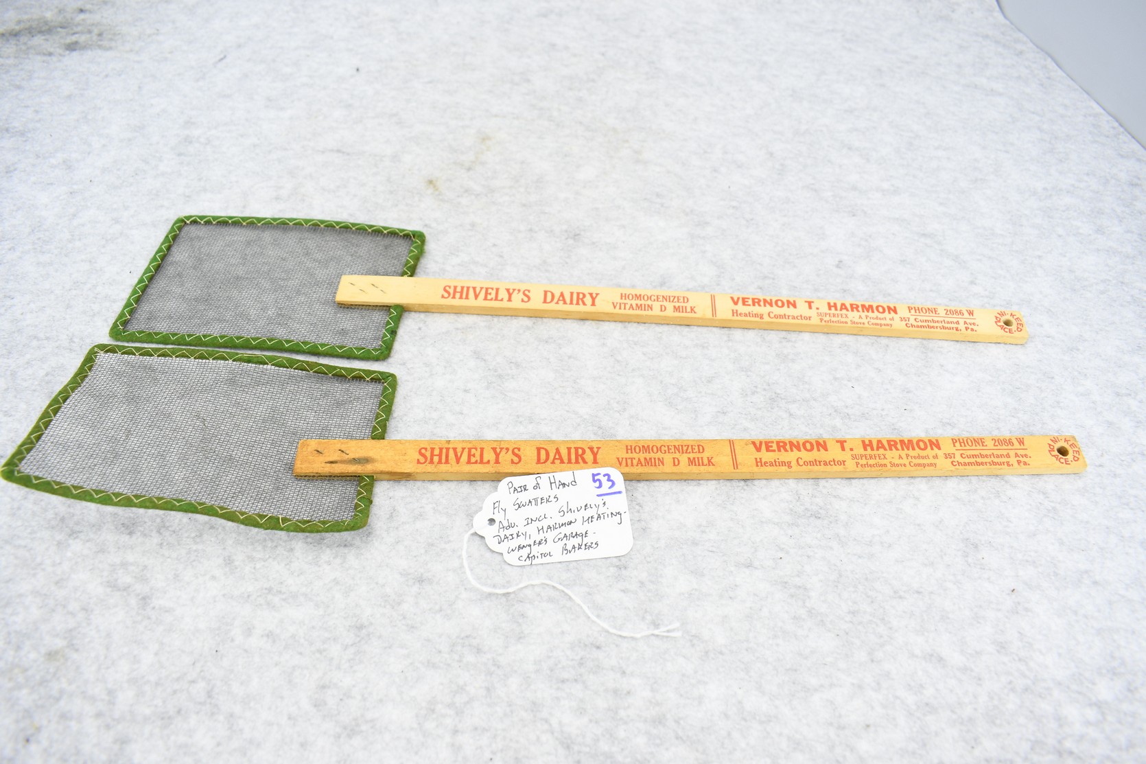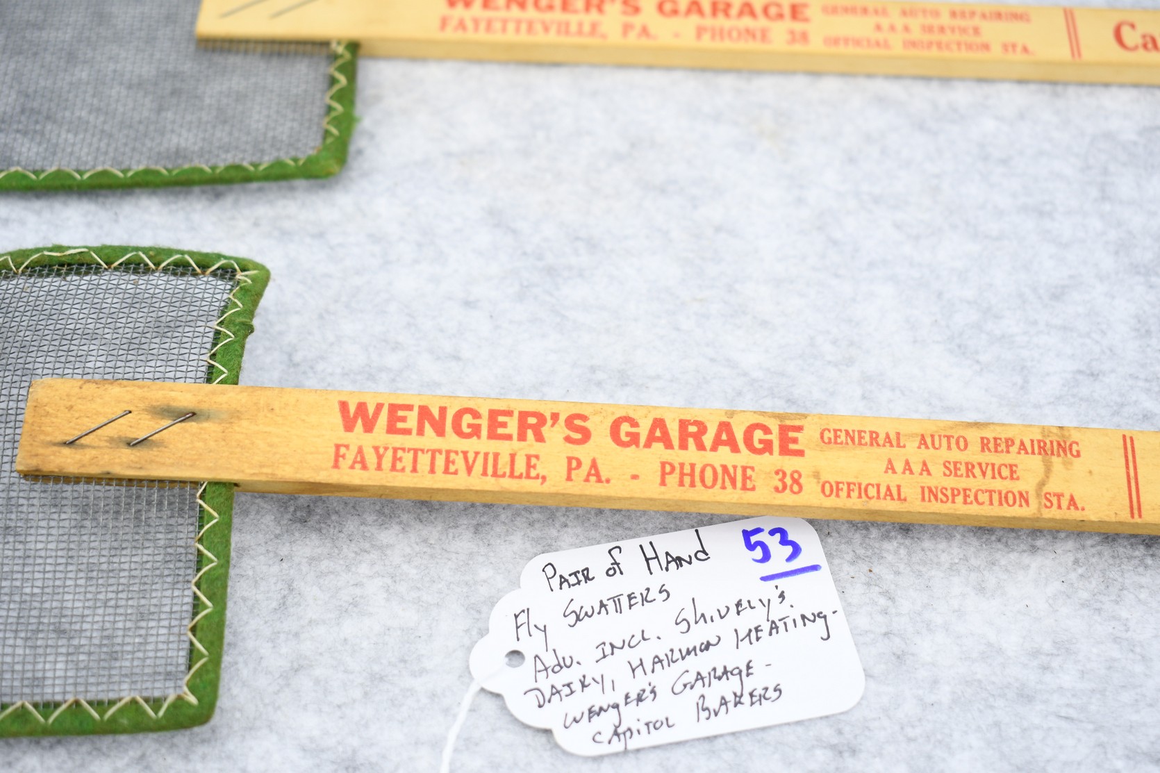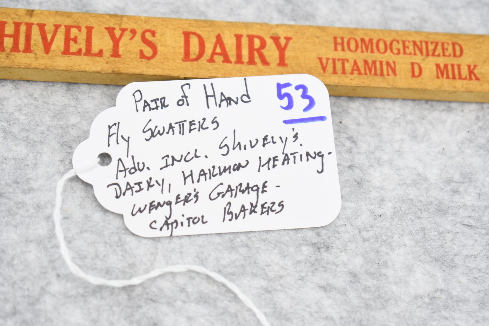 53. Pair of Shively’s Dairy Fly Swatters – Other Advertisers Include Vernon Harmon Heating Contractor, Capitol Bakers Inc., and Wenger’s Garage Fayetteville PA – Swatters are Metal Screen w/Green Cloth Border
