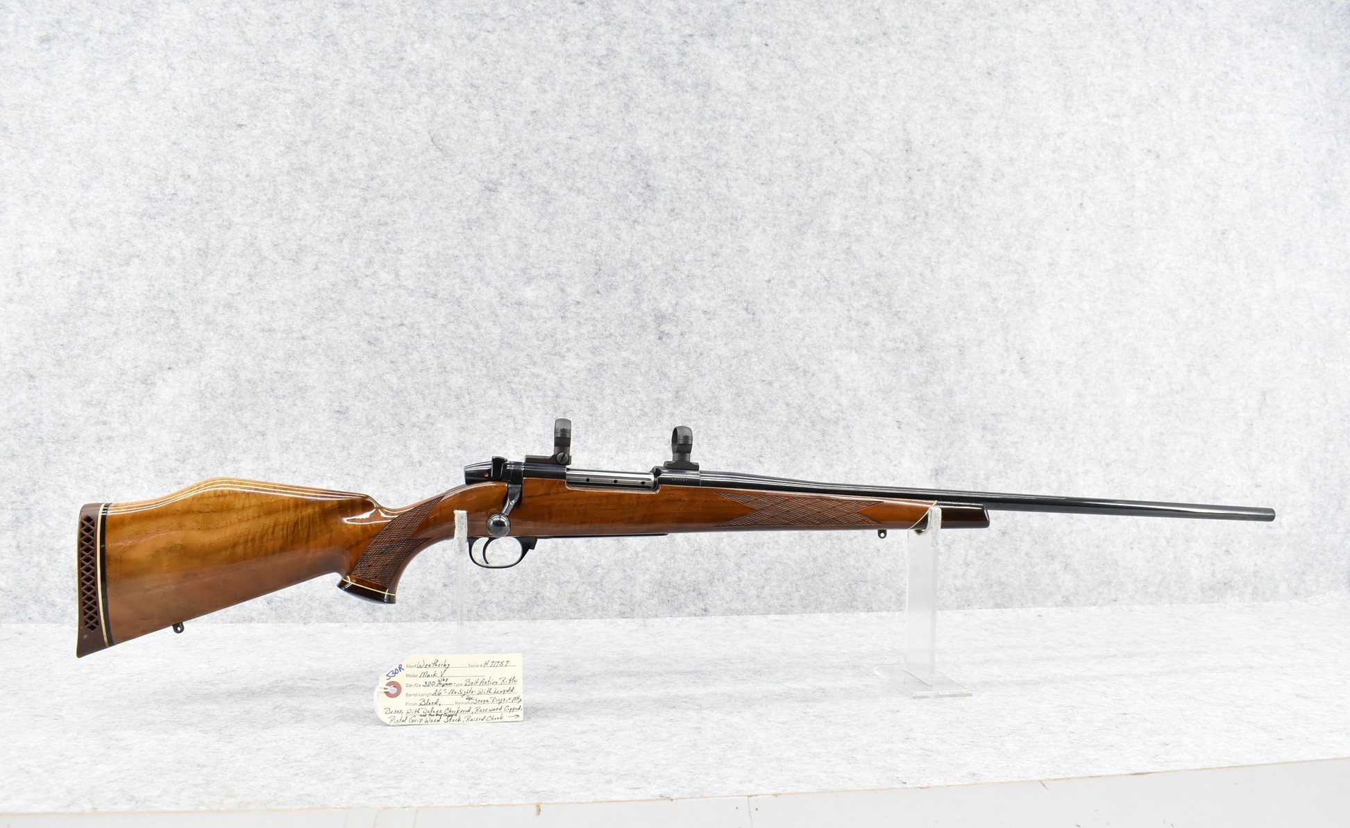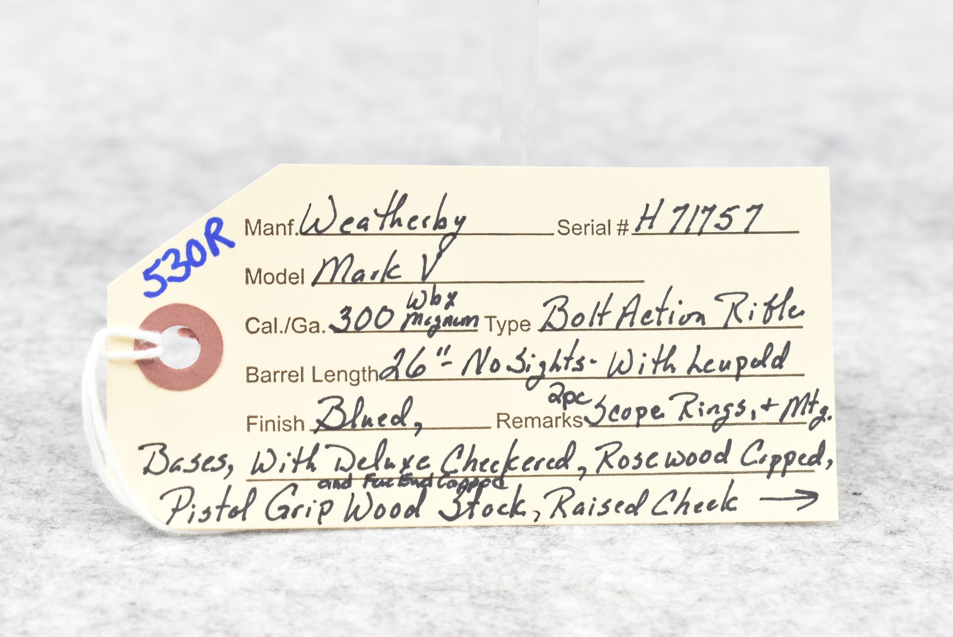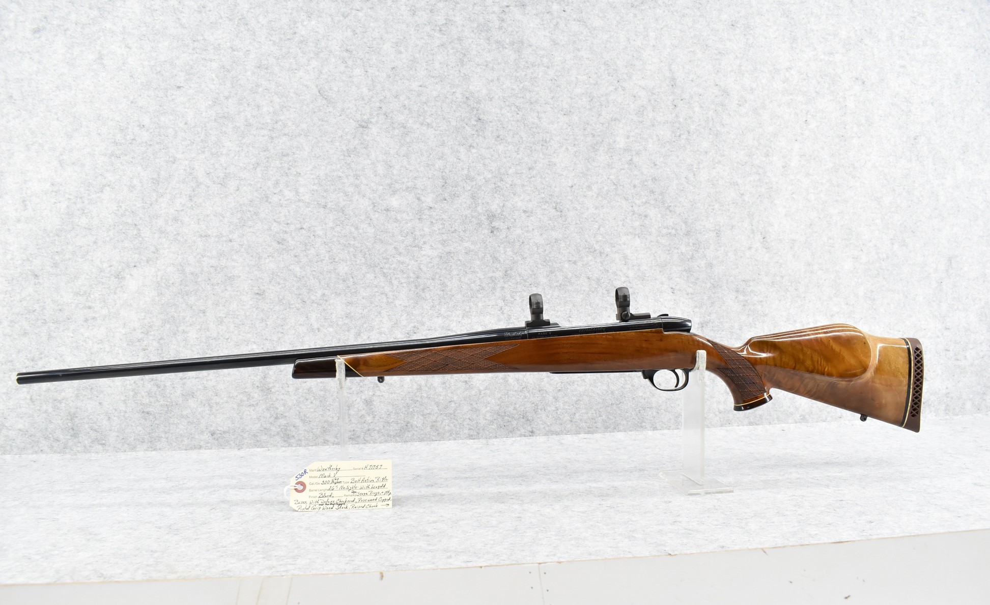 530R. Weatherby – Mod. Mark V – 300 Wby. Mag. Cal. Bolt Action Rifle – w/26” Barrel – Blued Finish – w/Deluxe Checkered Rosewood Capped Pistol Grip & Forend Capped Wood Stock w/Raised Cheek Piece w/Factory Butt Pad – w/Leupold 2pc. Scope Rings & Mounting Bases