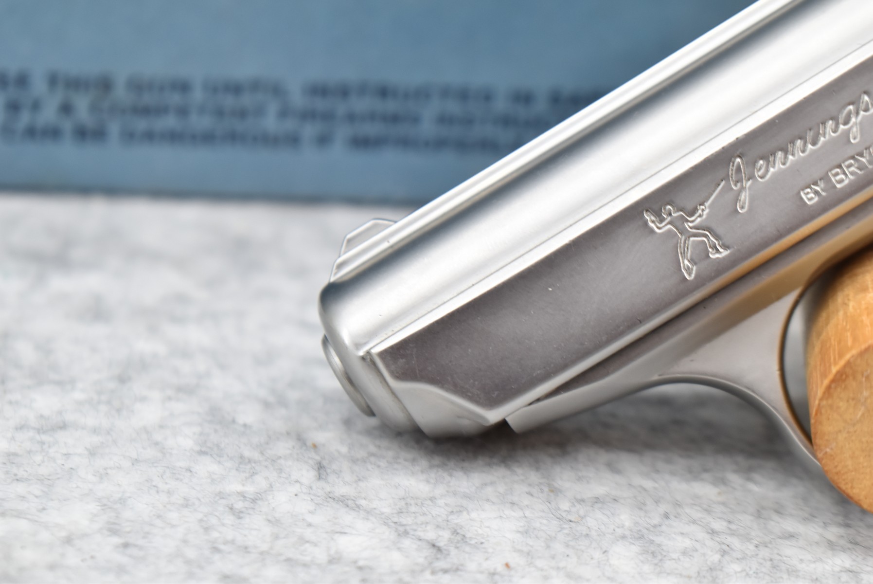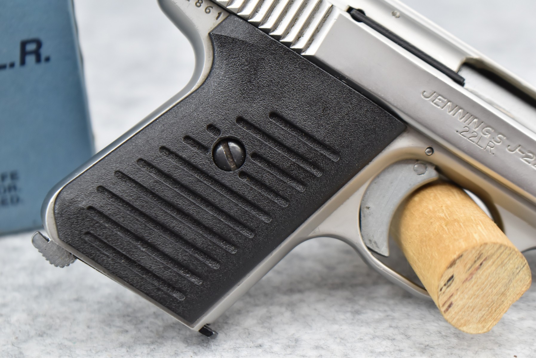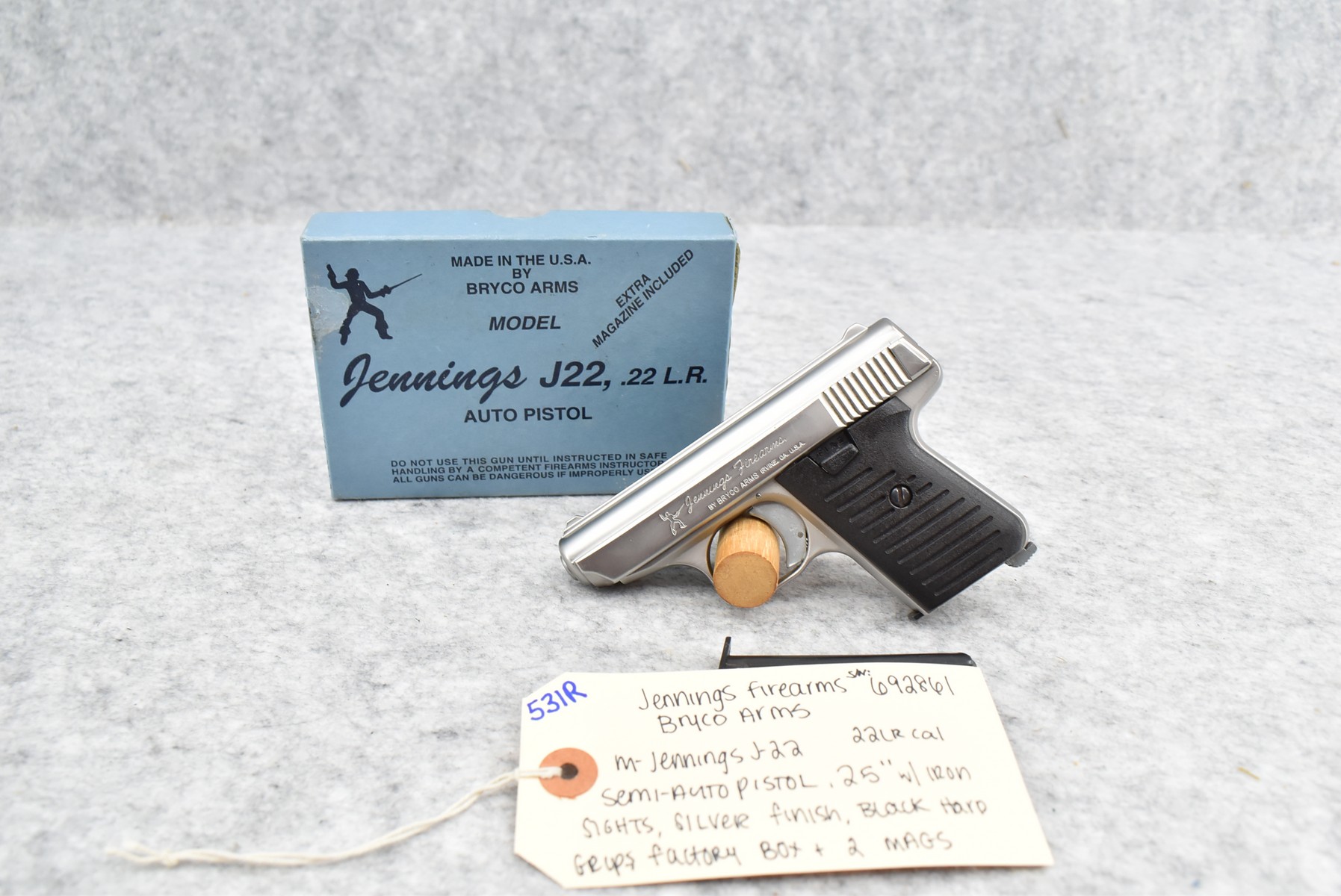 531R. Jennings Firearms/Bryco Arms – Mod. Jennings J-22 – 22LR Cal. Semi-Auto Pistol – w/2.5” Barrel w/Iron Sights – Chrome Finish – w/Black Hard Grips – w/Factory Box & 2 Mags (CANNOT GO TO MARYLAND!)