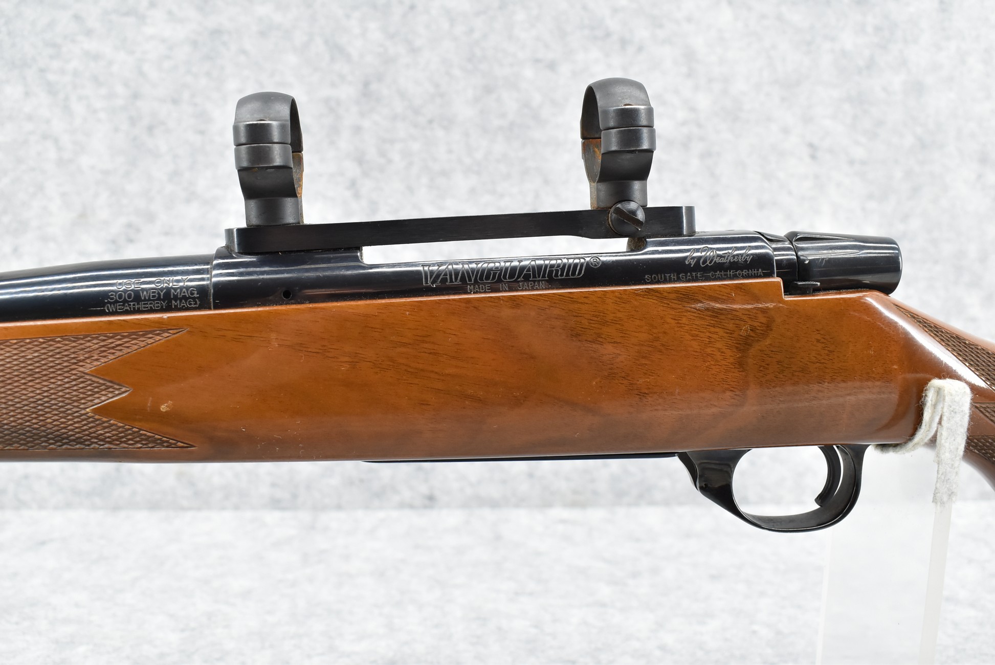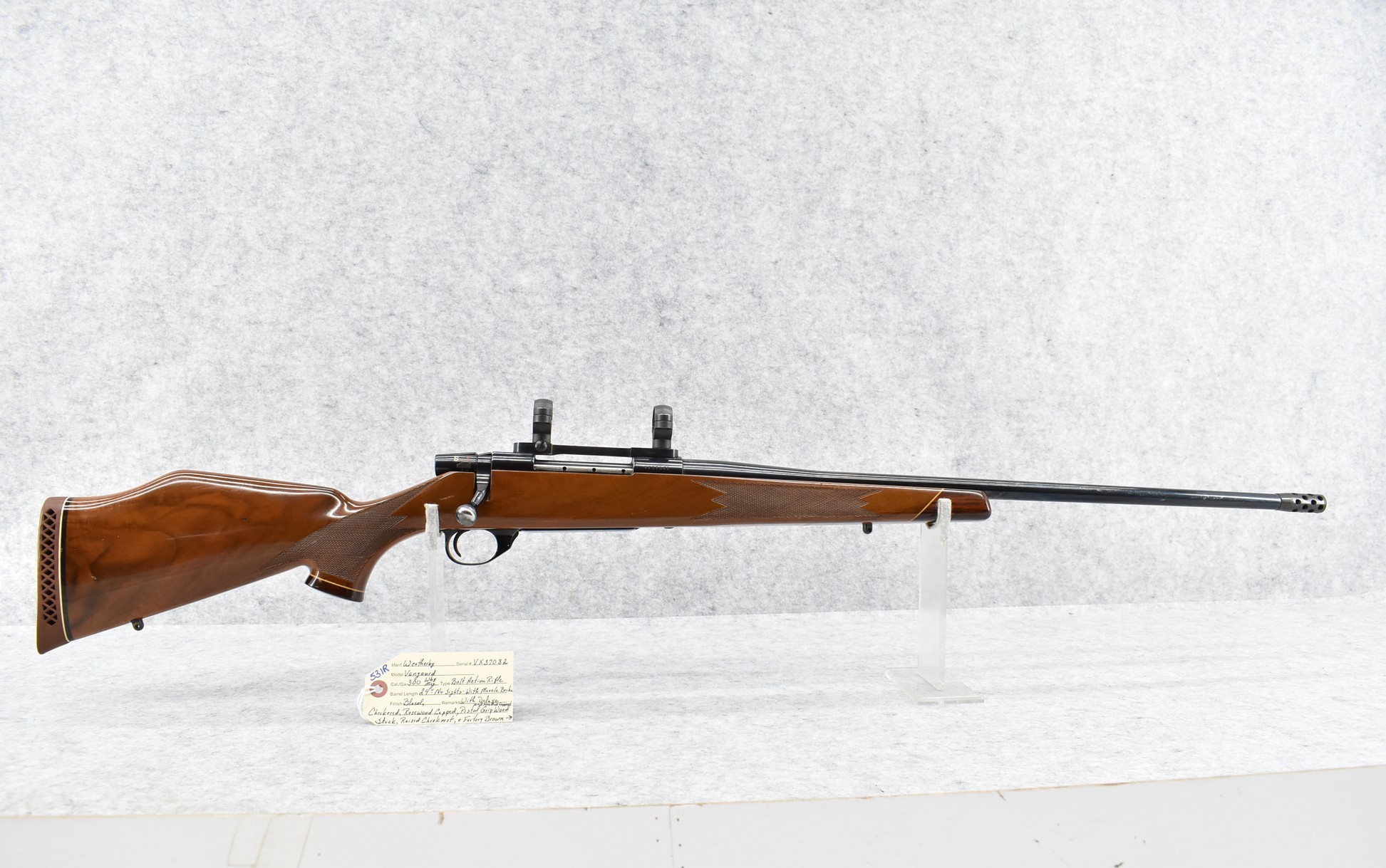 531R. Weatherby – Mod. Vanguard Deluxe – 300 Wby. Mag. Cal. Bolt Action Rifle – w/24” Barrel w/Muzzle Brake – Blued Finish – w/Deluxe Checkered Rosewood Capped & Forend Capped Wood Stock w/Raised Cheek Piece w/Factory Butt Pad – w/Burris Scope Rings & Mount
