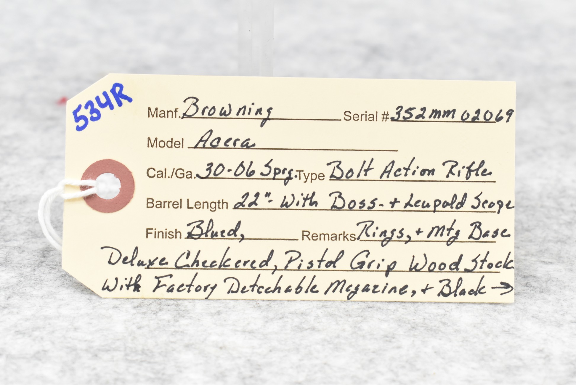 534R Browning – Mod. Acera – 30-06 Sprg. Cal. Bolt Action Rifle – w/22” Barrel w/Boss – Blued Finish – w/Deluxe Checkered Pistol Grip Wood Stock w/Limb Saver Butt Pad – w/Factory Detachable Mag – w/Leupold Scope Rings & Bases