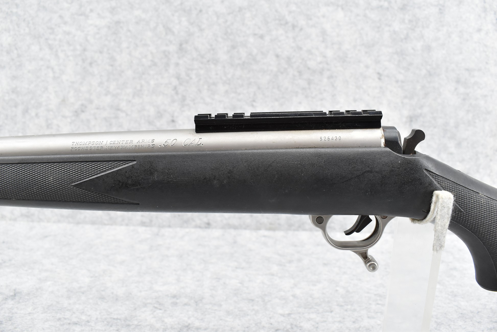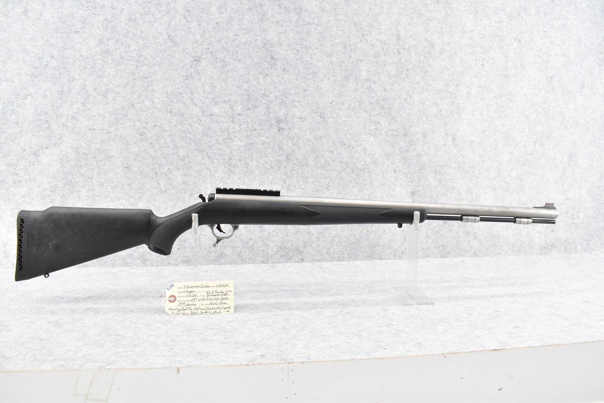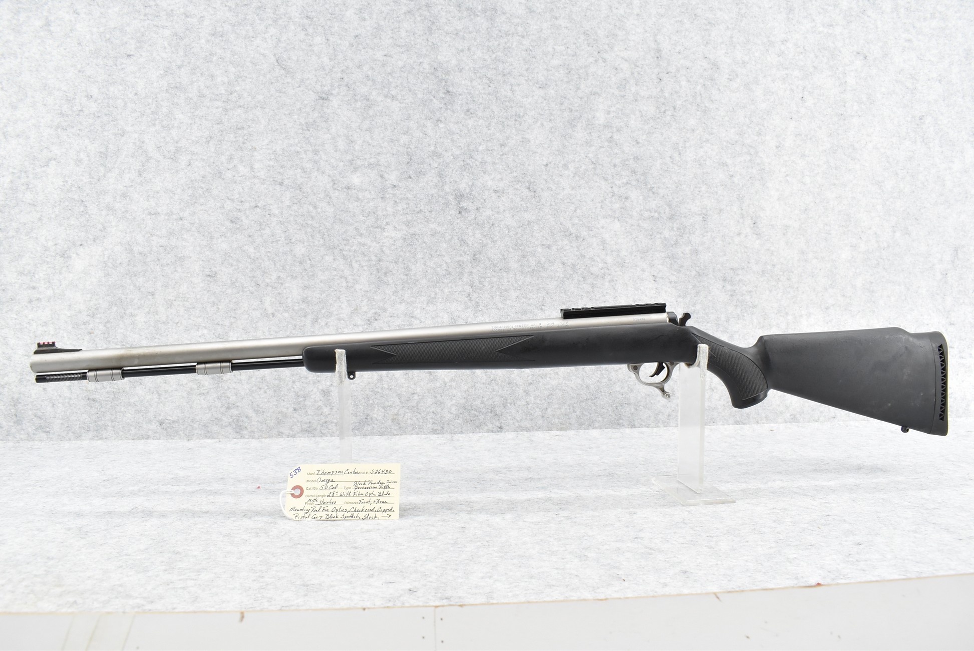 538. Thompson Center – Mod. Omega – 50 Cal. Black Powder Inline Rifle – w/28” Barrel w/Fiber Optic Blade Front Sight – Matte Stainless Finish – w/Checkered Capped Pistol Grip Black Synthetic Stock w/Factory Butt Pad – w/Metal Ram Rod – w/Rear Scope Base