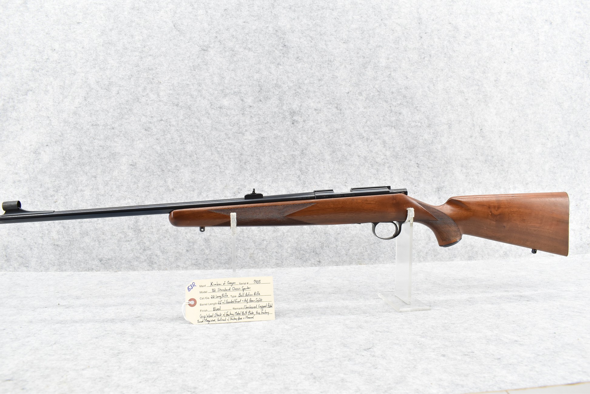 53R. Kimber of Oregon – Mod. 82 Standard Classic Sporter – 22LR Cal. Bolt Action Rifle – w/22” Barrel w/Hooded Front and Adjustable Rear Sights – Blued Finish – w/Checkered Capped Pistol Grip Wood Stock w/Factory Metal Butt Plate – w/Factory 5-Round Magazine – Unfired w/Factory Box and Manual