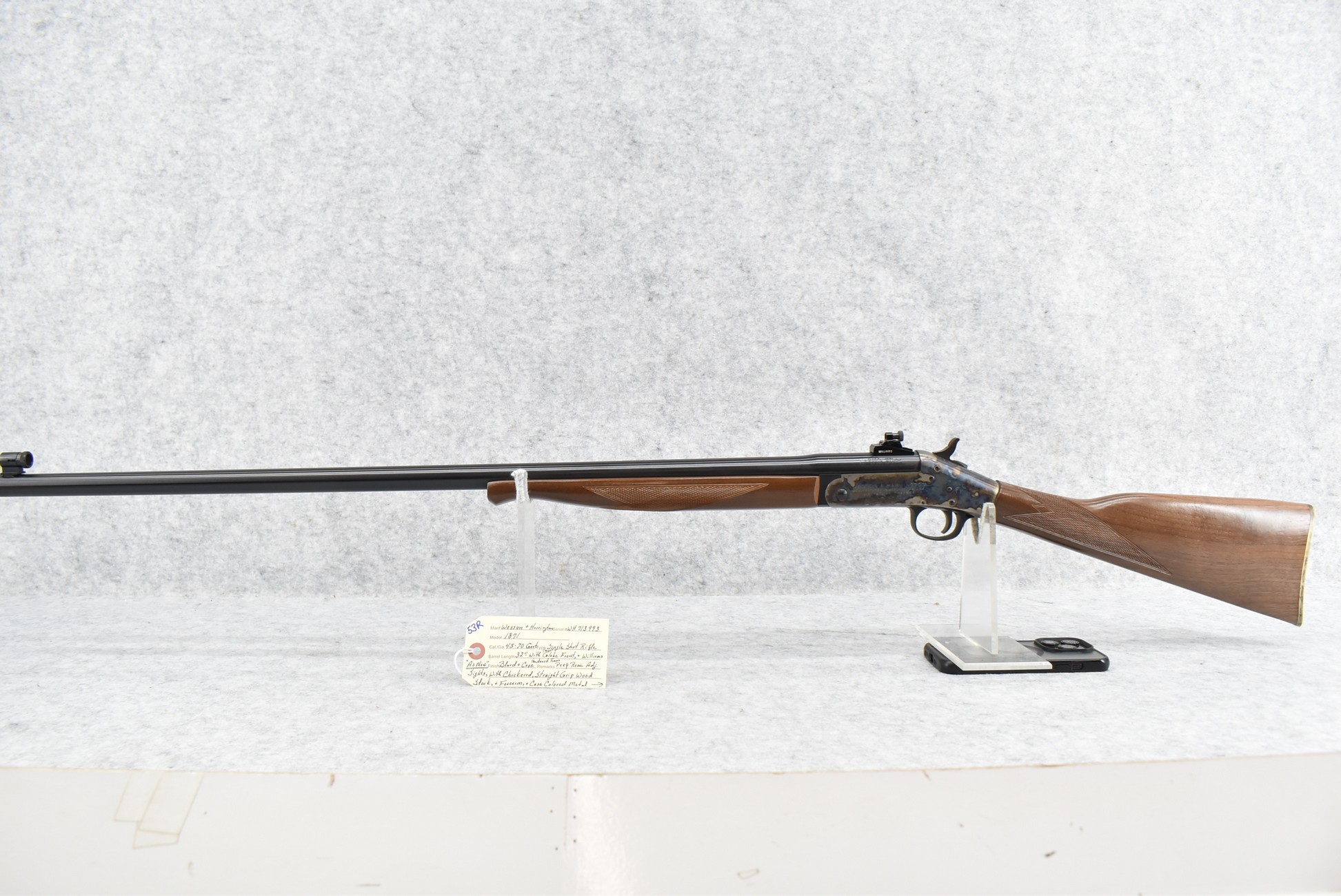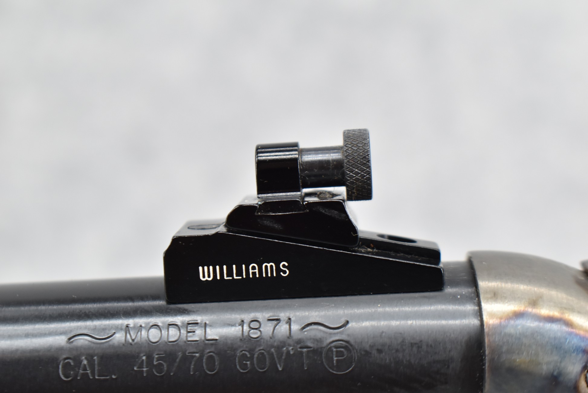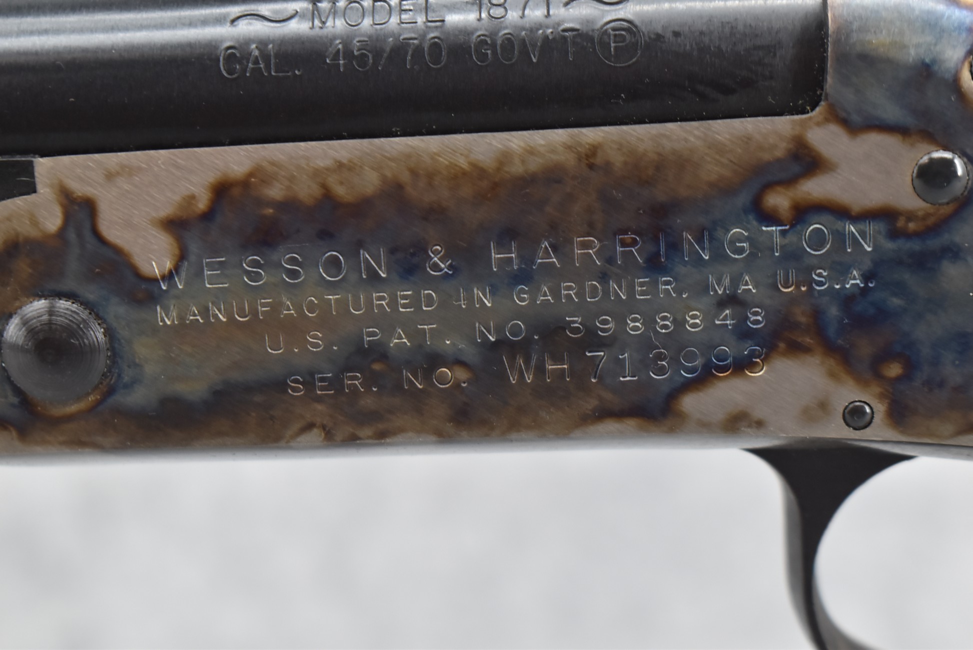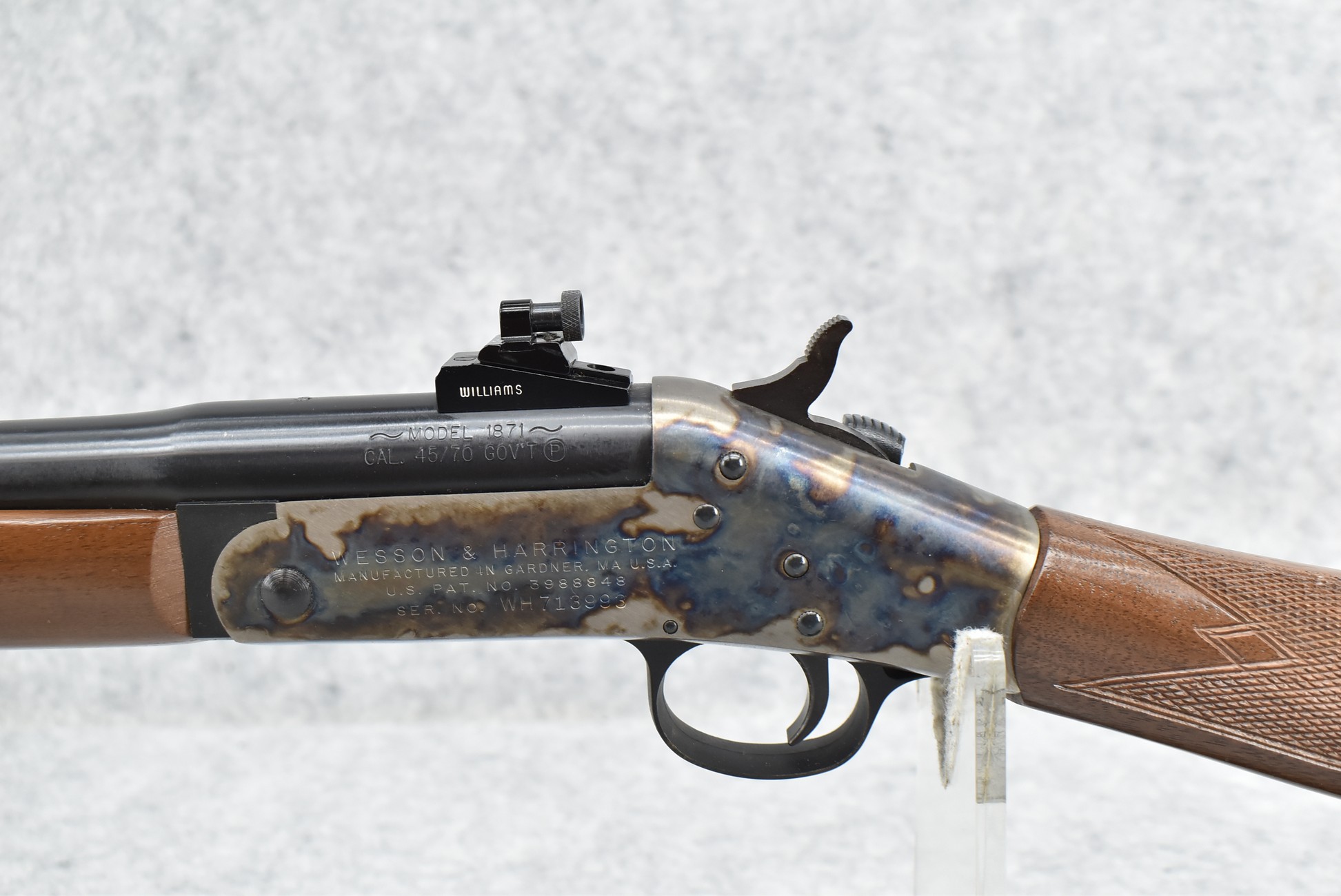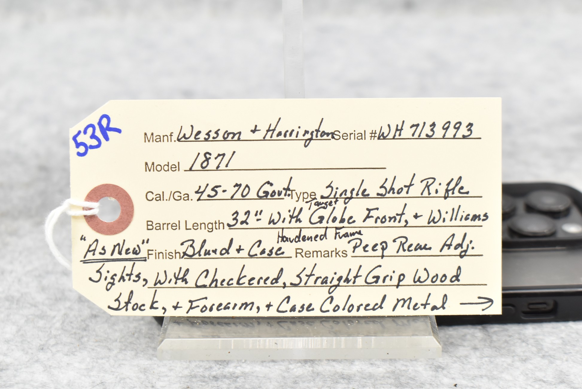 53R. Wesson & Herrington – Mod. 1871 – 45-70 Gov’t Cal. Single Shot Rifle – w/32” Barrel w/Target Globe Front and Williams Adjustable Rear Peep Sights – Blued w/Case Hardened Frame – w/Checkered Straight Grip Wood Stock and Forearm w/Case Colored Metal Butt Plate – As New