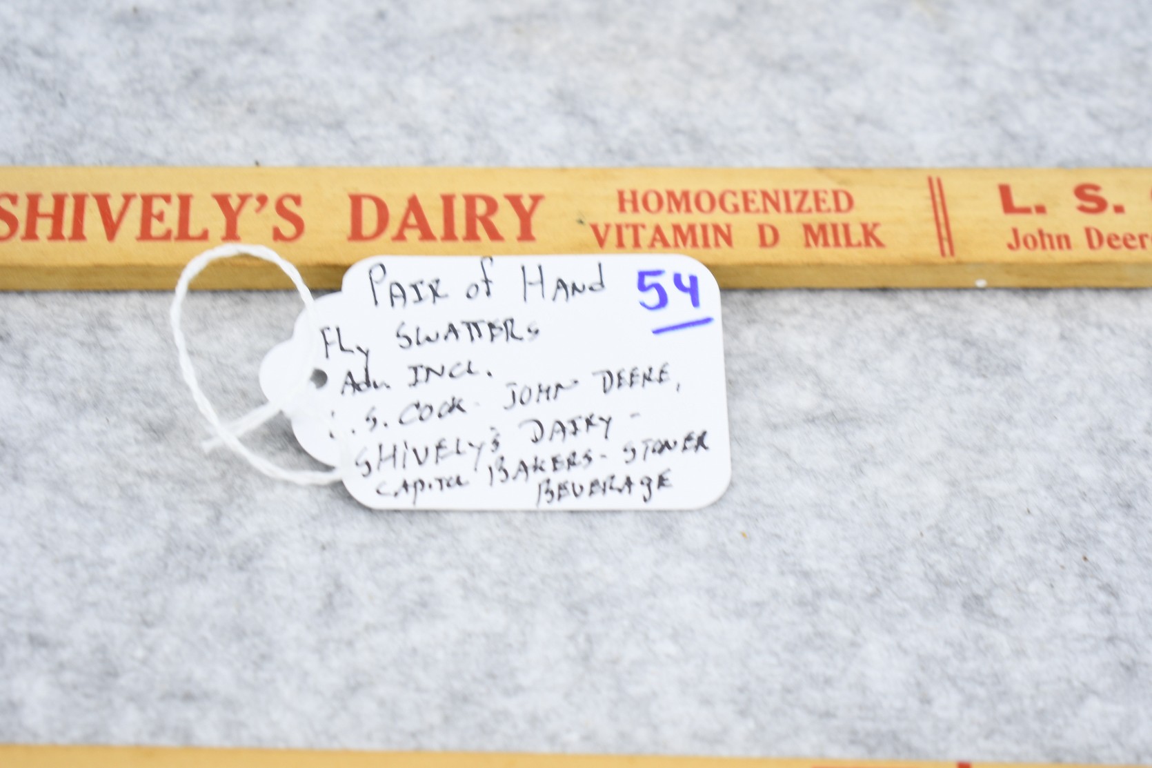 54. Pair of Shively’s Dairy Fly Swatters – Other Advertisers Include Stoner Beverage Co., “OS” Pound Farm Supply, Capitol Bakers Inc. LS Cook, and John Deere Tractors and Equipment