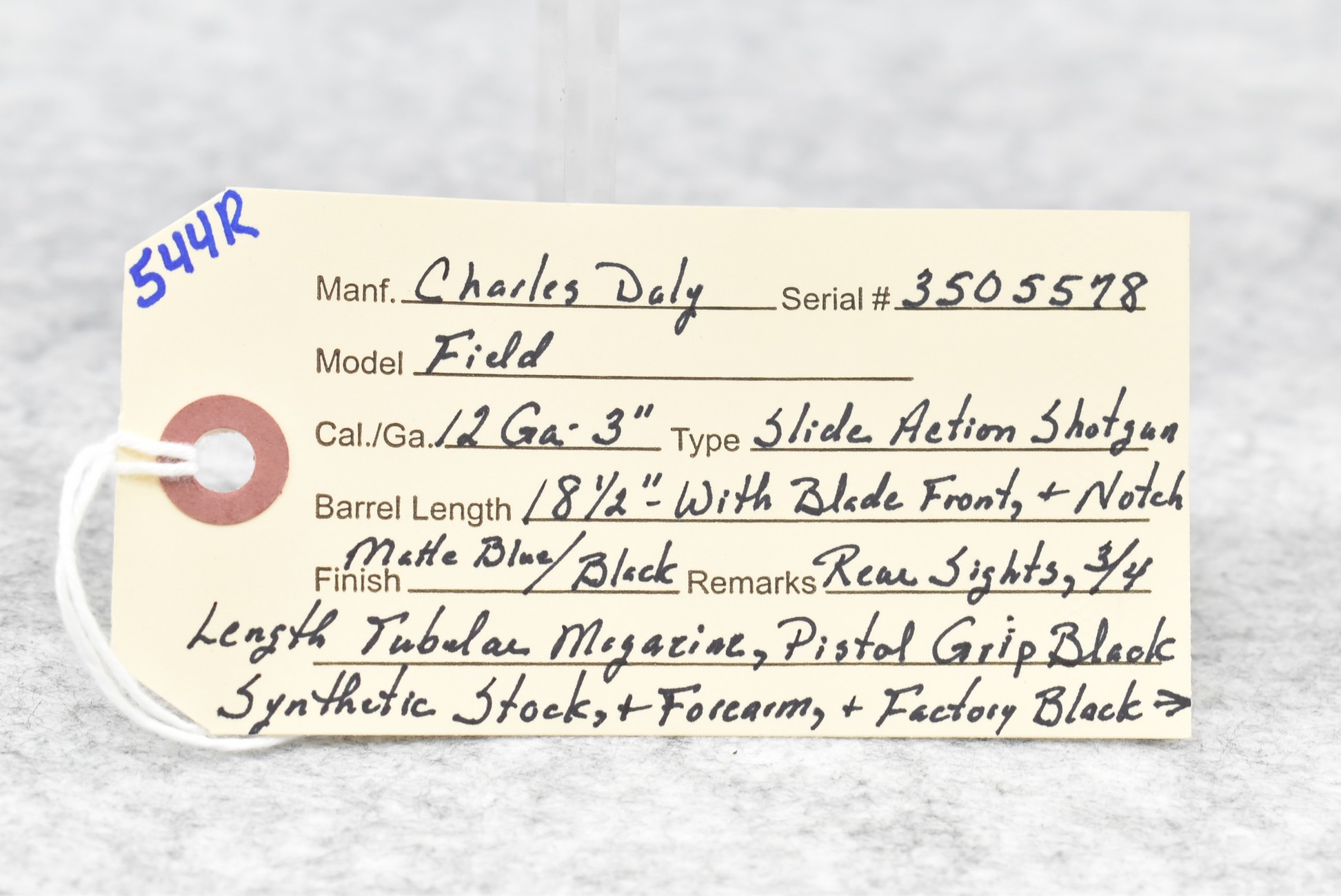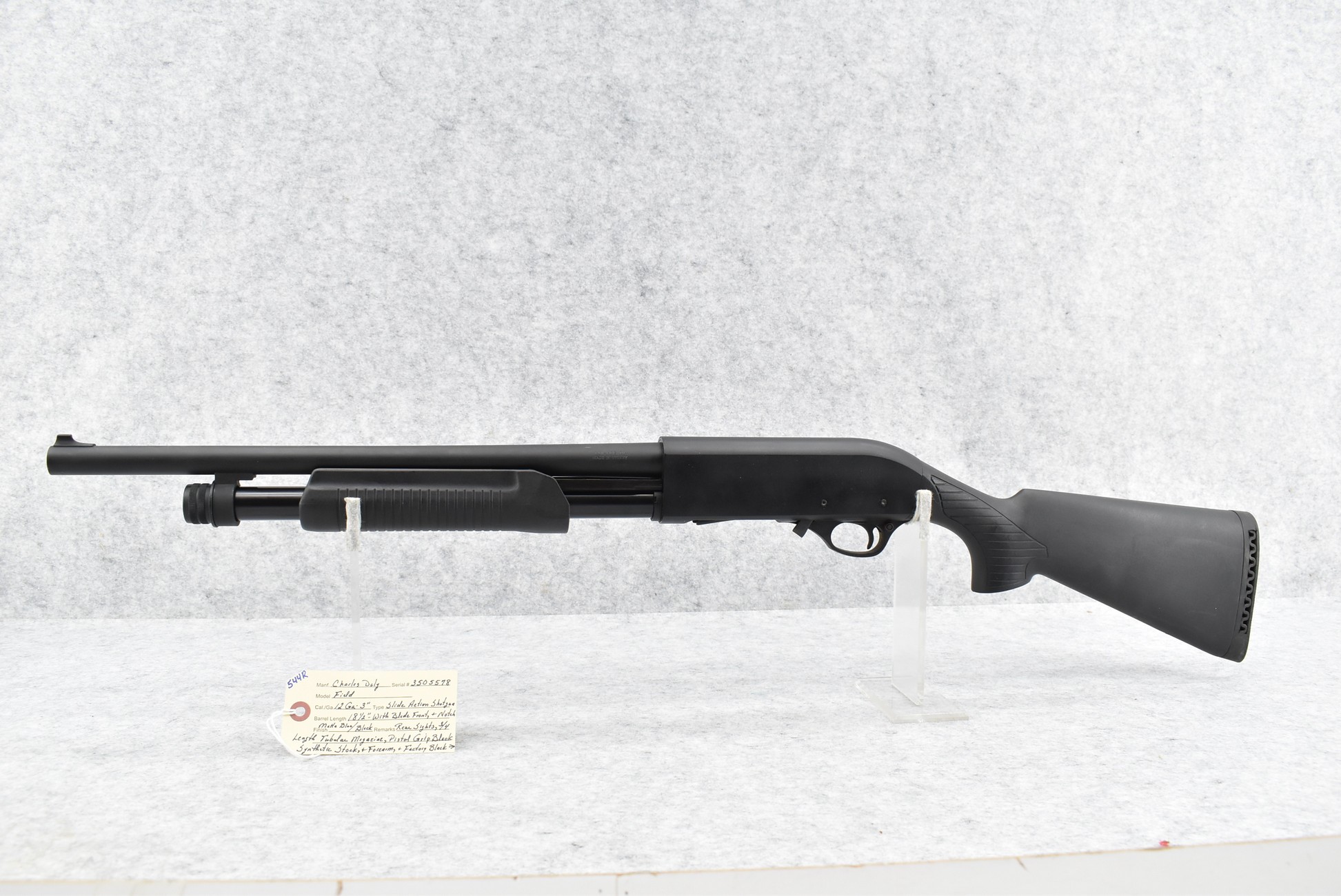 544R. Charles Daly – Mod. Field – 12ga. 3” Pump Action Shotgun – w/18 ½” Barrel w/Blade Front & Notch Rear Sights w/3/4 Length Tubular Magazine – Matte Blued Finish – w/Pistol Grip Black Synthetic Stocks w/Factory Butt Pad