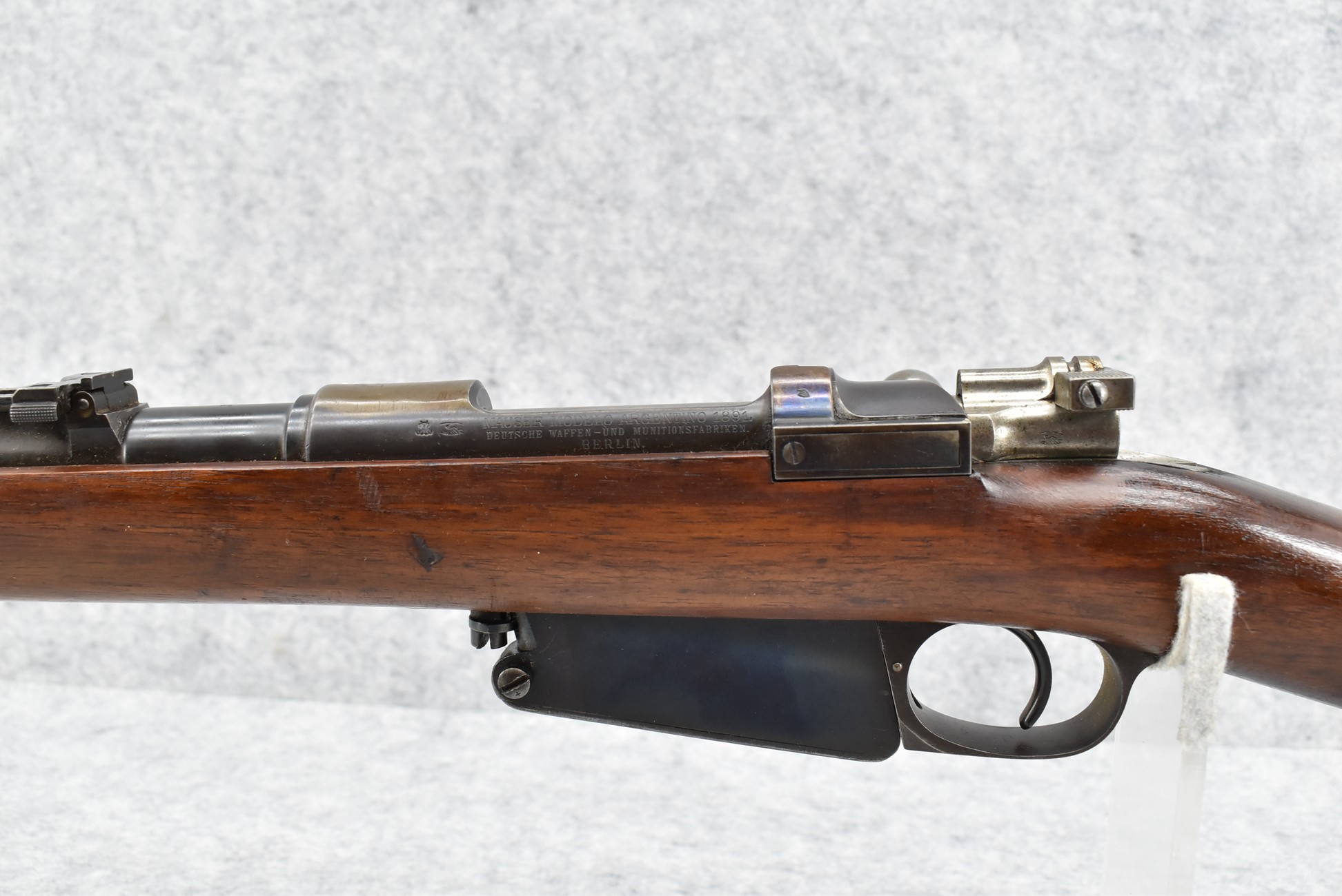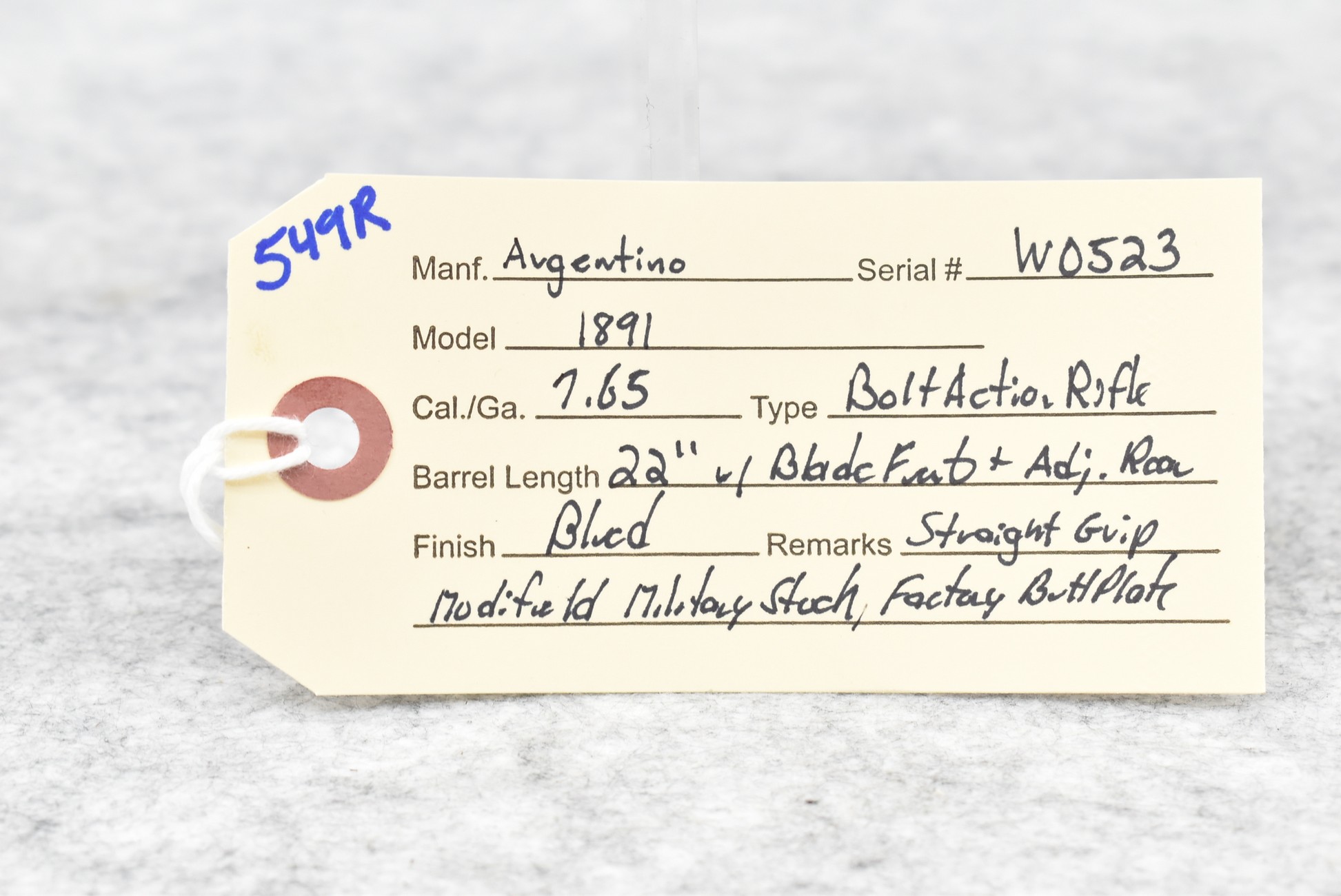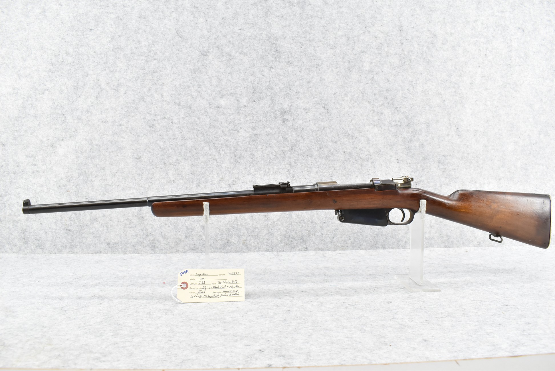549R. Argentino – Mod. 1891 – 7.65 Cal. Bolt Action Rifle – w/22” Barrel w/Blade Front & Adj. Rear Sights – Blued Finish – w/Straight Grip Modified Military Stock w/Factory Butt Plate