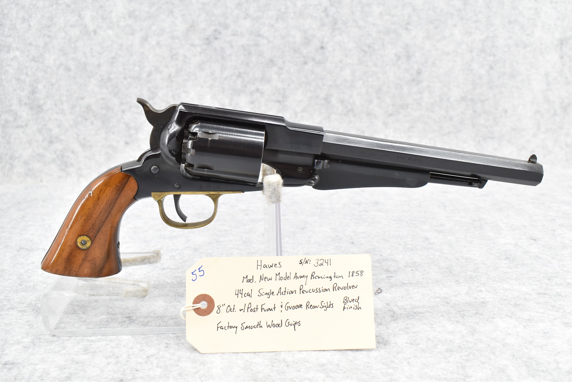 55. Hawes – New Model Army Remington 1858 – 44 Cal. Single Action Percussion Revolver – w/8” Octagon Barrel w/Post Front & Groove Rear Sights – Blued Finish – w/Factory Smooth Wood Grips