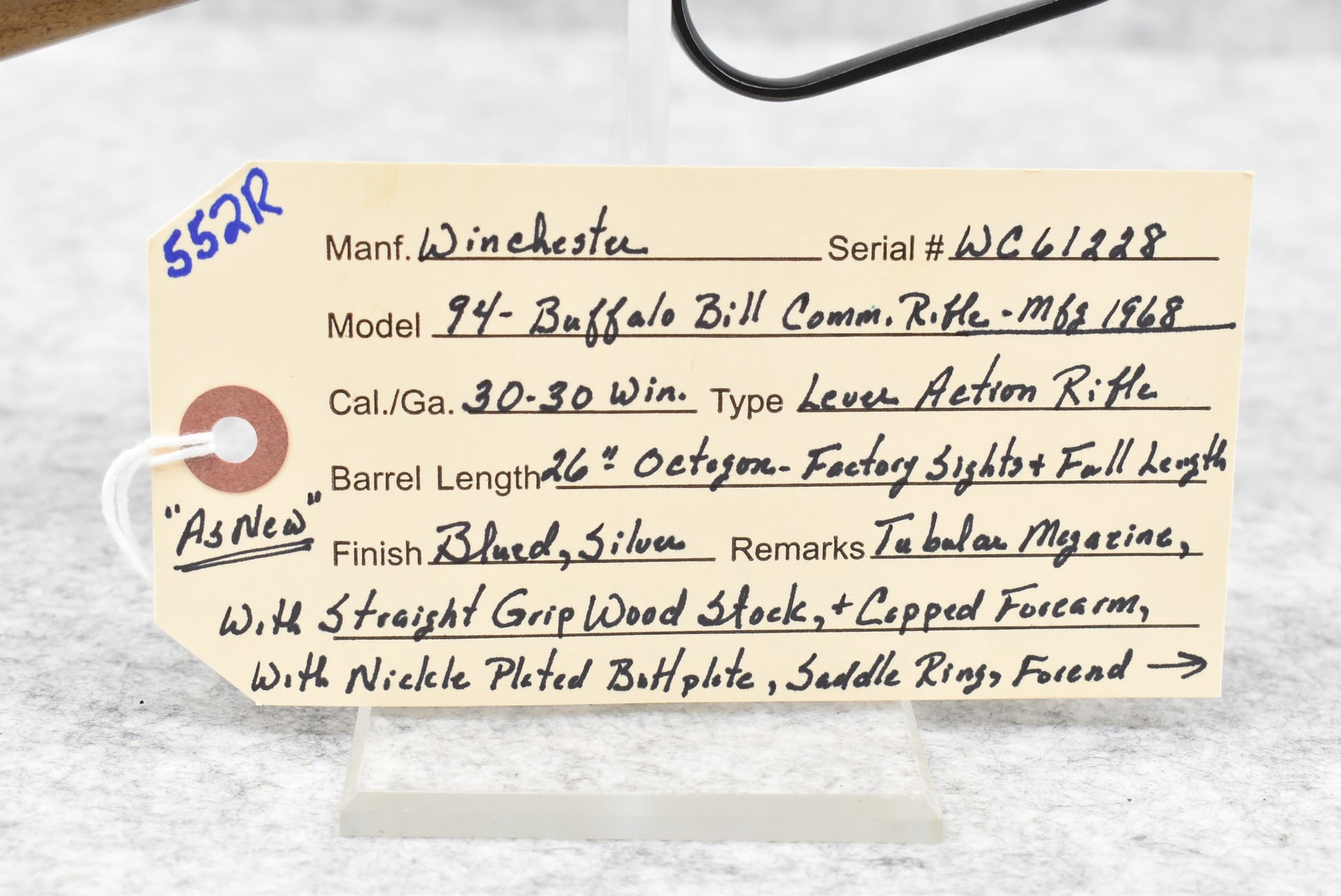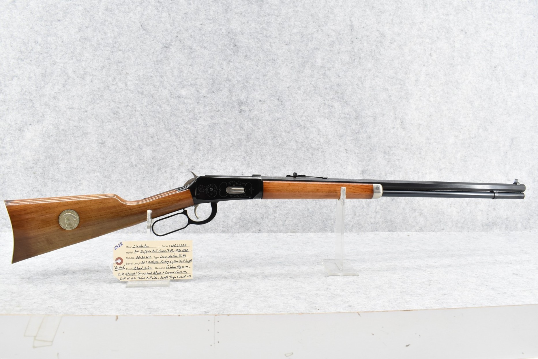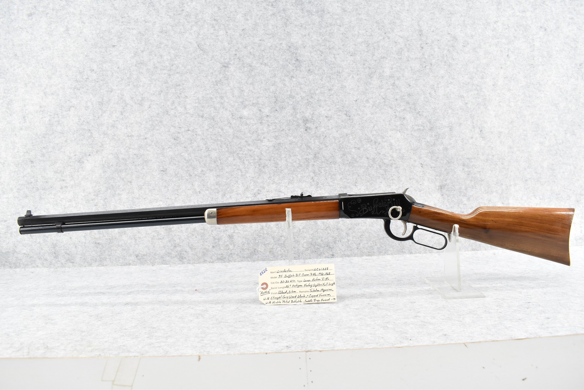 552R. Winchester – Mod. 94 – Buffalo Bill Commemorative – 30-30 Win. Cal. Lever Action Rifle – w/26” Octagon Barrel w/Factory Sights & Full Length Tubular Magazine – Blued/Silver Finish – w/Straight Grip Wood Stocks w/Nickel Plated Butt Plate w/Cody Medallion Inlaid on Right Side of Butt Stock – w/Saddle Ring – Mfg. 1968 – As New