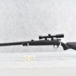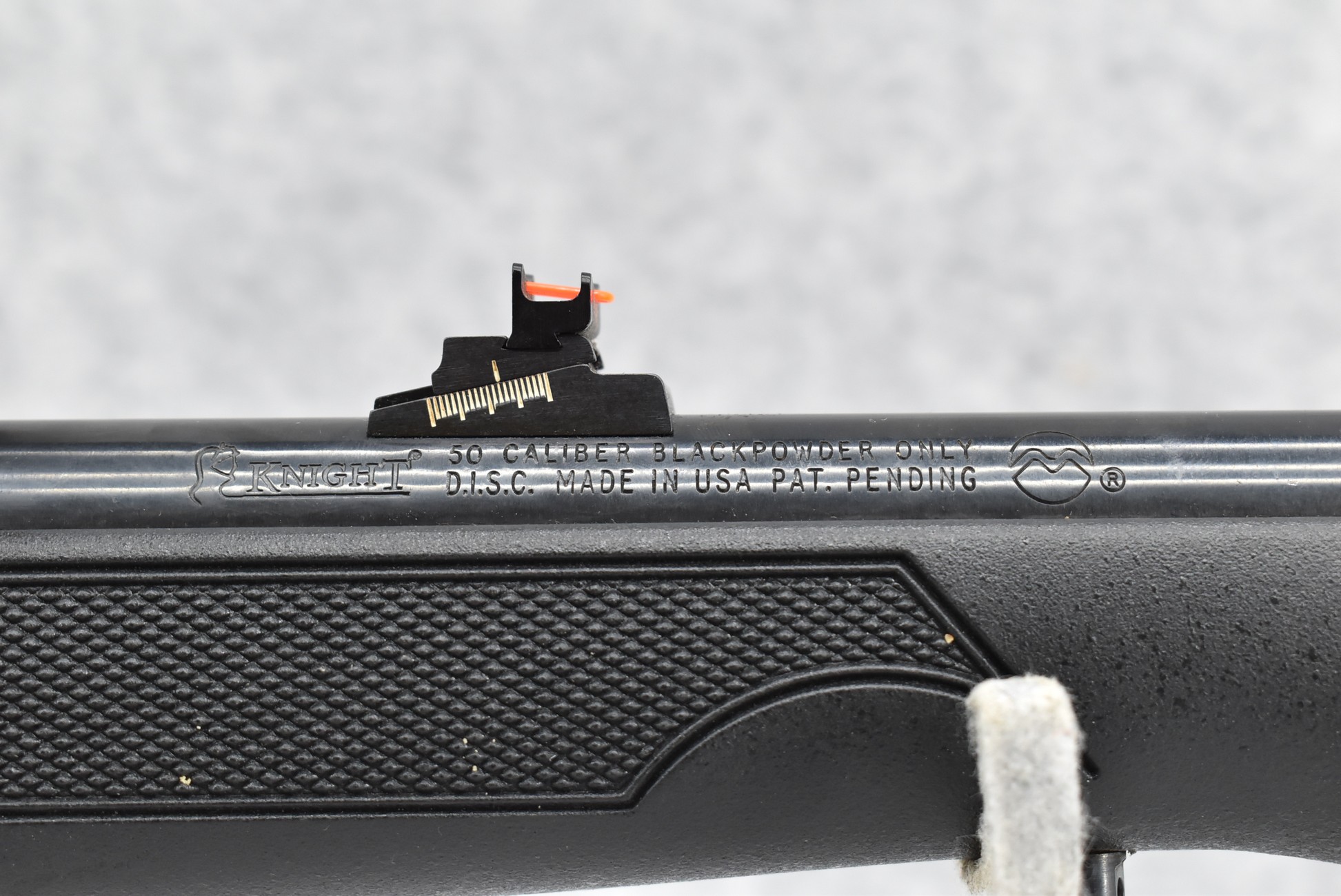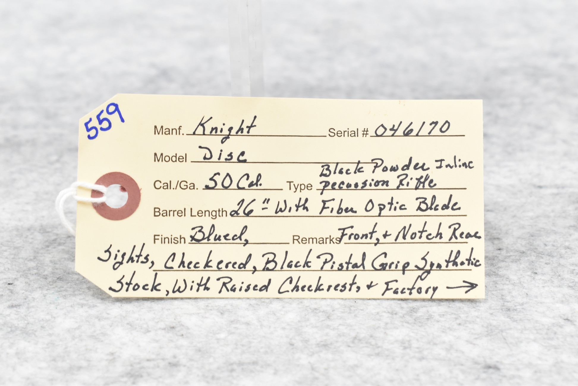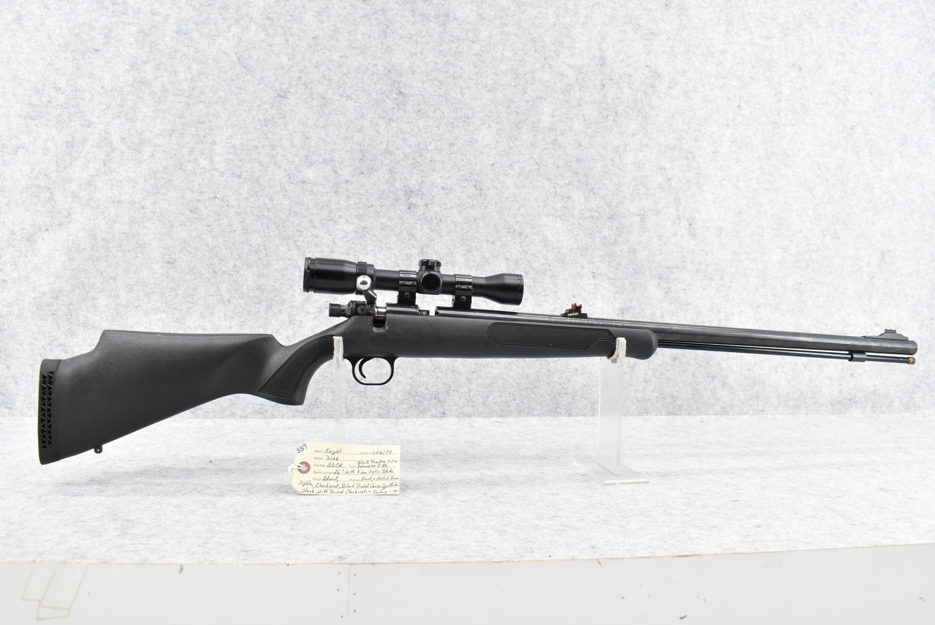 559. Knight – Mod. Disc – 50 Cal. Black Powder Inline Rifle – w/26” Barrel w/Fiber Optic Blade Front & Notch Rear Sights – Blued Finish – w/Checkered Black Plastic Grip Synthetic Stock w/Raised Cheek Piece w/Factory Butt Pad – w/Bushnell Banner 4x32mm Scope & Mounts