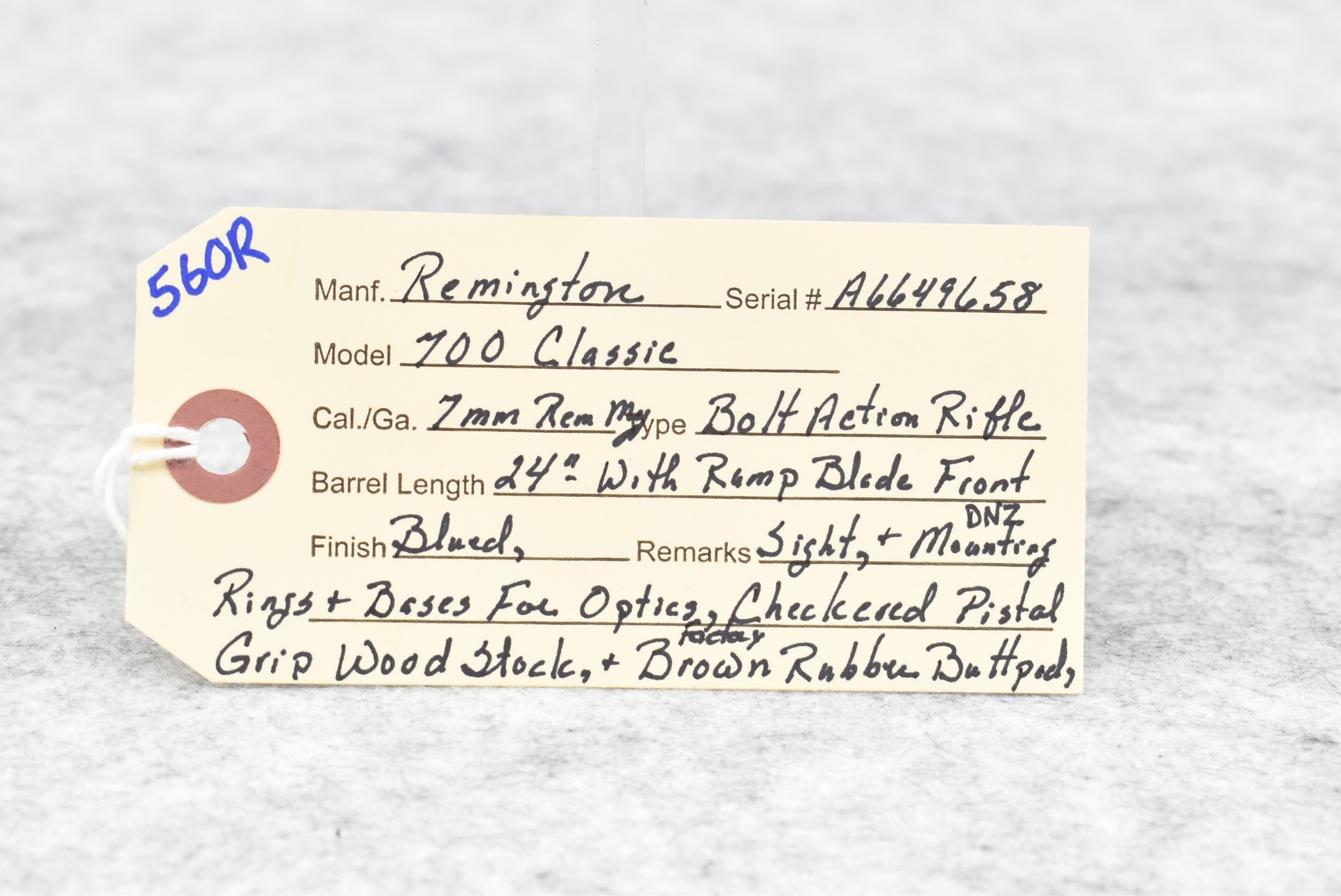 560R. Remington – Mod. 700 Classic – 7mm Rem. Mag. Cal. Bolt Action Rifle – w/24” Barrel w/Ramp Blade Front Sight – Blued Finish – w/Checkered Pistol Grip Wood Stock w/Factory Butt Pad – w/DNZ Mounting Rings & Base