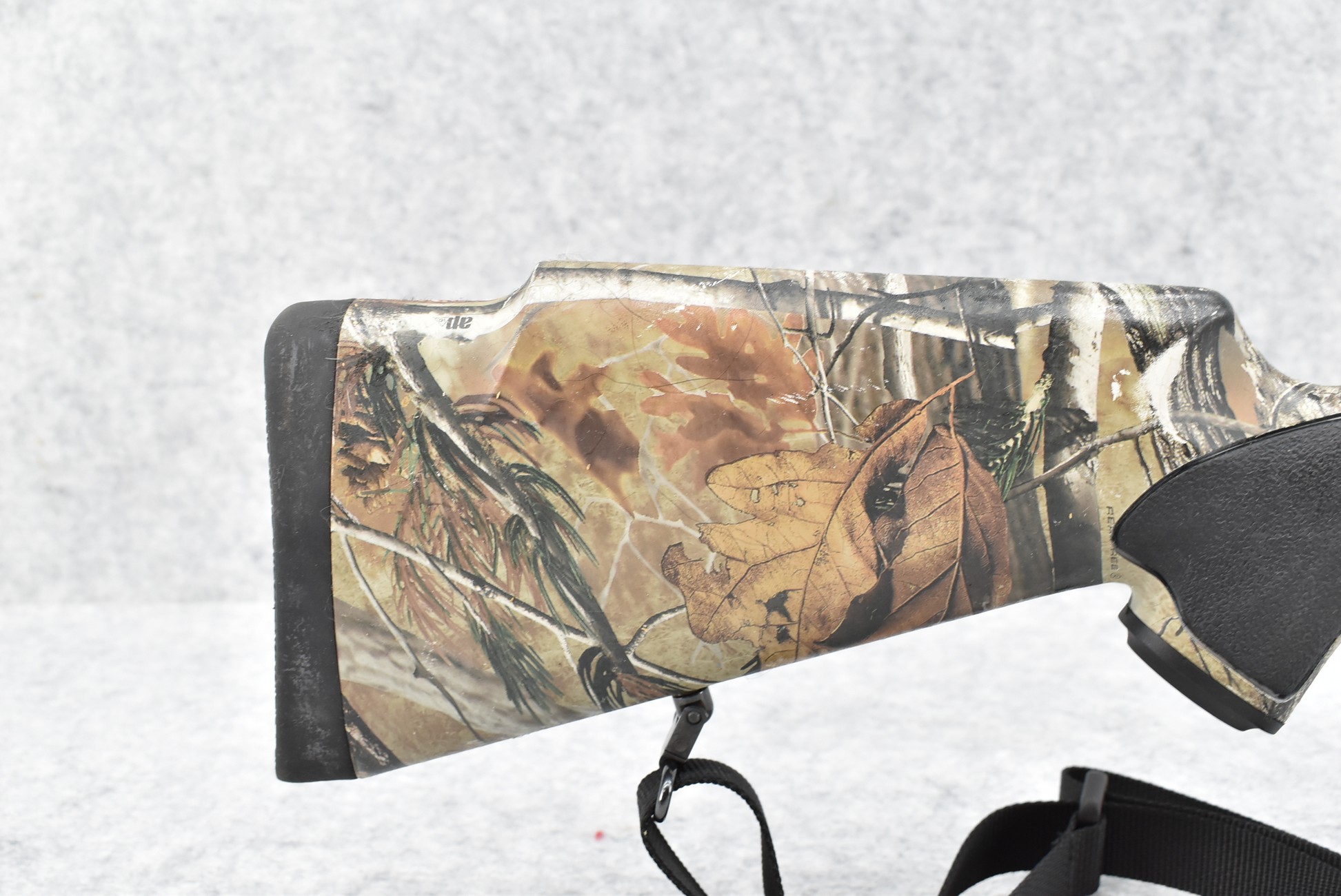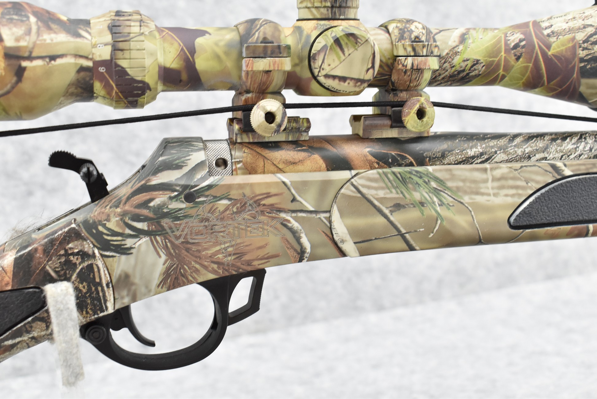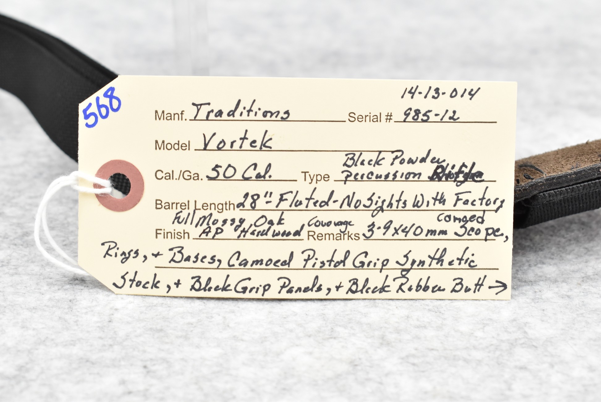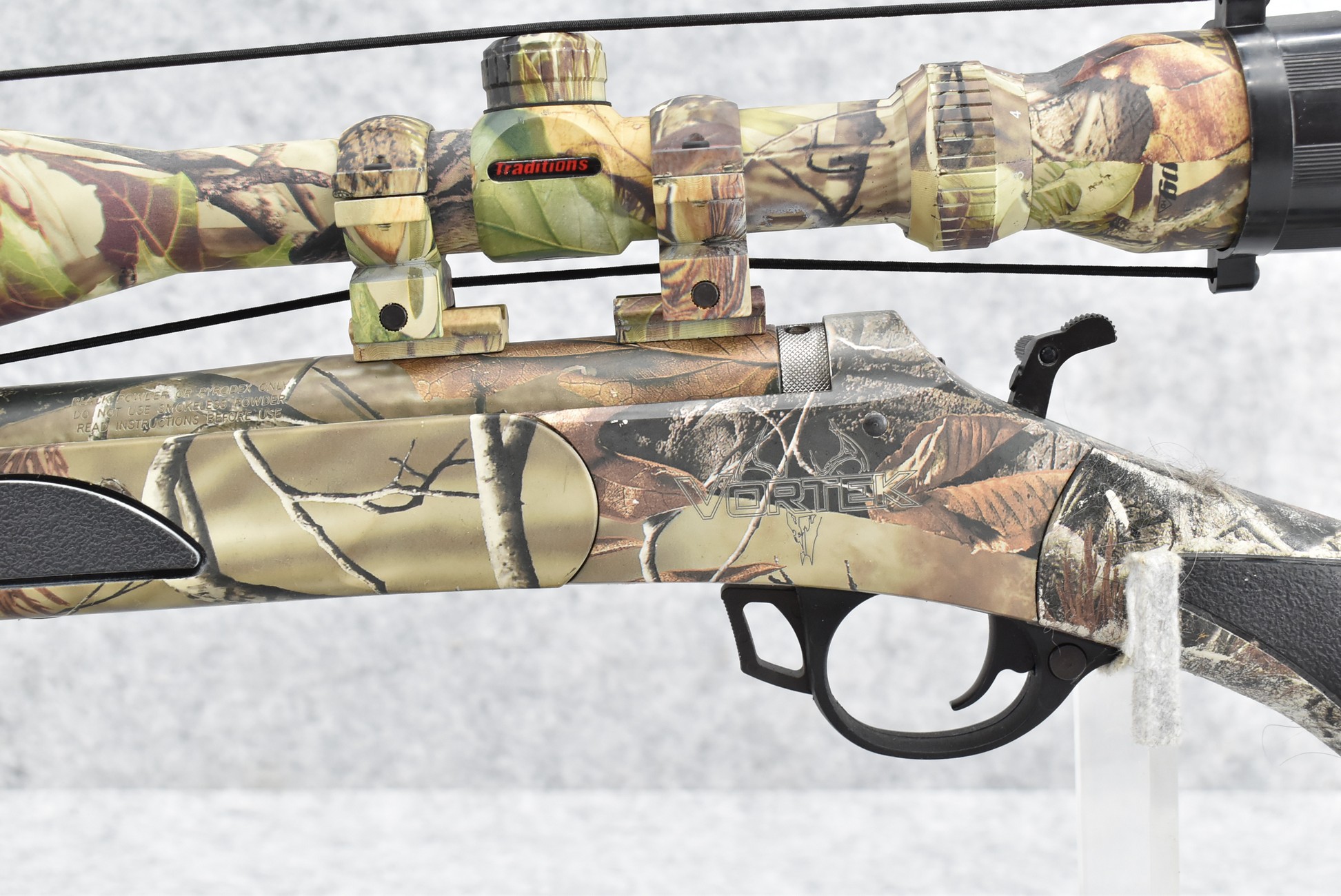 568. Traditions – Mod. Vortek – 50 Cal. Black Powder Percussion Rifle – w/28” Fluted Barrel – Full Mossy Oak AP Hardwood Coverage – w/Camoed Pistol Grip Stocks – w/Nylon Sling & Ram Rod – w/Factory Matching Camoed 3-9x40mm Scope, Rings & Bases