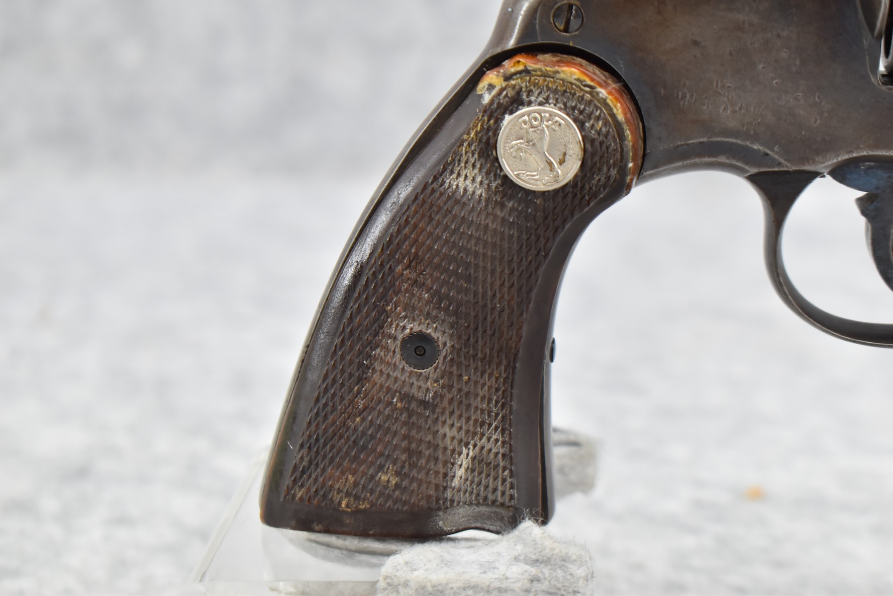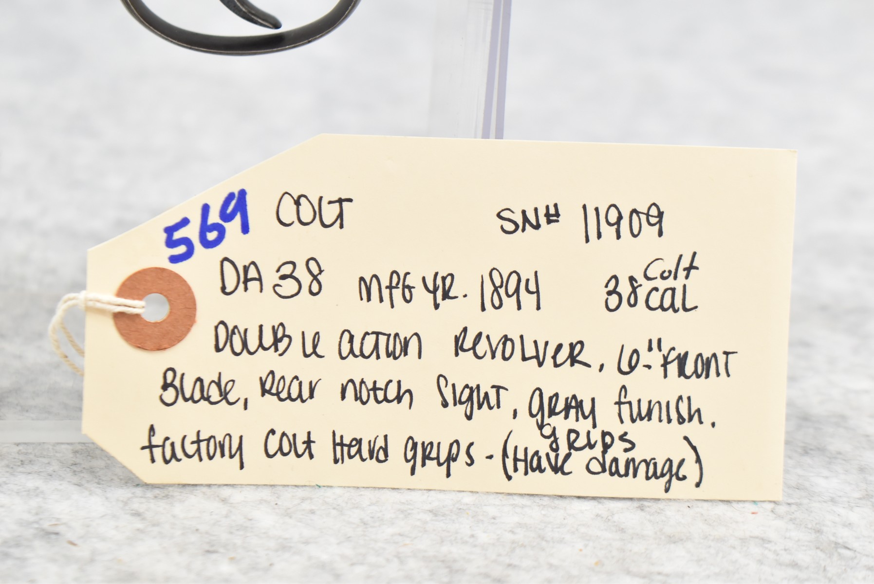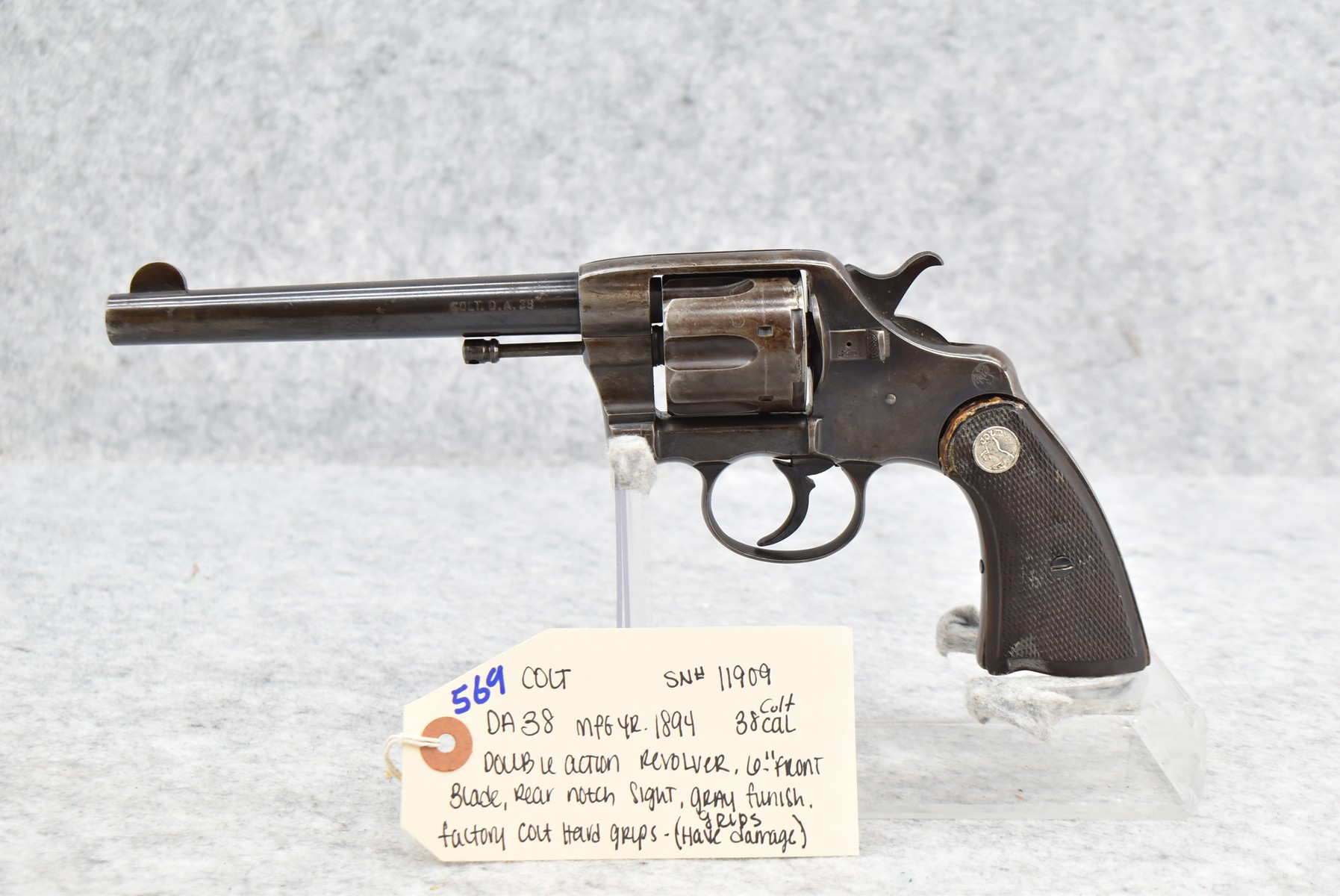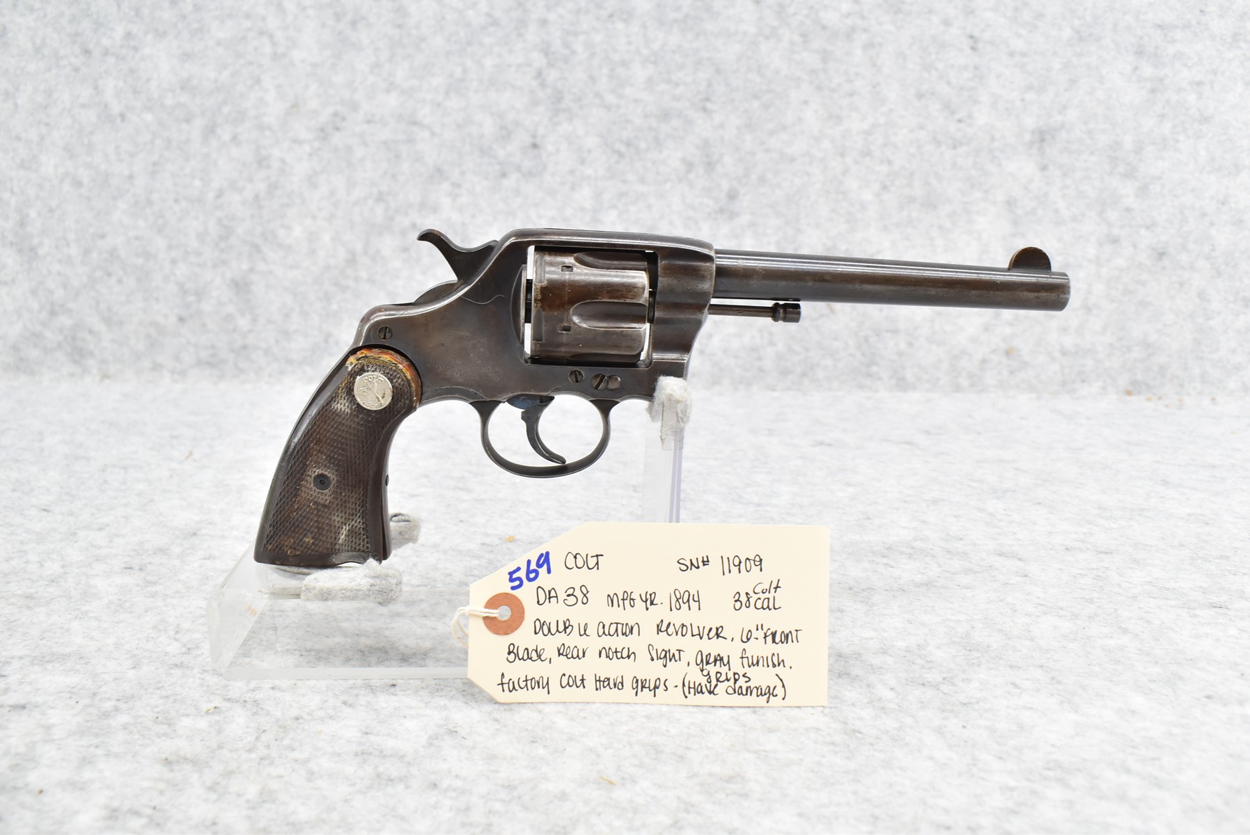 569. Colt – Mod. DA 38 – 38 Colt Cal. Double Action Revolver – w/6” Barrel w/Front Blade & Rear Notch Sights – Gray Finish – w/Factory Colt Hard Grips – Mfg. 1894 – Note: Grips Have Damage