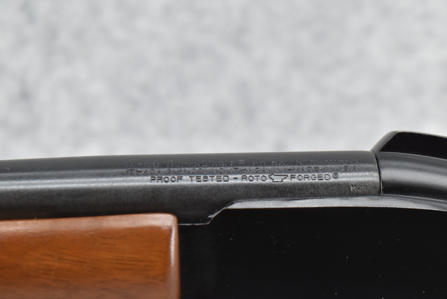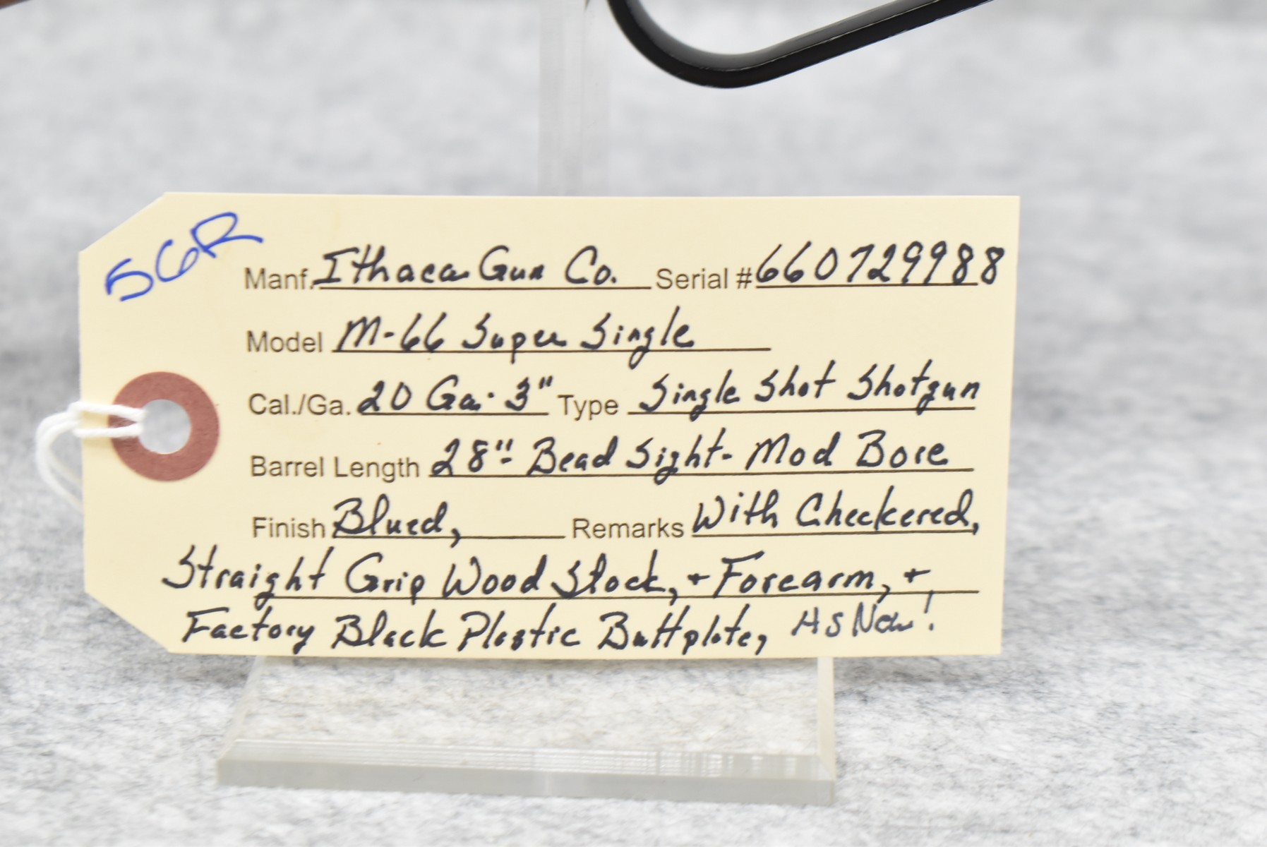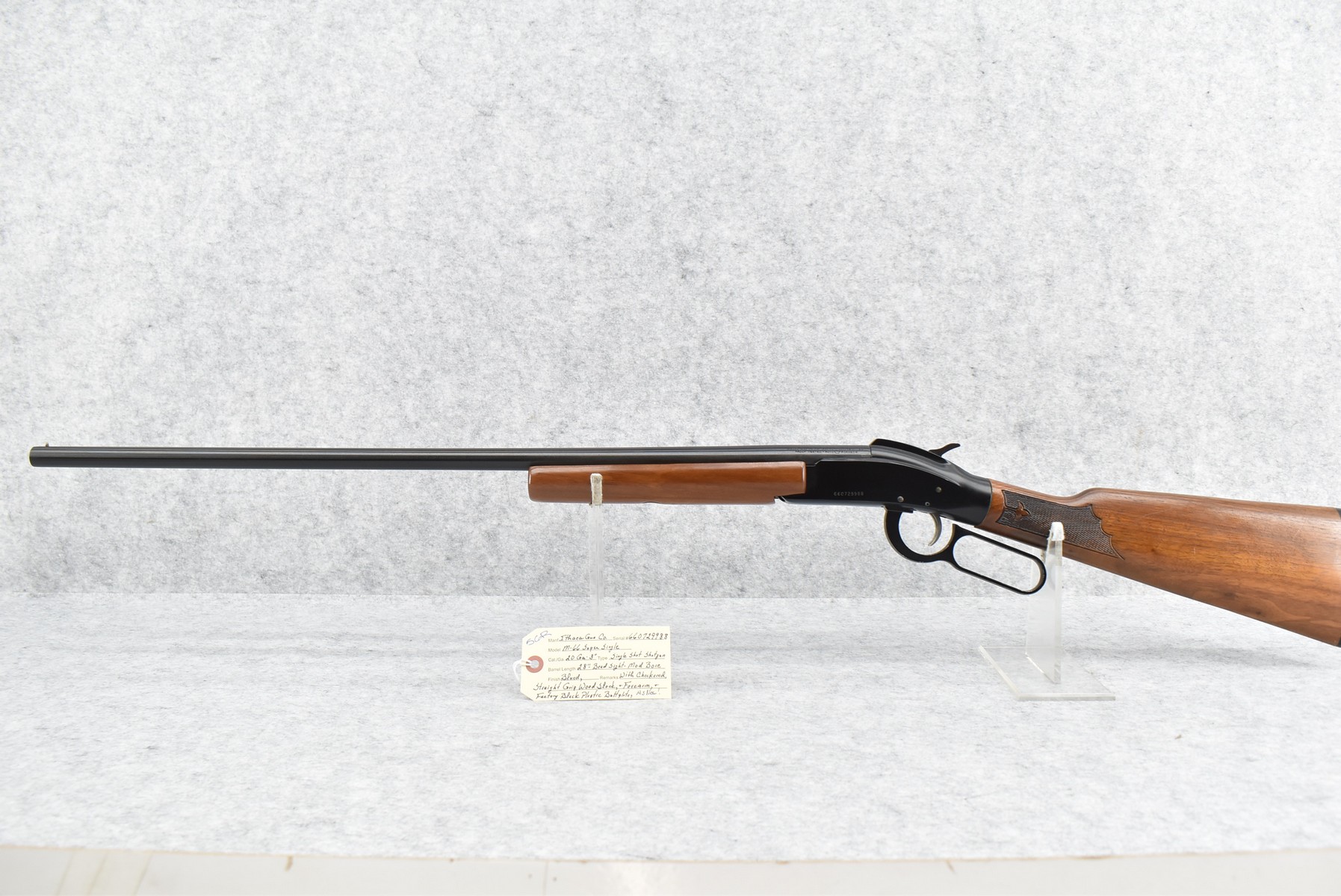 56R. Ithaca Gun Co. – Mod. 66 Super Single – 20ga. 3” Single Shot Shotgun – w/28” Mod. Choke, Barrel w/Bead Sight – Blued Finish – w/Checkered Straight Grip Wood Stocks w/Factory Butt Plate – As New!