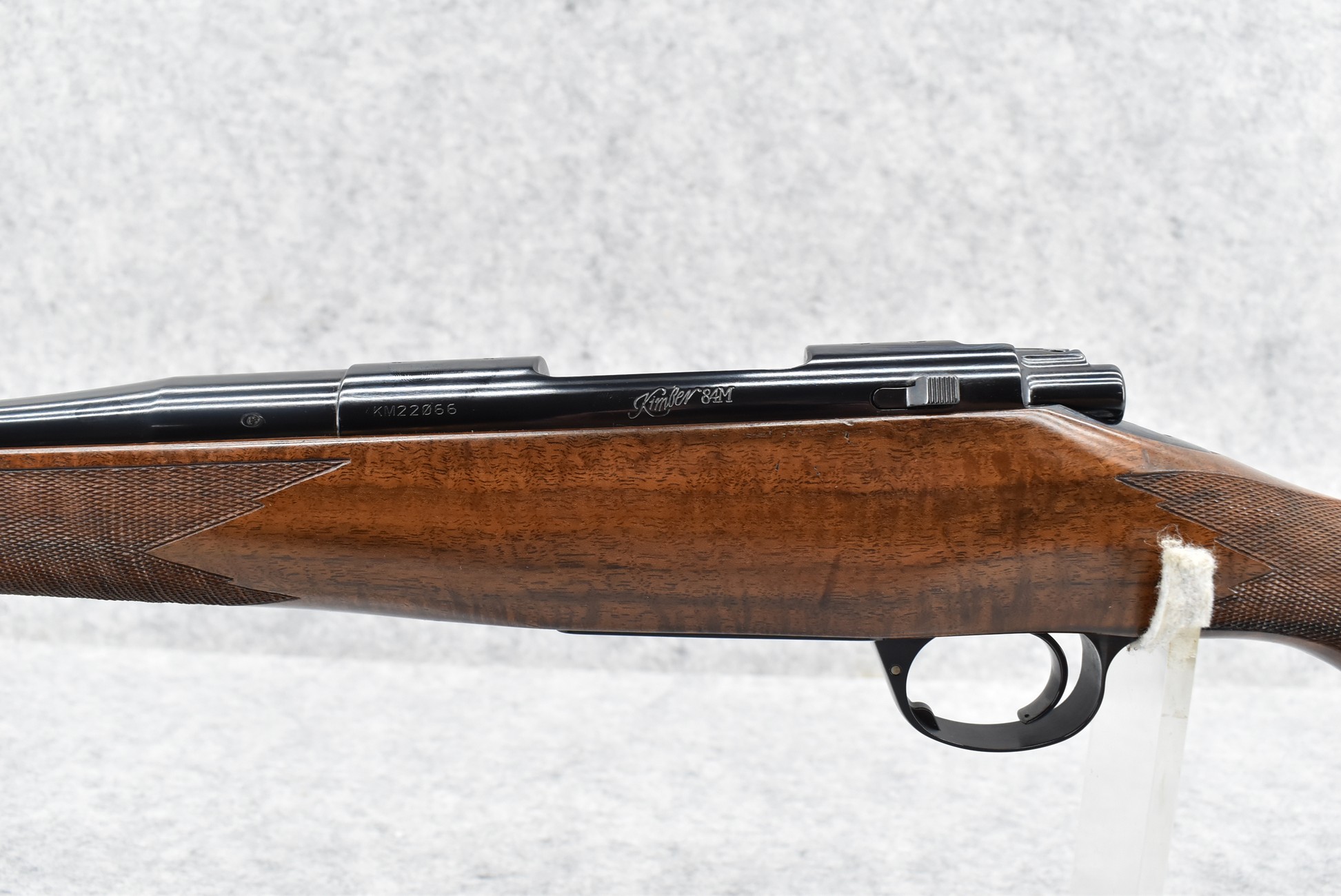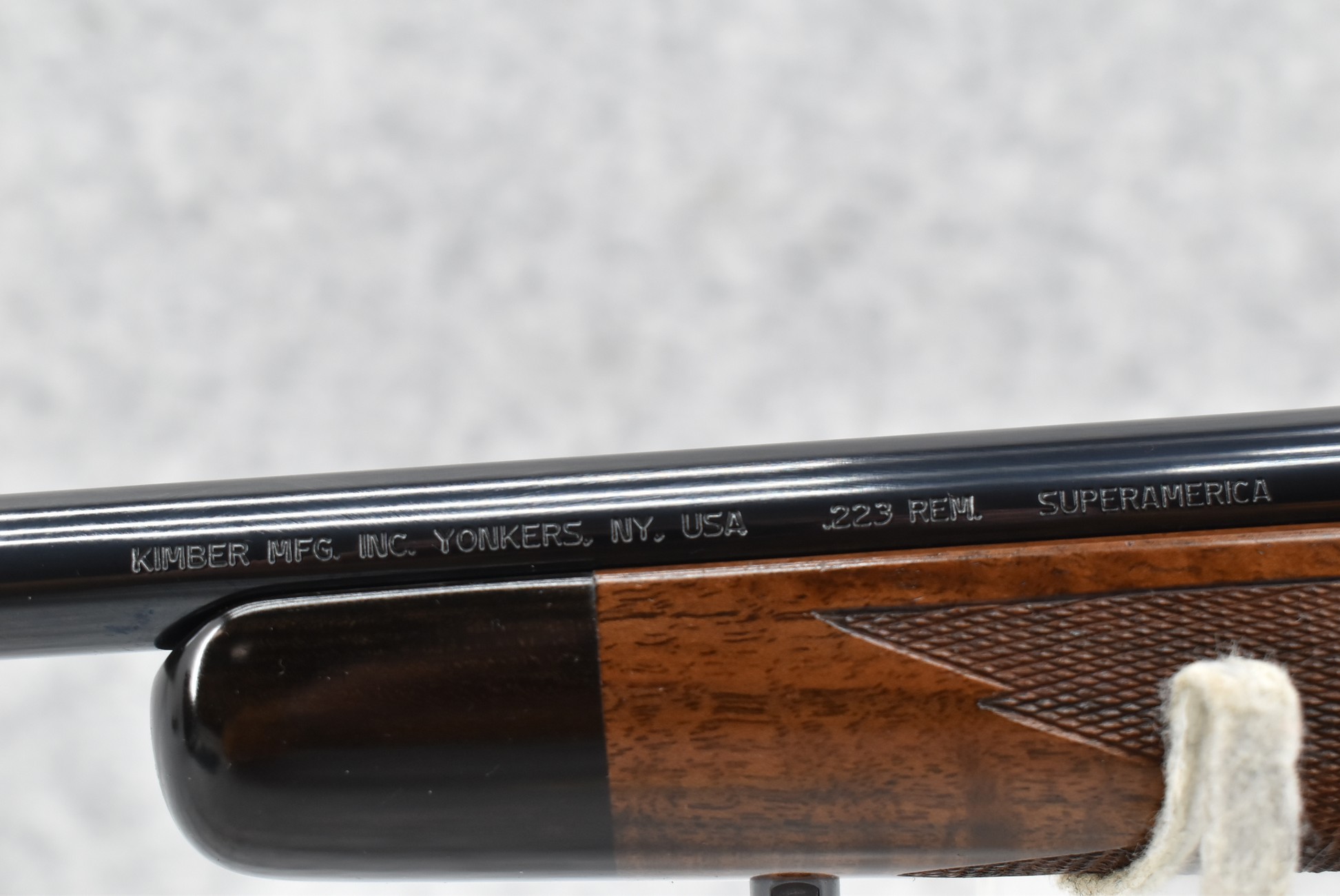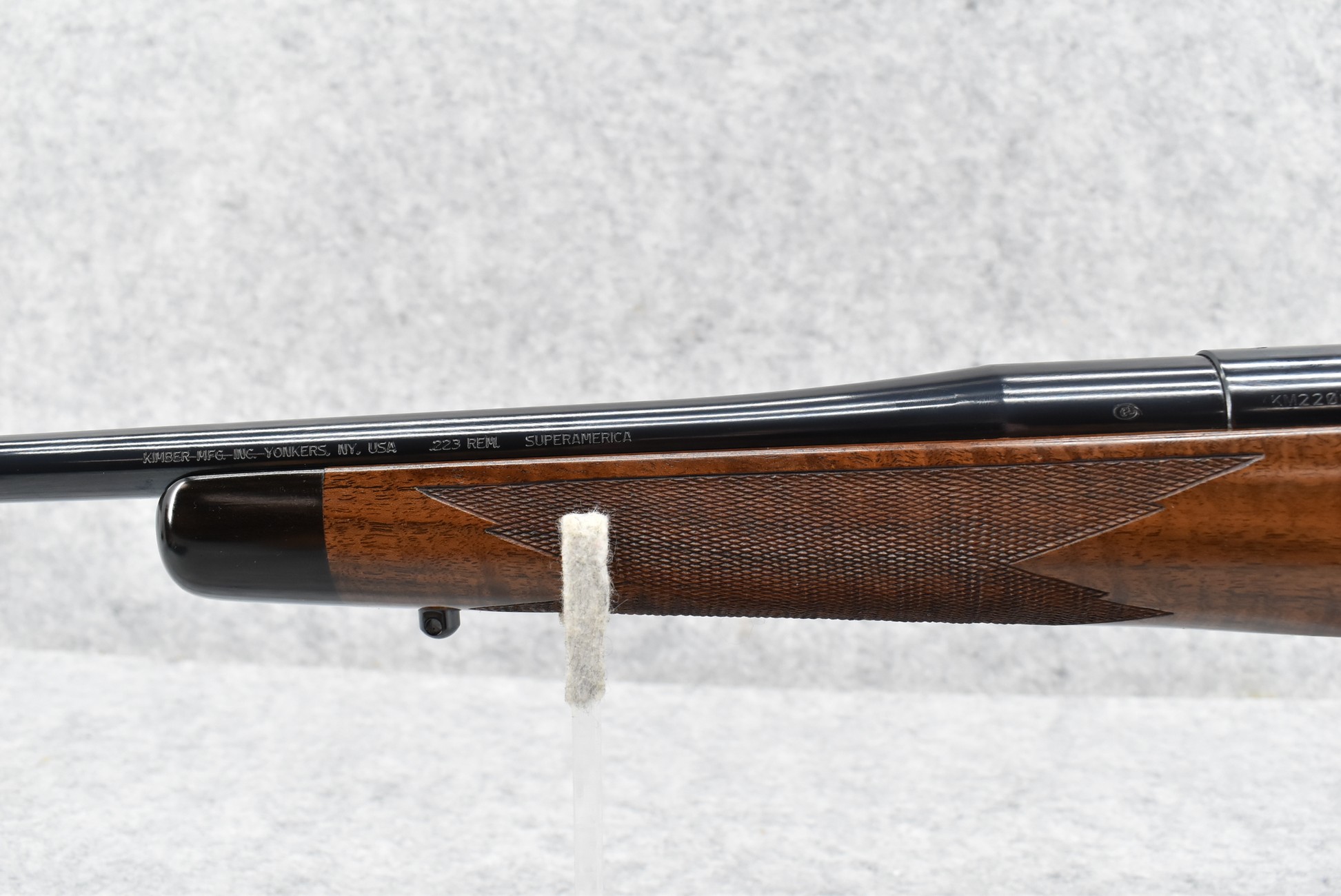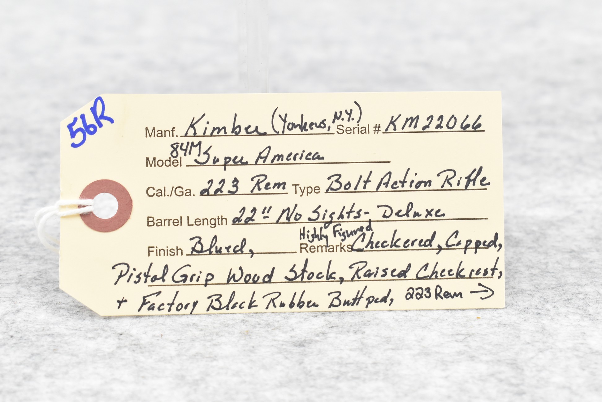 56R. Kimber (Yonkers, NY) – Mod. 84M Super America – 223 Rem. Cal. Bolt Action Rifle – w/22” Barrel – Blued Finish – w/Highly Figured Deluxe Checkered Capped Pistol Grip Wood Stock w/Raised Cheek Rest and Factory Butt Pad – The 223 Rem. Caliber was Discontinued in 2009