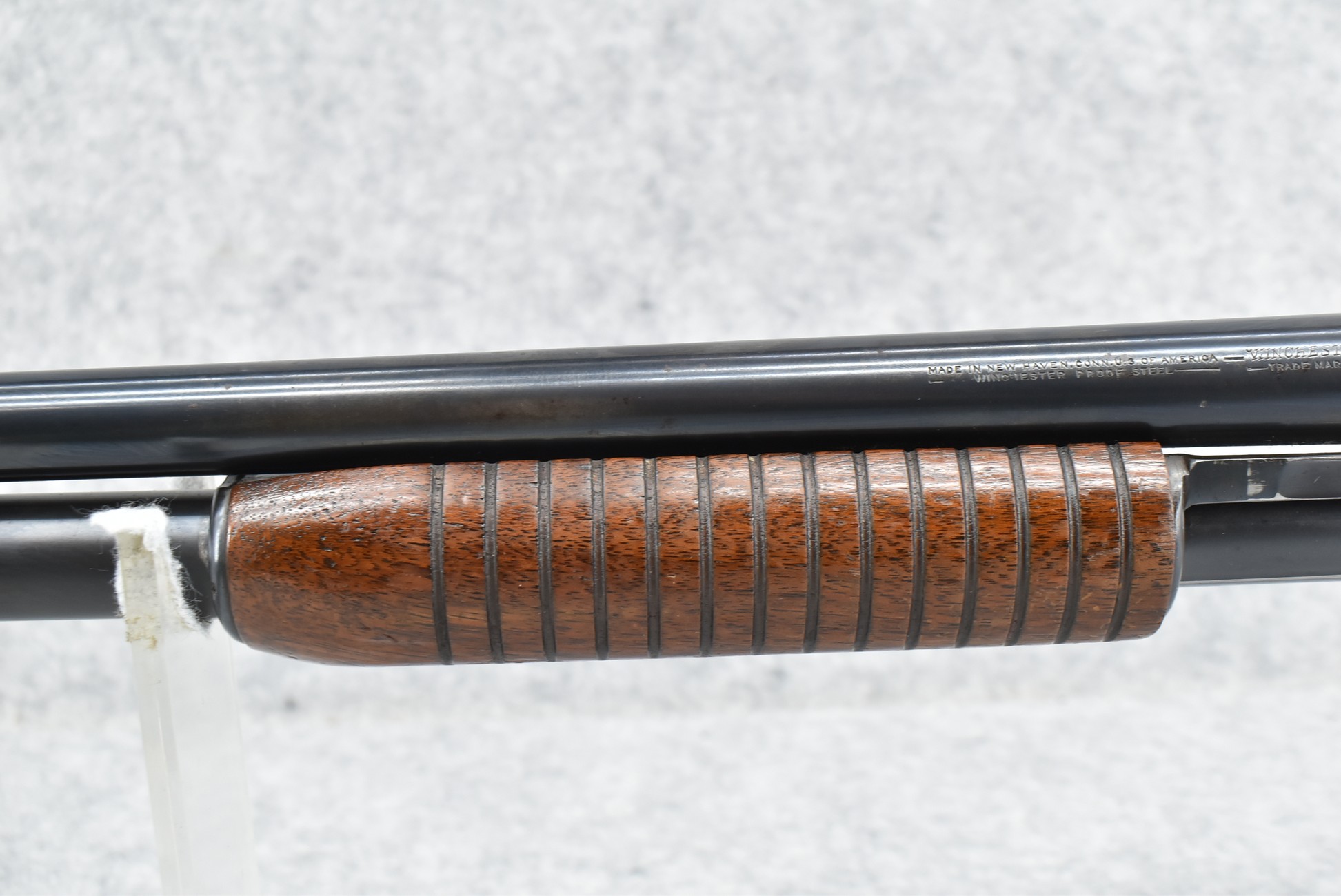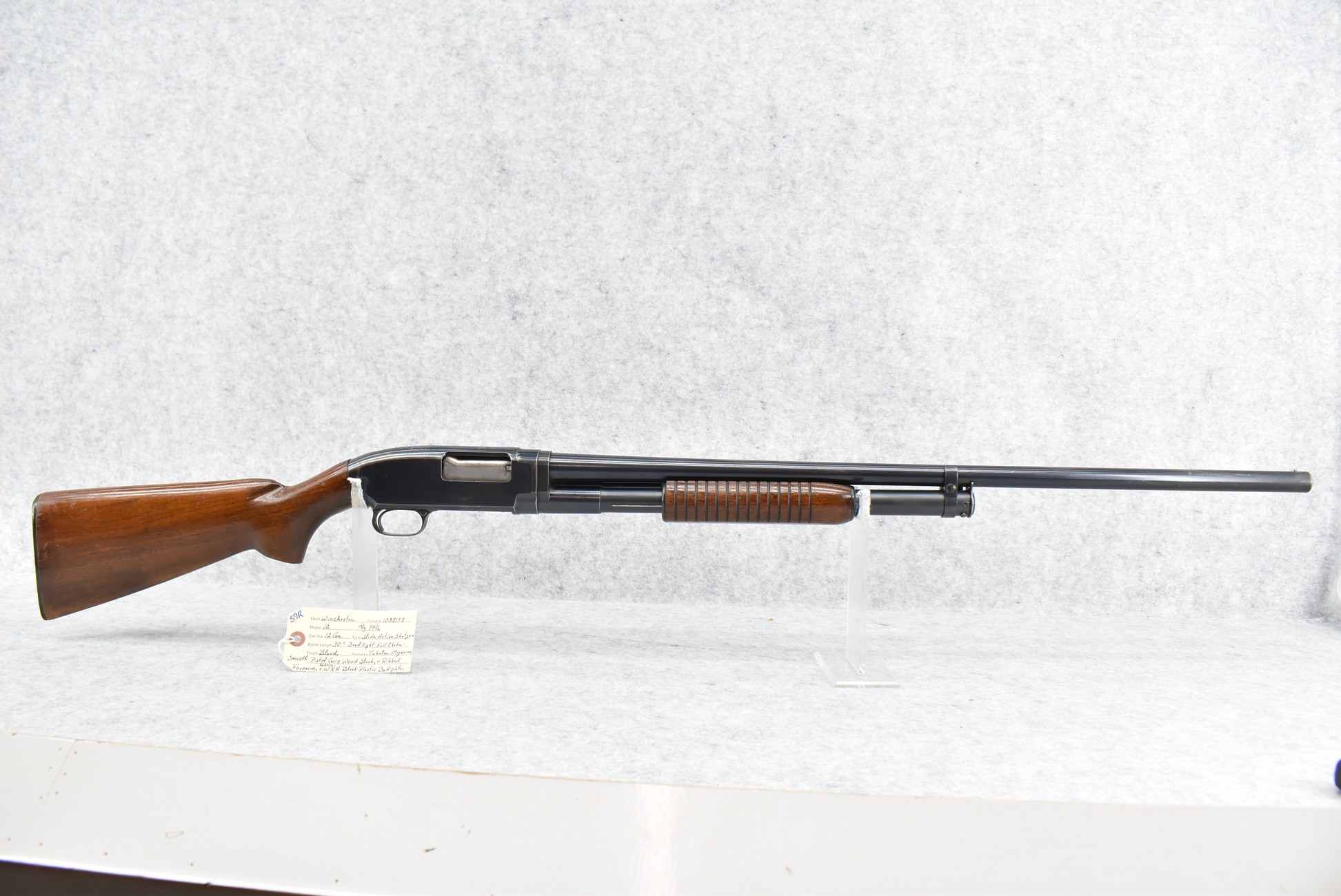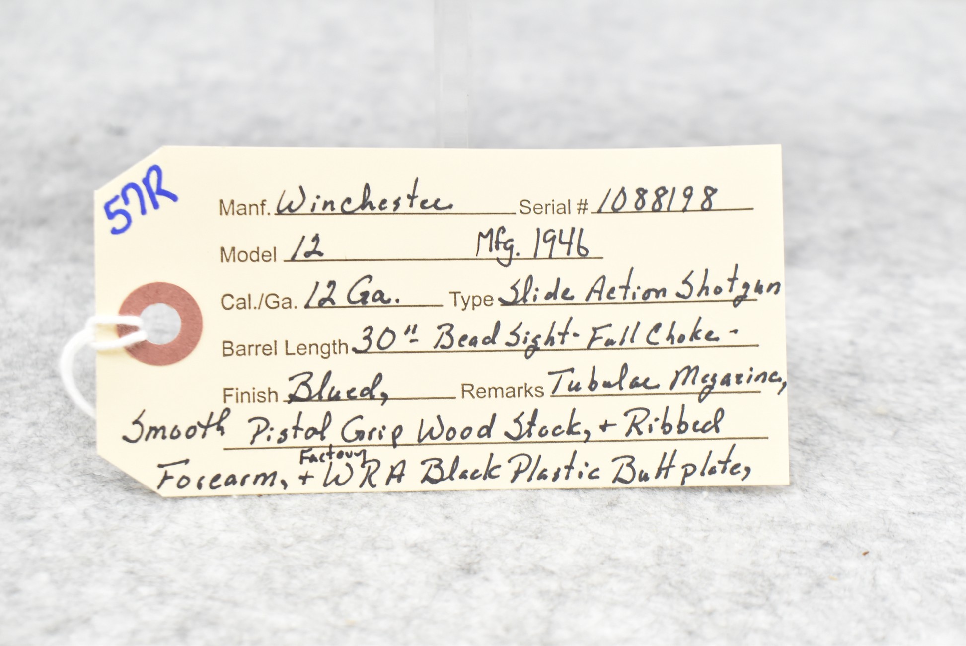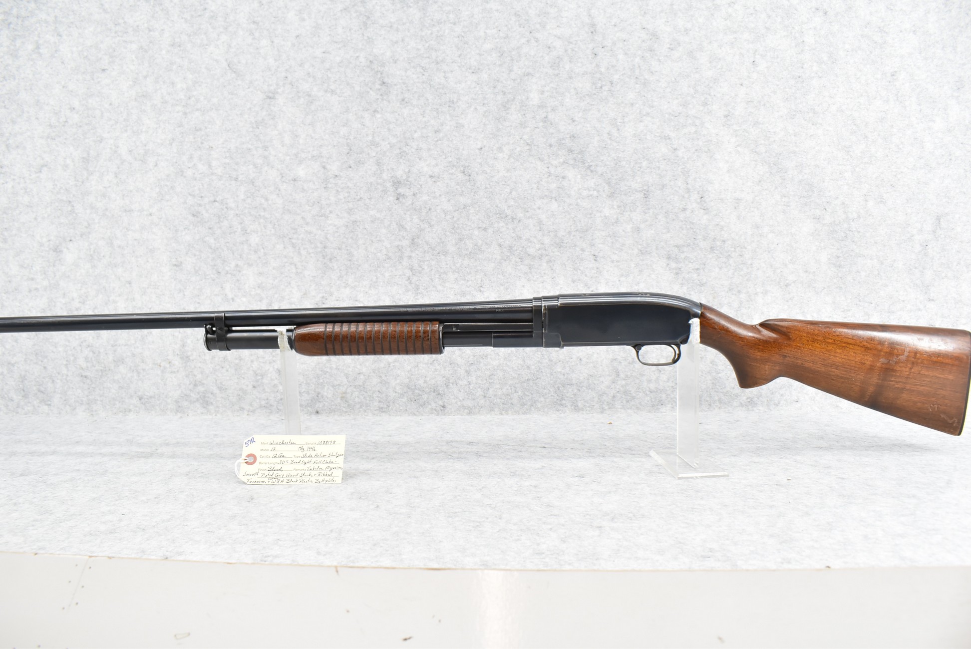 57R. Winchester – Mod. 12 – 12ga. Pump Action Shotgun – w/30” Full Choke Barrel w/Bead Sight – Blued Finish – w/Smooth Pistol Grip Wood Stock and Ribbed Forearm w/Factory WRA Black Plastic Butt Plate – Manufactured 1946