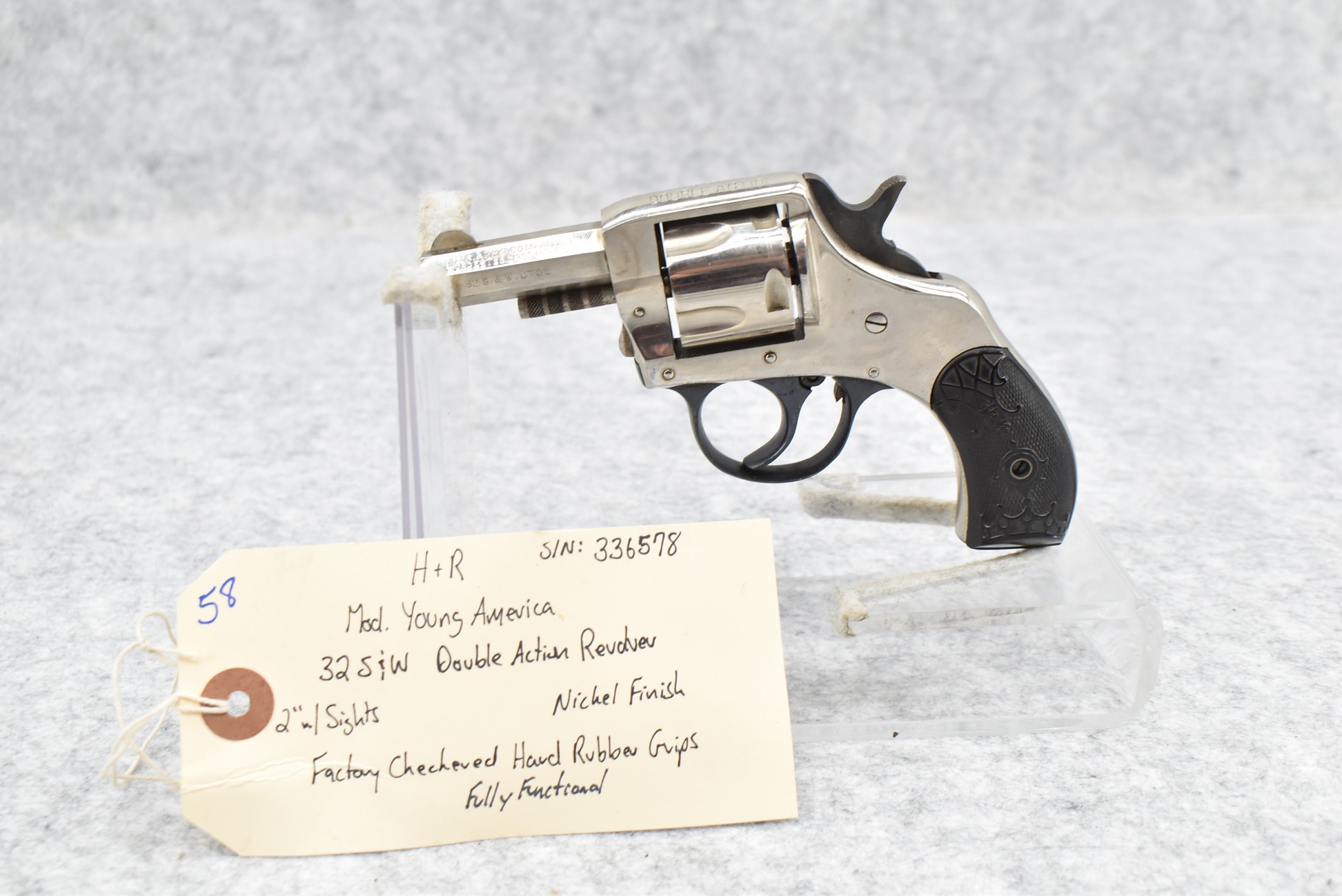 58. H. & R. – Mod. Young America – 32 S&W Cal. Double Action Revolver – w/2” Barrel w/Sights – Nickel Finish – w/Factory Checkered Hard Rubber Grips – Fully Functional