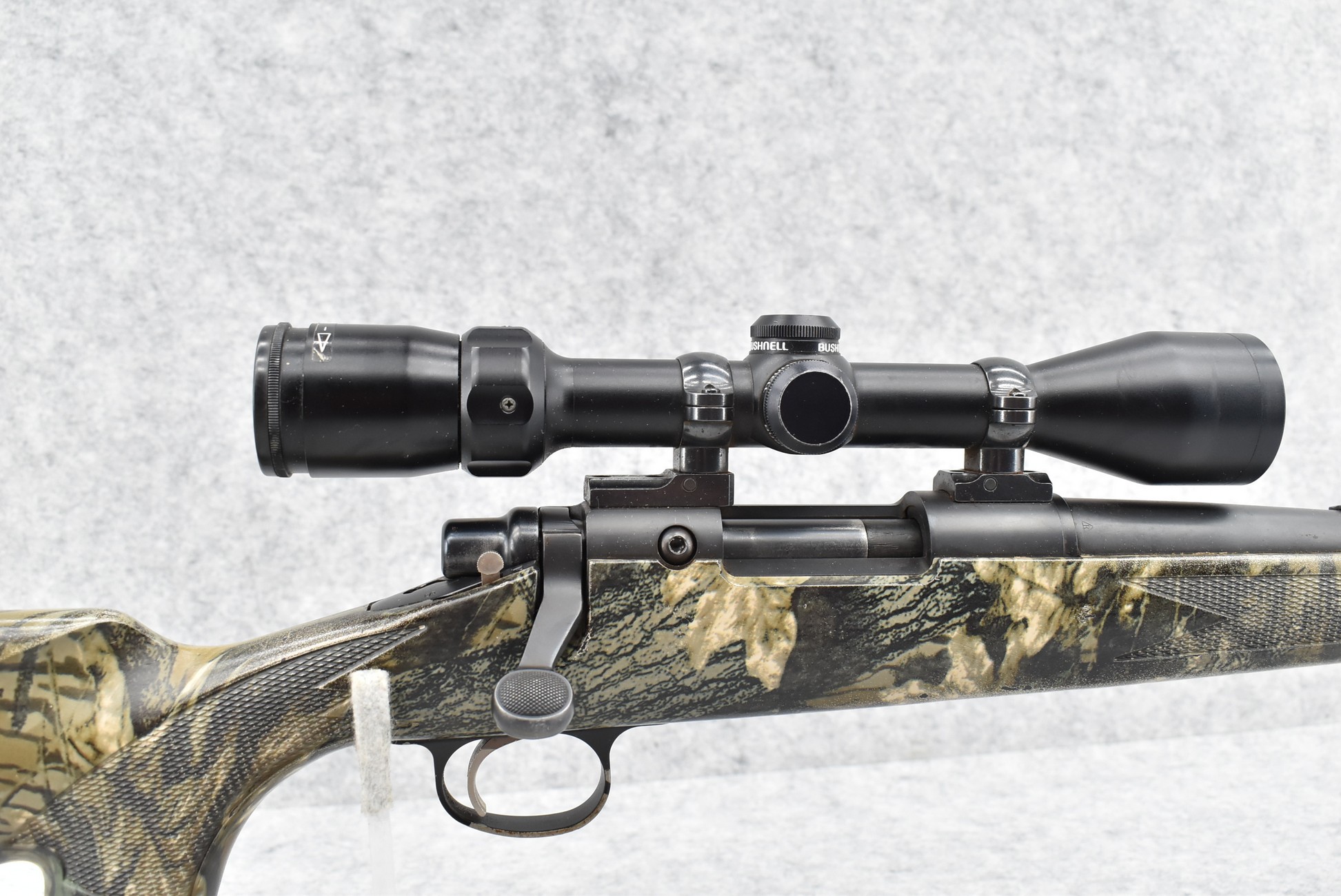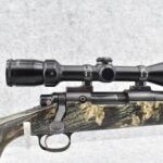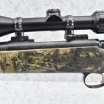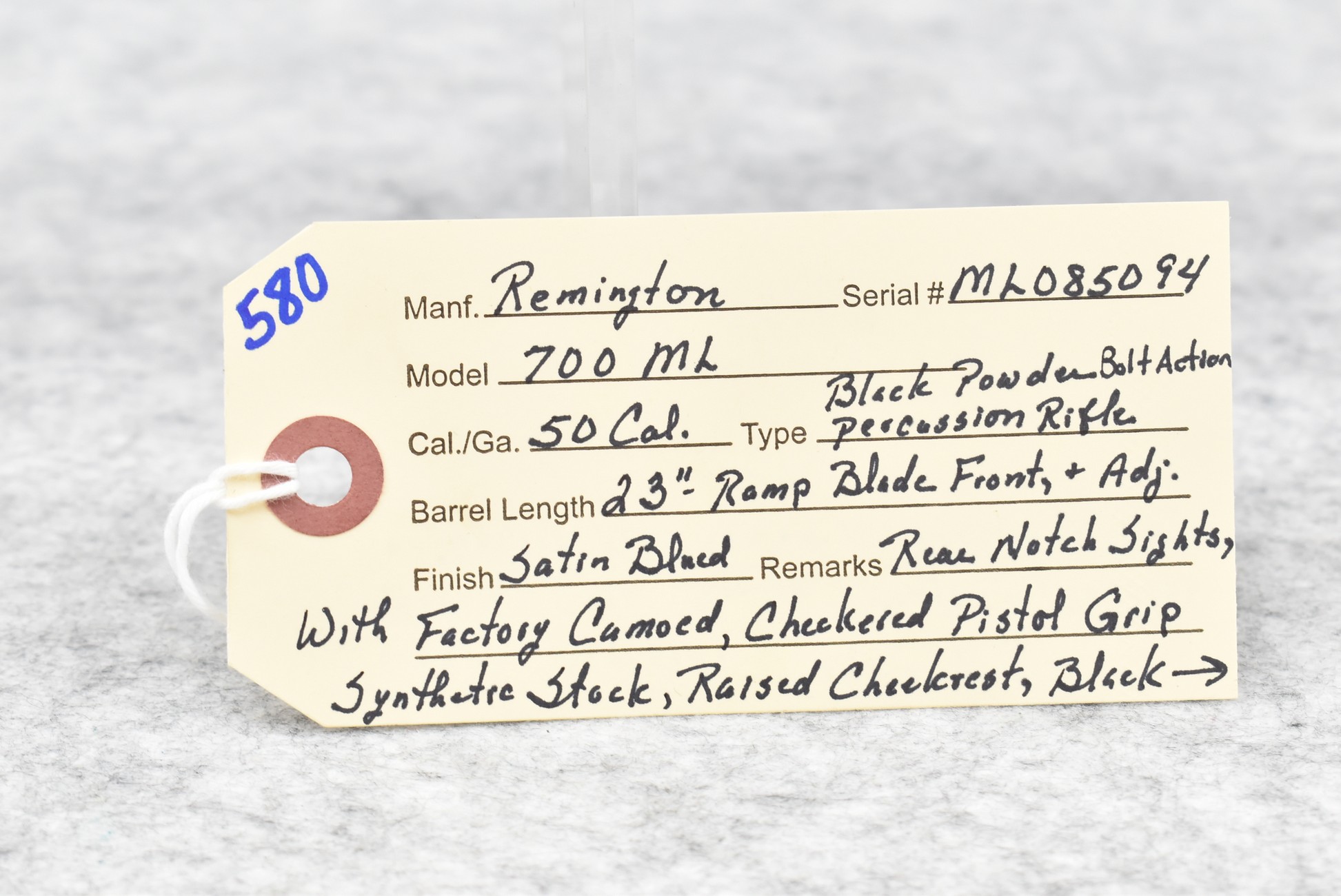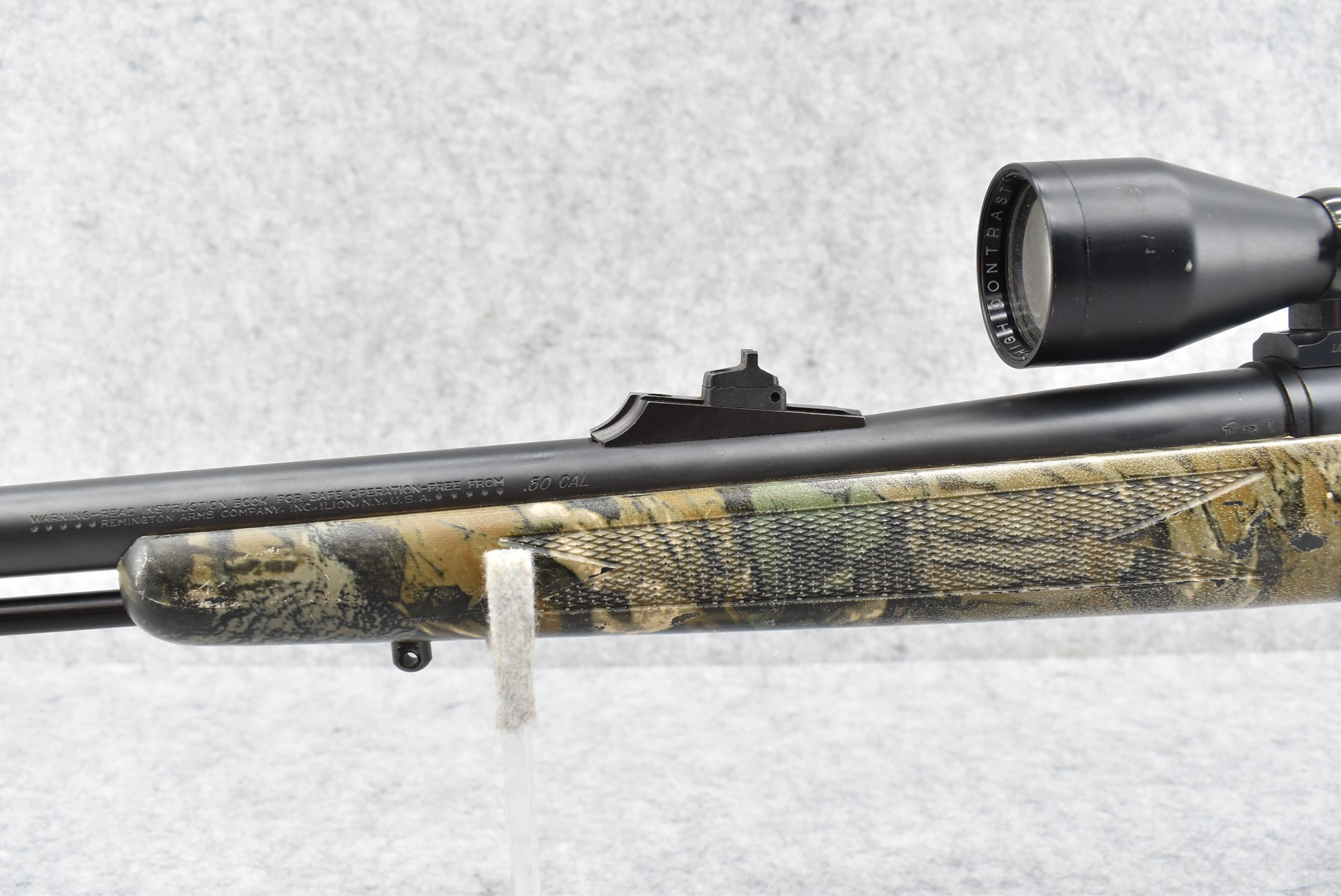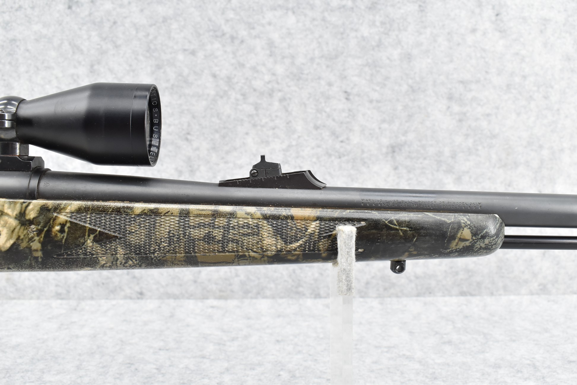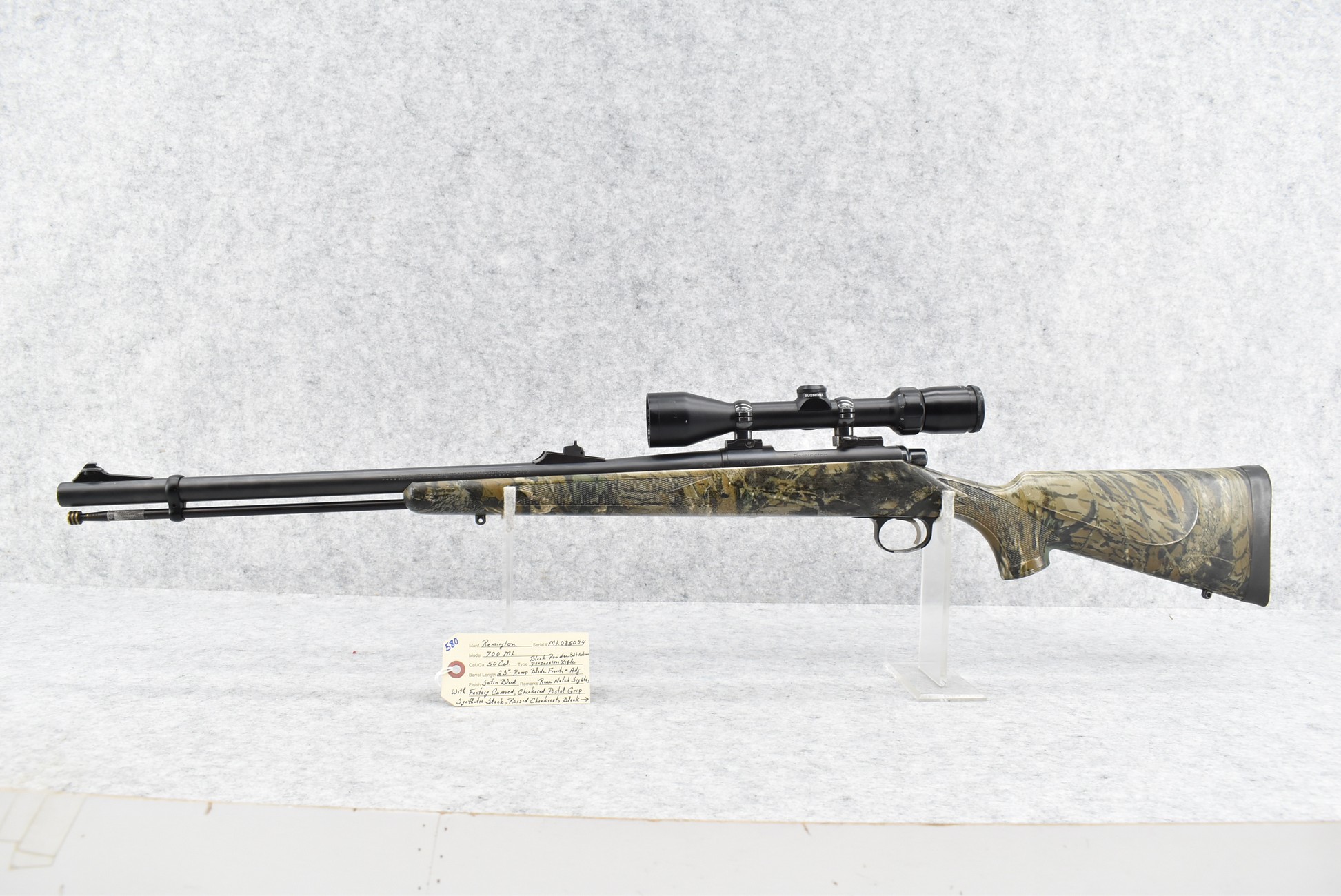 580. Remington – Mod. 700 ML – 50 Cal. Black Powder Bolt Action Percussion Rifle – w/23” Barrel w/Ramp Blade Front & Adj. Rear notch Sights – Satin Blued Finish – w/Factory Camoed Checkered Pistol Grip Synthetic Stock w/Factory Butt Pad – w/Ram Rod – w/Bushnell 3-9x40mm Scope & Mounts