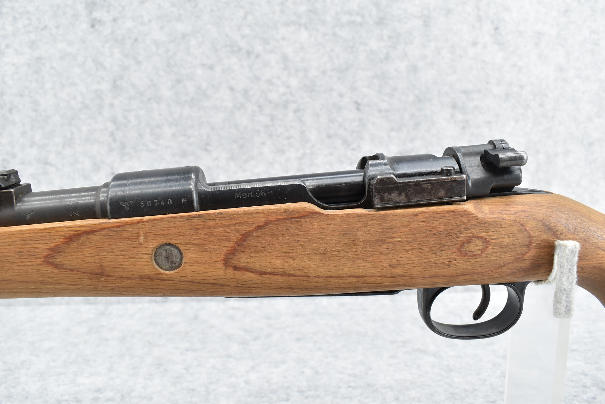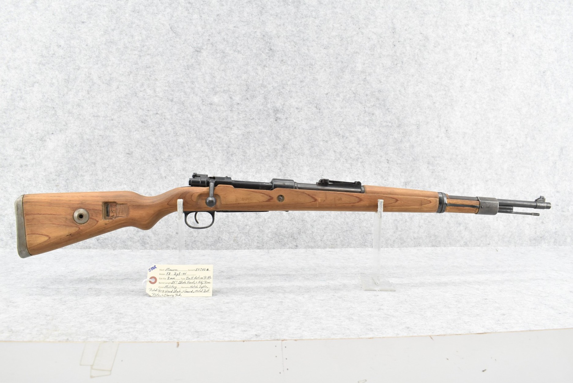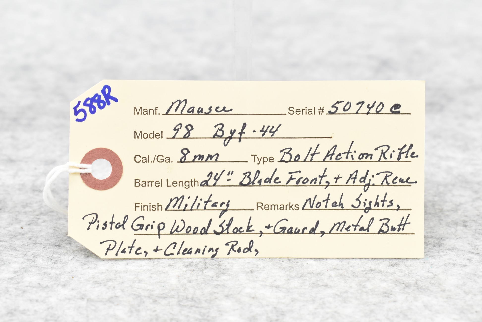 588R. Mauser – Mod. 98 – 8mm Cal. Bolt Action Rifle – w/24” Barrel w/Blade Front & Adj. Rear Notch Sights – Military Finish – w/Pistol Grip Wood Stocks w/Metal Butt Plate – w/Cleaning Rod – Mfg. Code byf – Dated 44