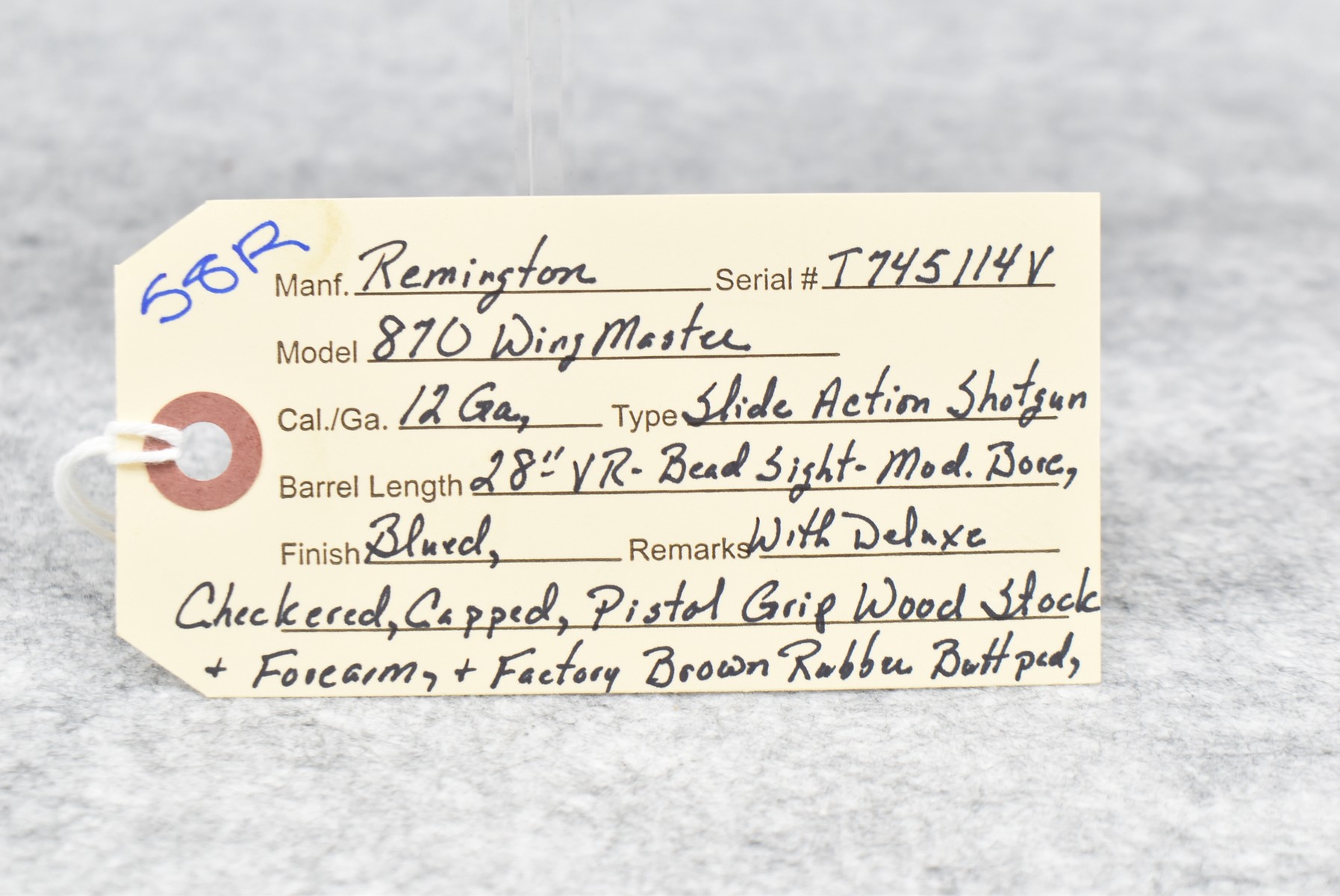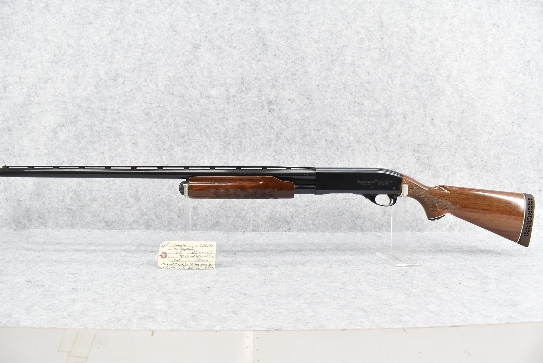 58R. Remington – Mod. 870 Wingmaster – 12ga. Pump Action Shotgun – w/28” Mod. Choke, Vent-Rib Barrel w/Bead Sight – Blued Finish – w/Deluxe Checkered Capped Pistol Grip Wood Stocks w/Factory Butt Pad