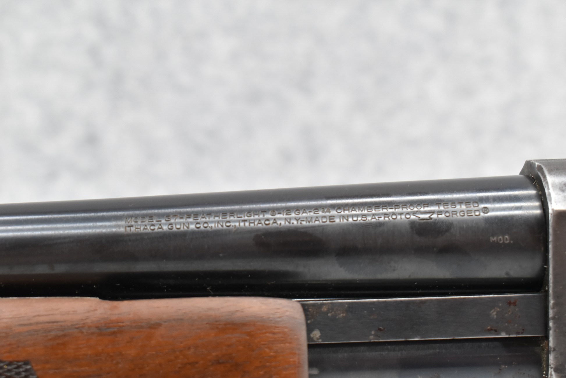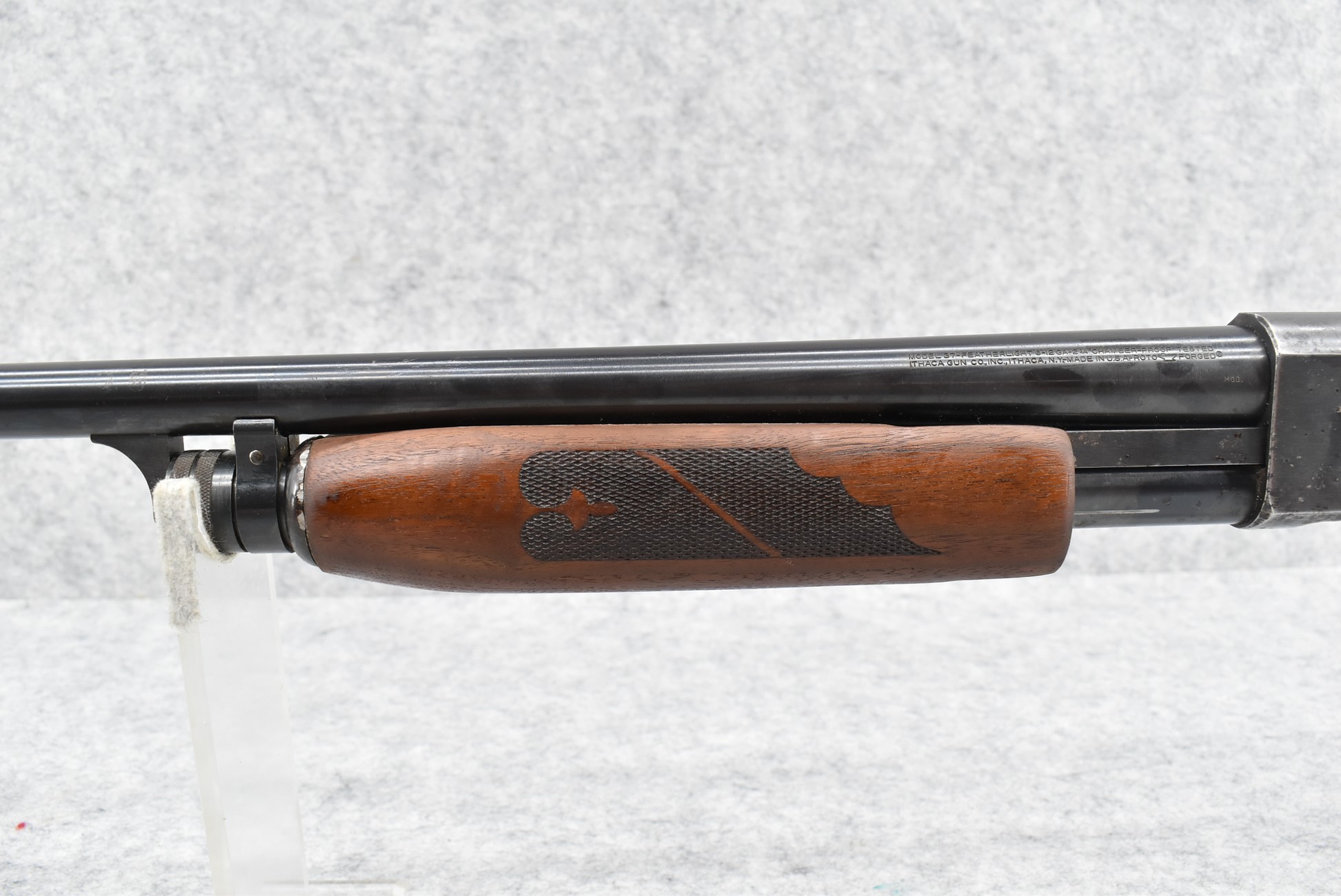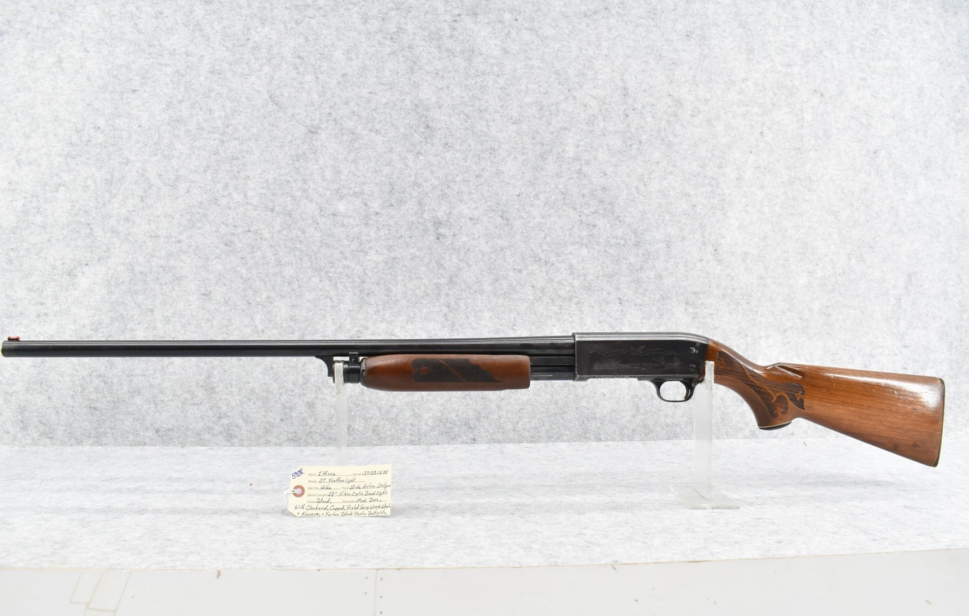 590R. Ithaca – Mod. 37 Featherlight – 12ga. Pump Action Shotgun – w/28” Mod. Choke Barrel w/Fiber Optic Bead Sight – Blued Finish – w/Checkered Capped Pistol Grip Wood Stocks w/Factory Butt Plate