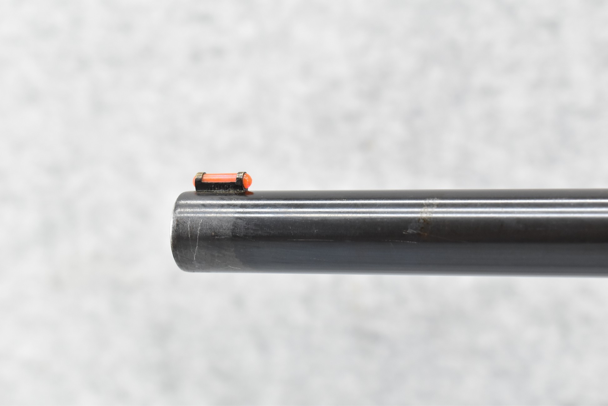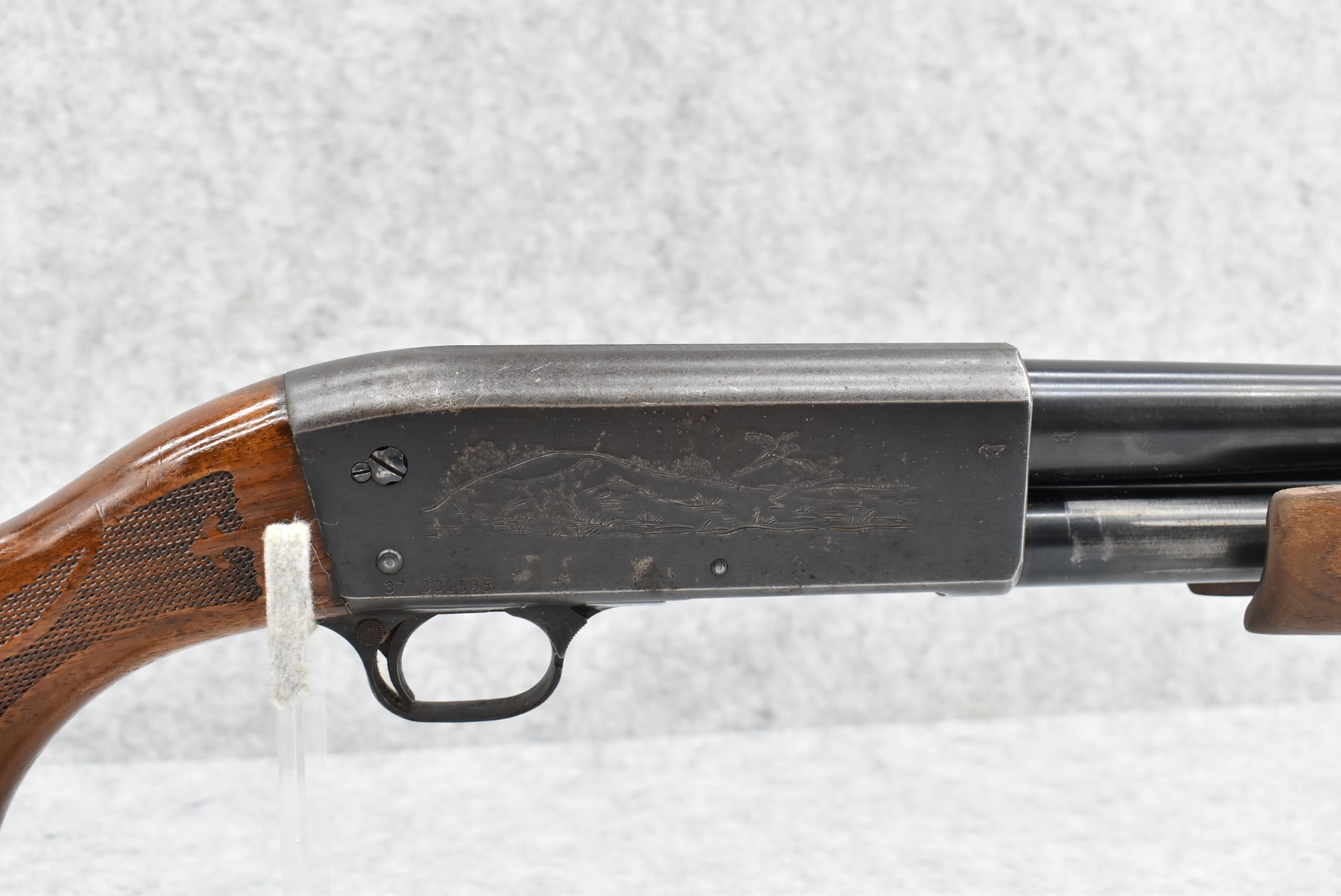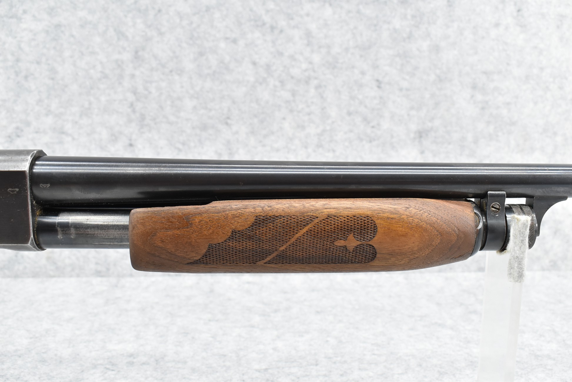 590R. Ithaca – Mod. 37 Featherlight – 12ga. Pump Action Shotgun – w/28” Mod. Choke Barrel w/Fiber Optic Bead Sight – Blued Finish – w/Checkered Capped Pistol Grip Wood Stocks w/Factory Butt Plate