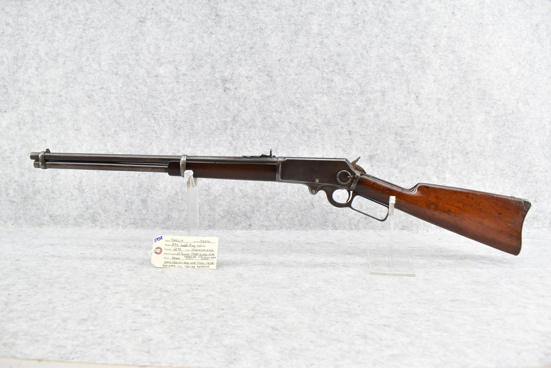 593R. Marlin – Mod. 1893 Saddle Ring Carbine – 32-40 Cal. Lever Action Rifle – w/20” Round Barrel w/Front Blade & Rear Marbles Adj. Semi-Buckhorn Sights w/Full Tubular Magazine – Brown Finish – w/Plain Straight Grip Wood Stocks w/Factory Butt Plate