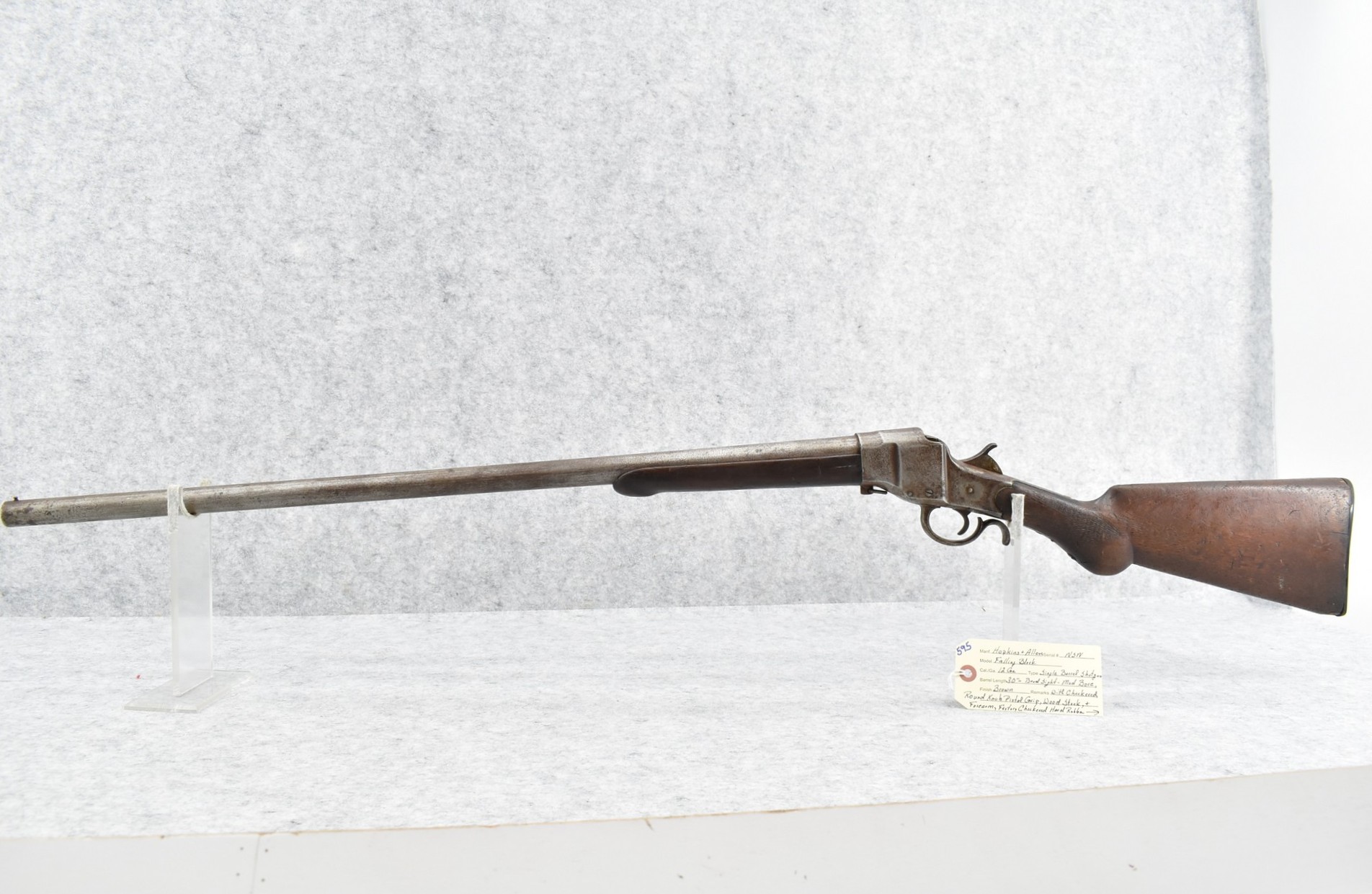 595. Hopkins & Allen – Mod. Falling Block – 12ga. Single Barrel Shotgun – w/30” Mod. Choke Barrel w/Bead Sight – Brown Finish – w/Checkered Round Knob Pistol Grip Wood Stocks w/Checkered Hard Rubber Butt Plate