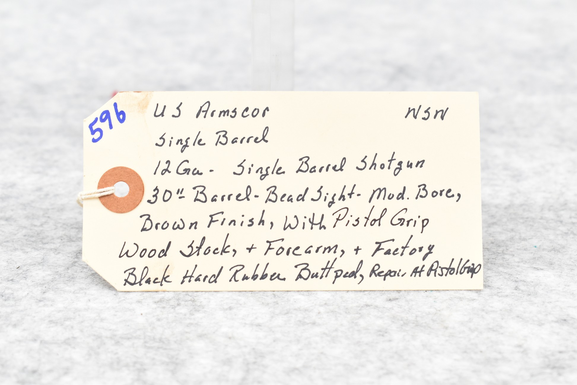 596. U.S. Armscor – 12ga. Single Barrel Shotgun – w/30” Mod. Choke Barrel w/Bead Sight – Brown Finish – w/Pistol Grip Wood Stocks w/Factory Hard Rubber Butt Pad – Note: Repair at Pistol Grip