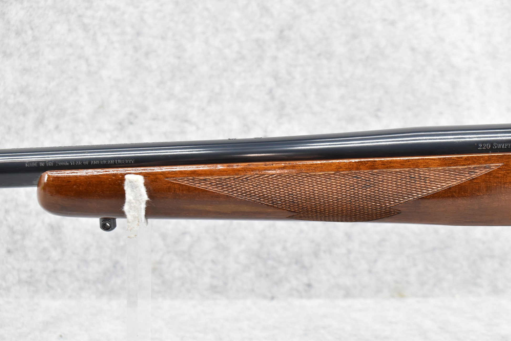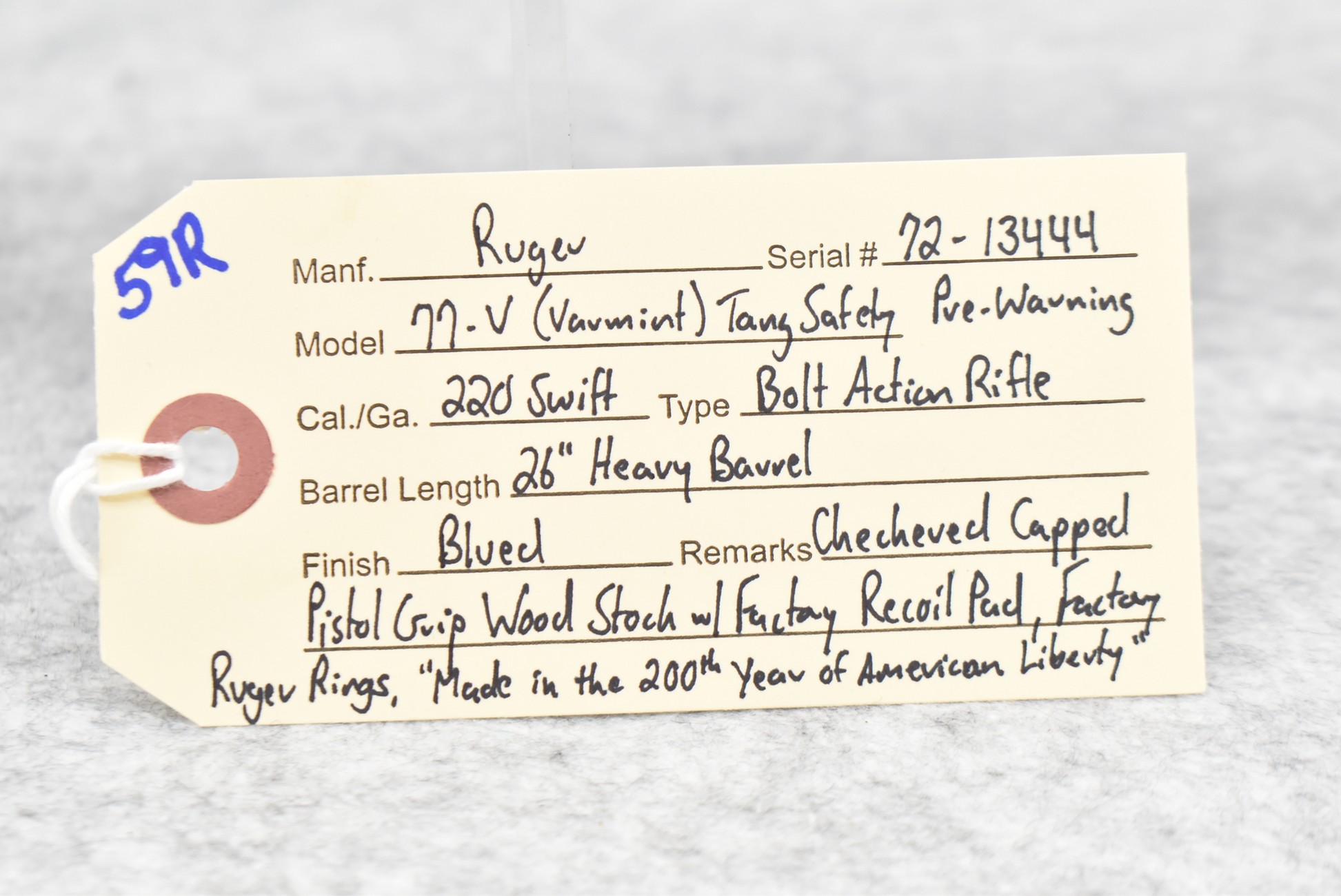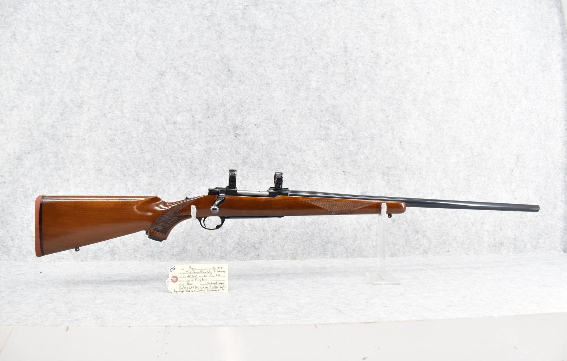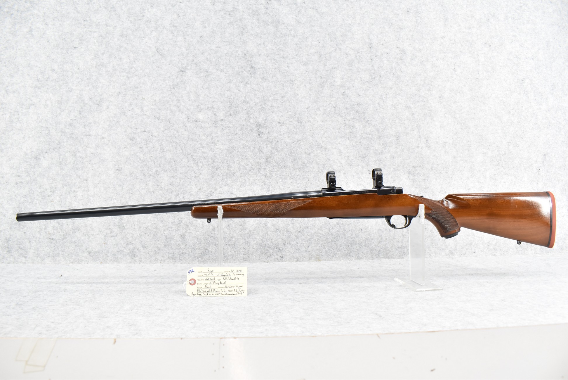 59R. Ruger – Mod. 77-V (Varmint) Tang Safety Pre-Warning – “Made in the 200th Year of American Liberty” – 220 Swift Cal. Bolt Action Rifle – w/26” Heavy Barrel – Blued Finish – w/Checkered Capped Pistol Grip Wood Stock w/Factory Recoil Pad – w/Factory Ruger Rings