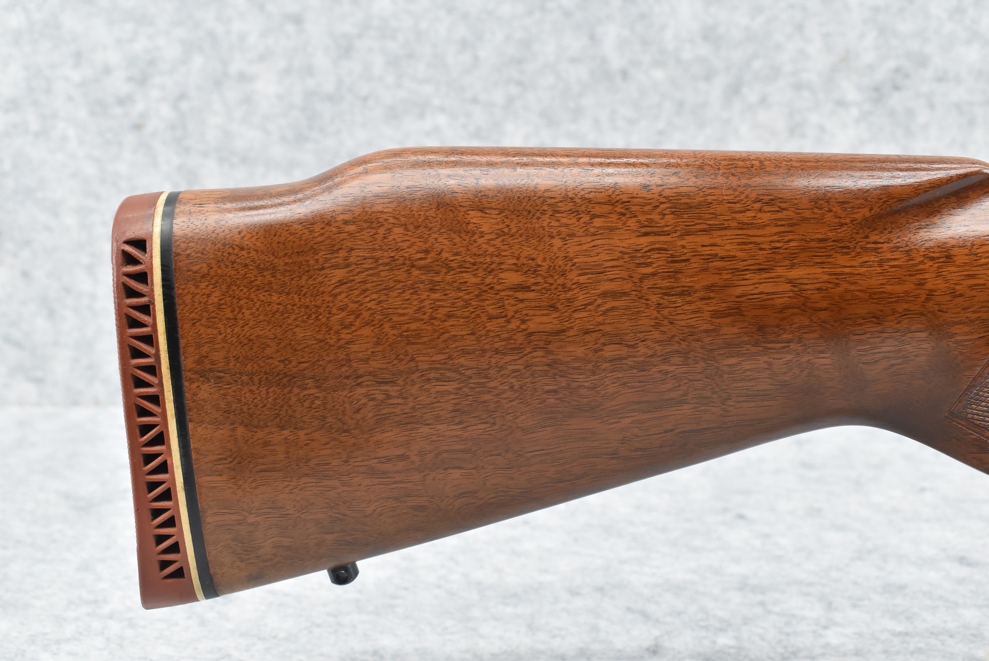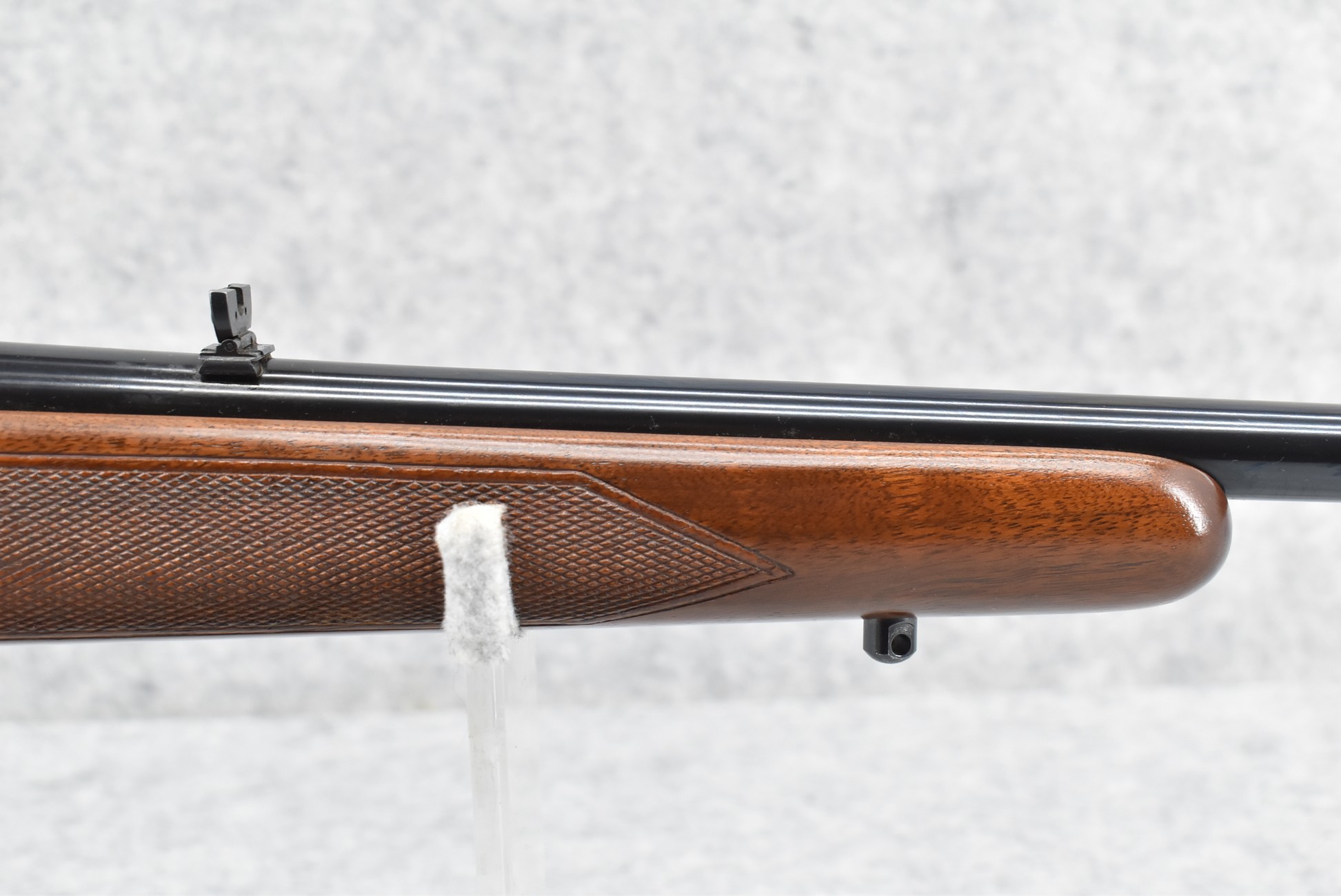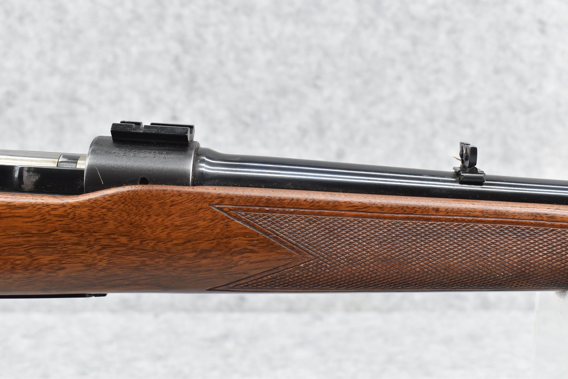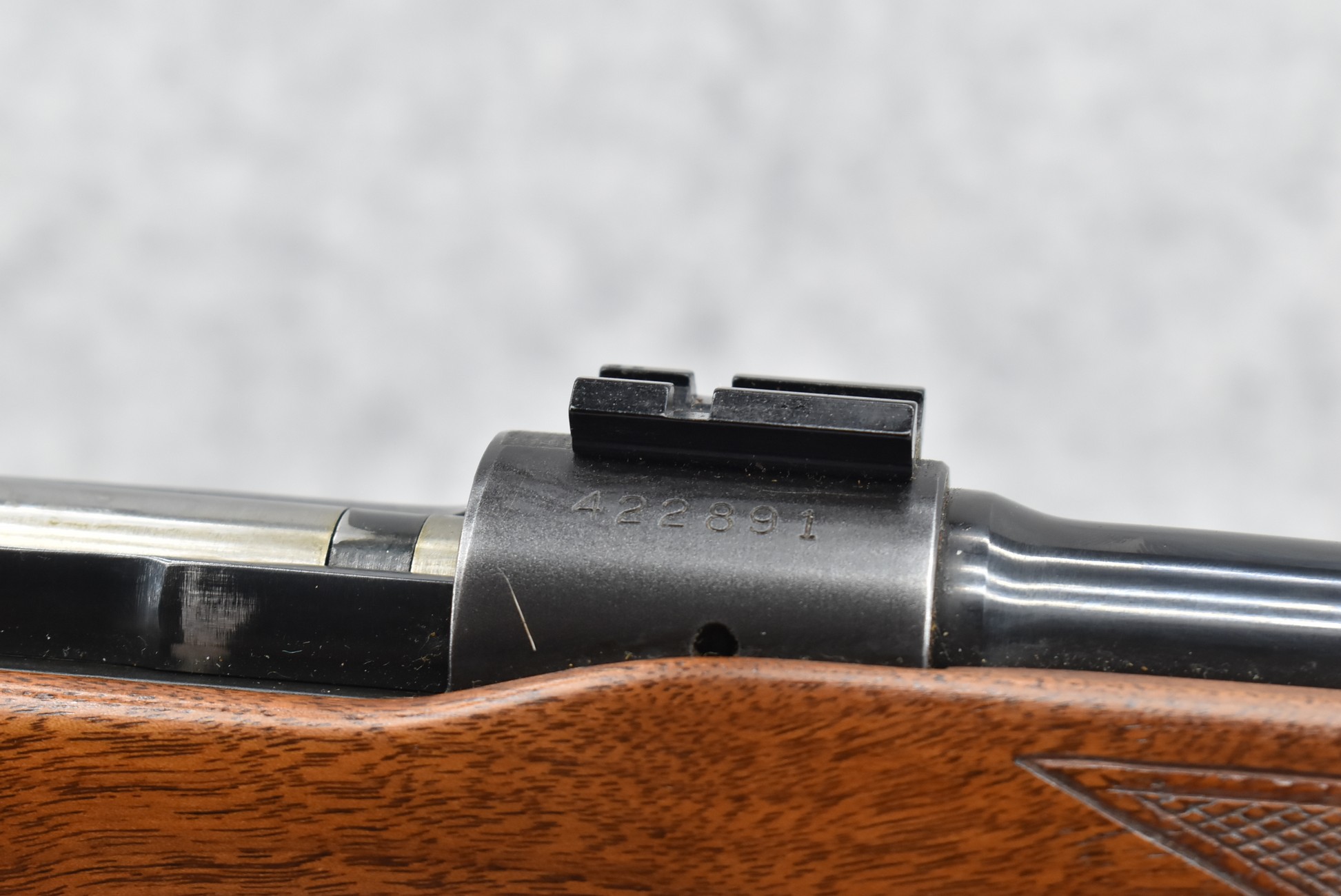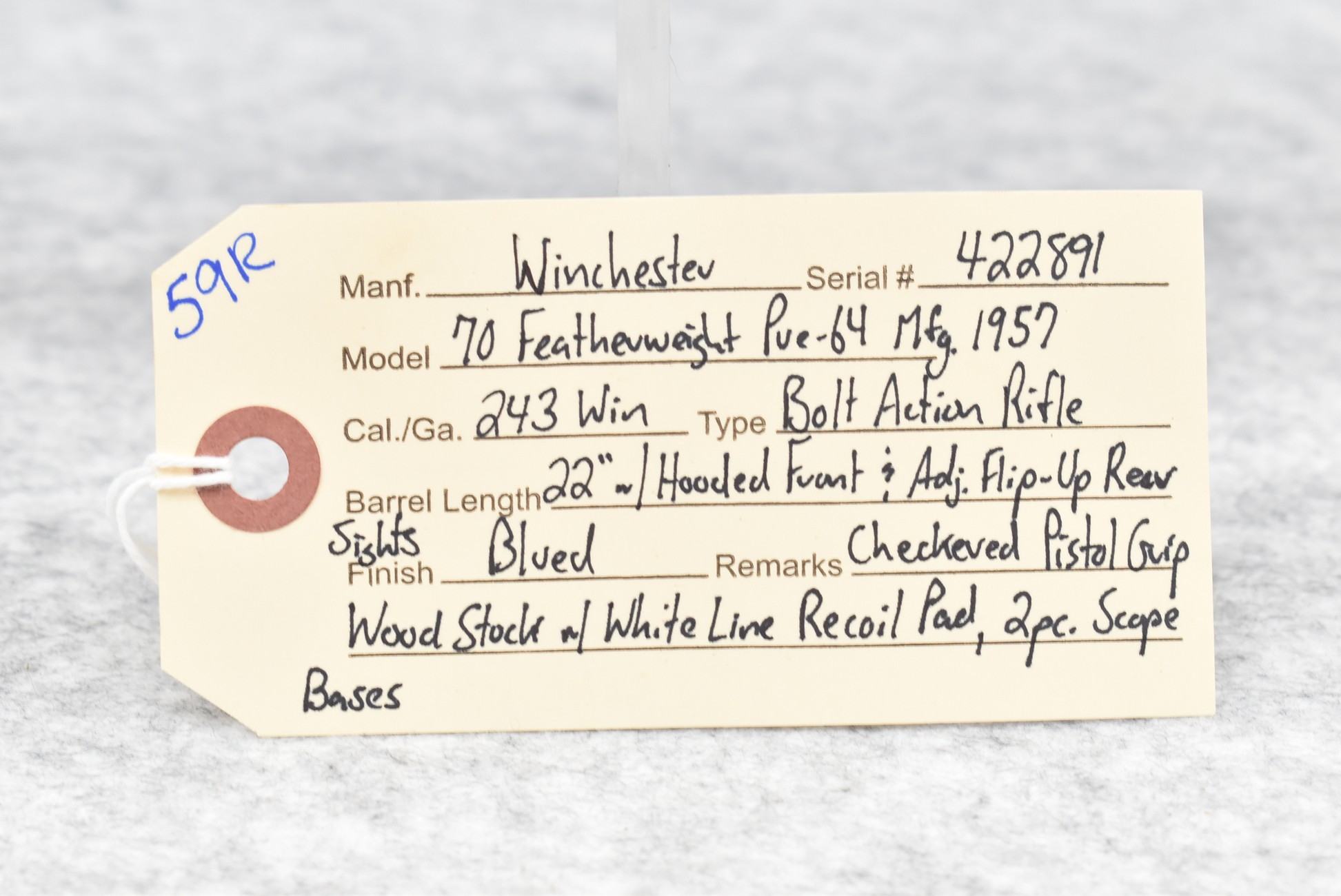 59R. Winchester – Mod. 70 Featherweight Pre-64 – 243 Win. Cal. Bolt Action Rifle – w/22” Barrel w/Hooded Front and Adjustable Flip-Up Rear Sights – Blued Finish – w/Checkered Pistol Grip Wood Stock w/White Line Recoil Pad – w/2-Piece Scope Bases – Manufactured in 1957