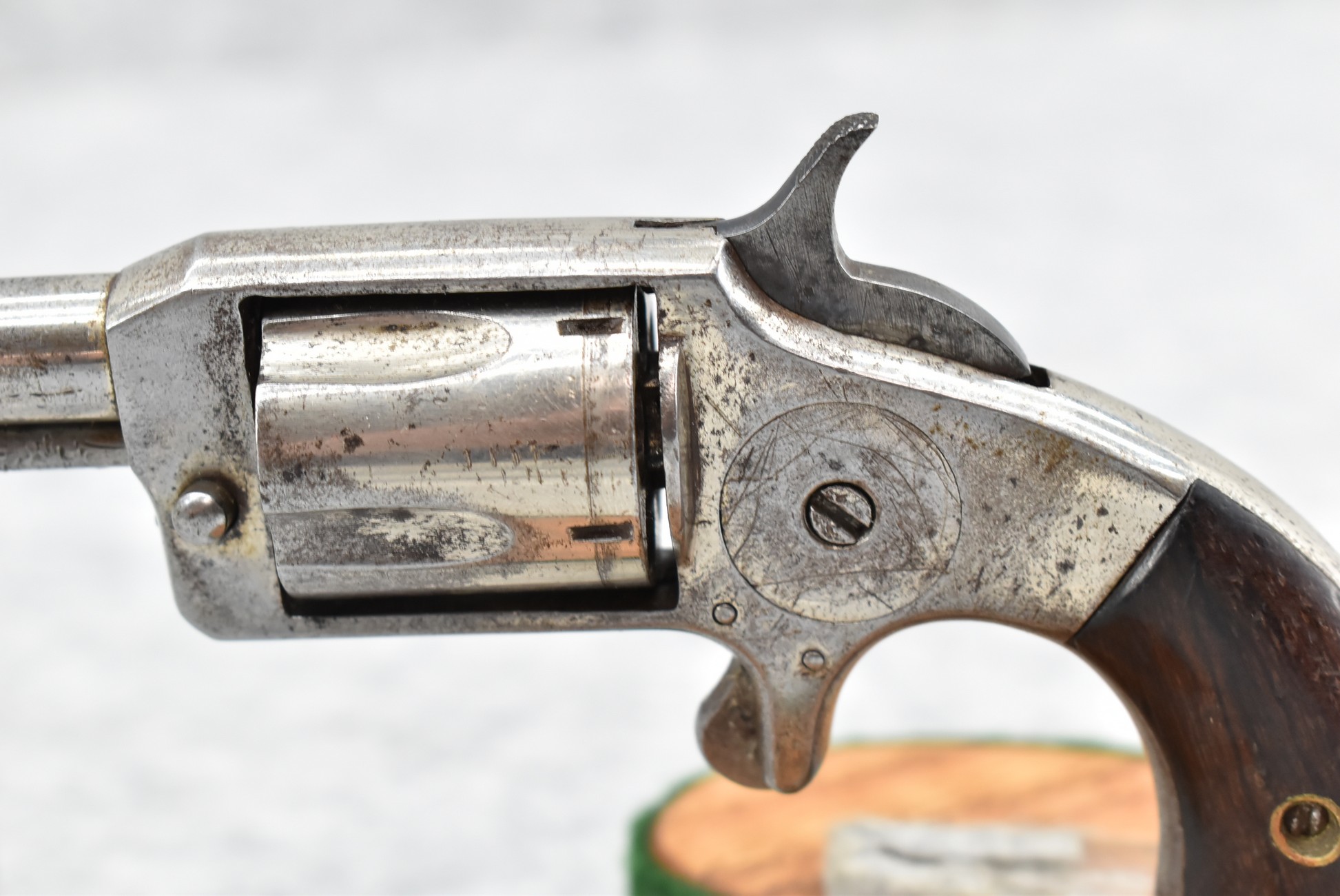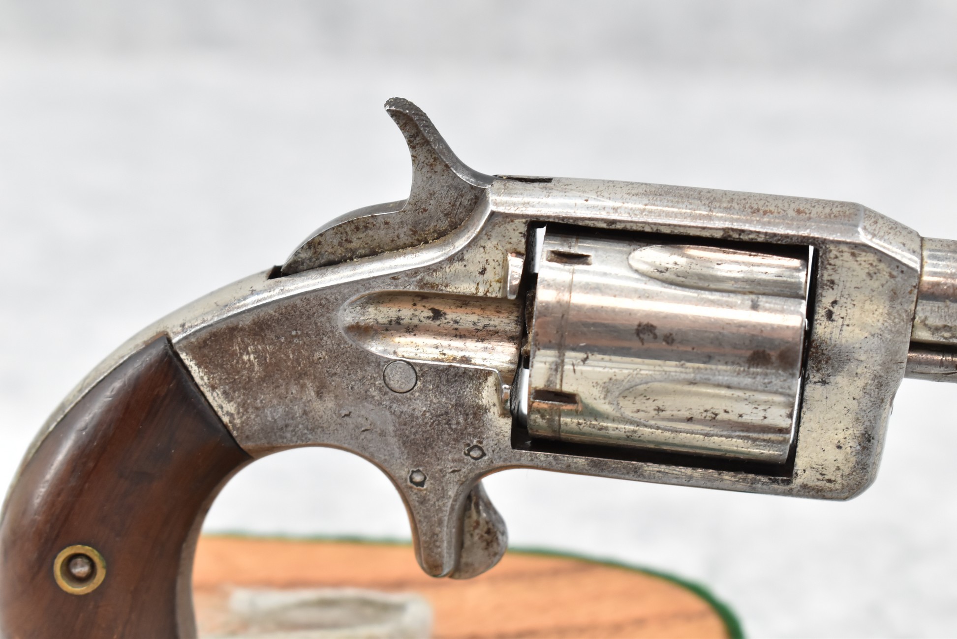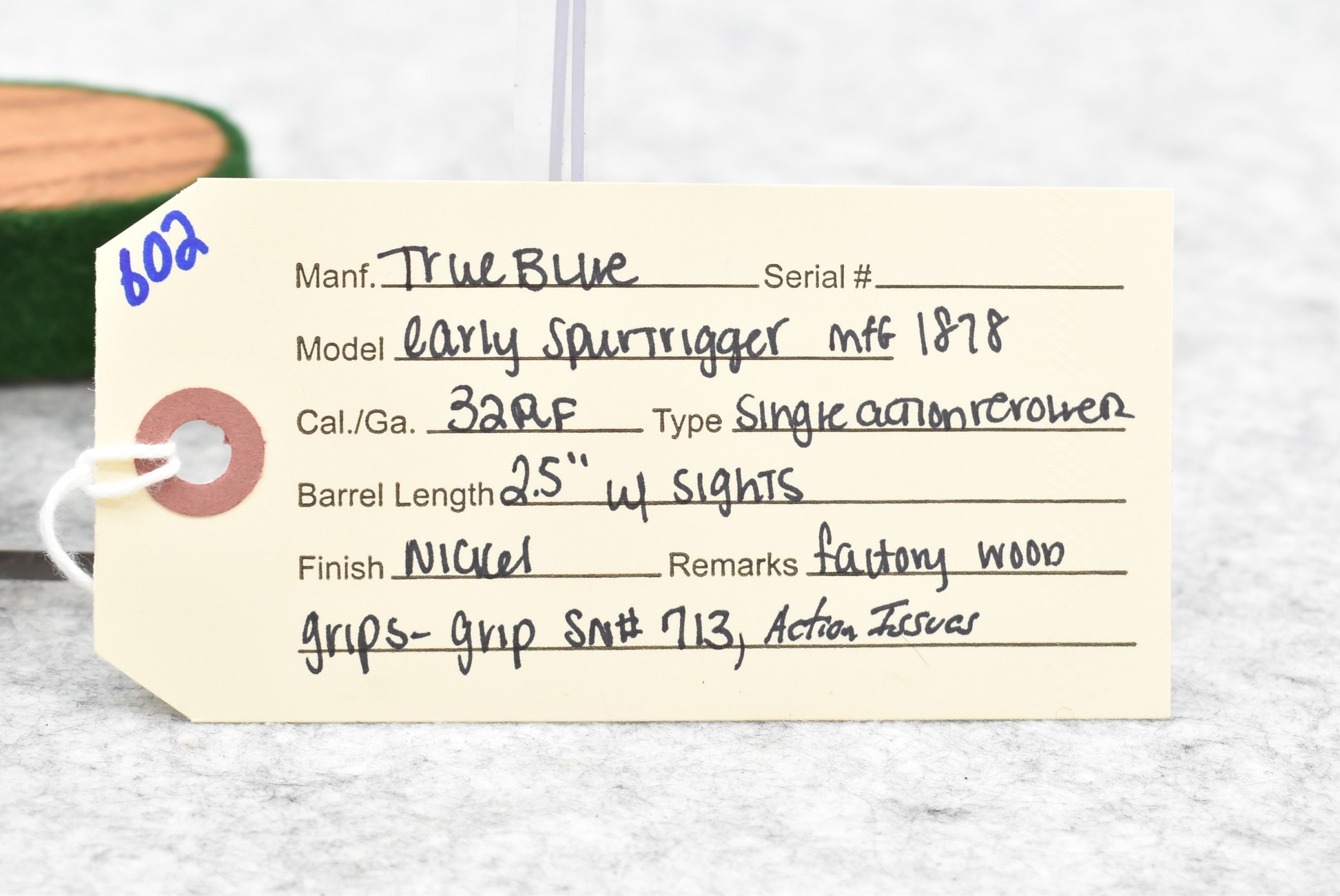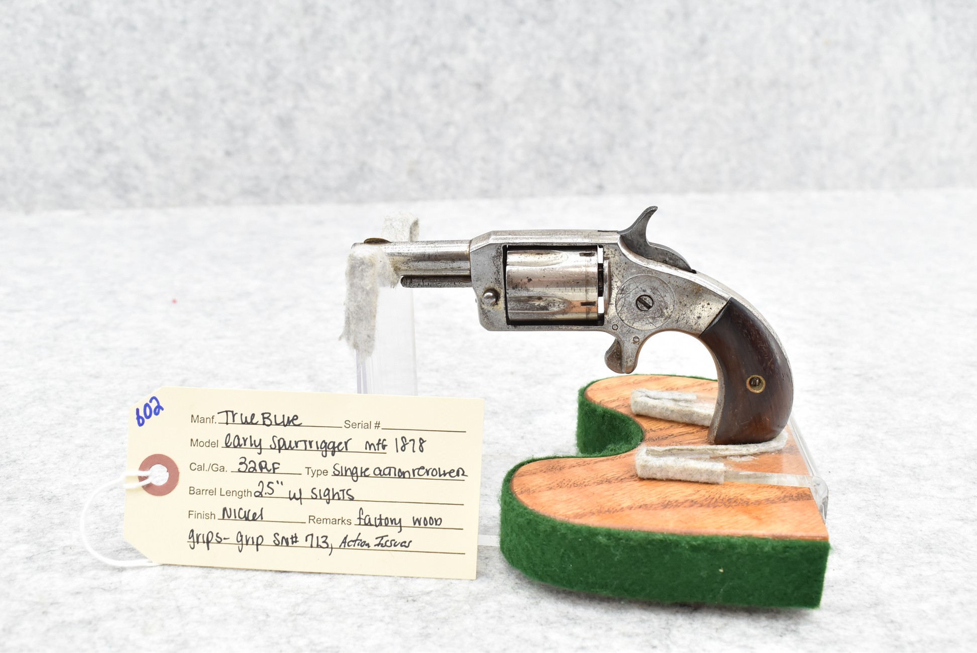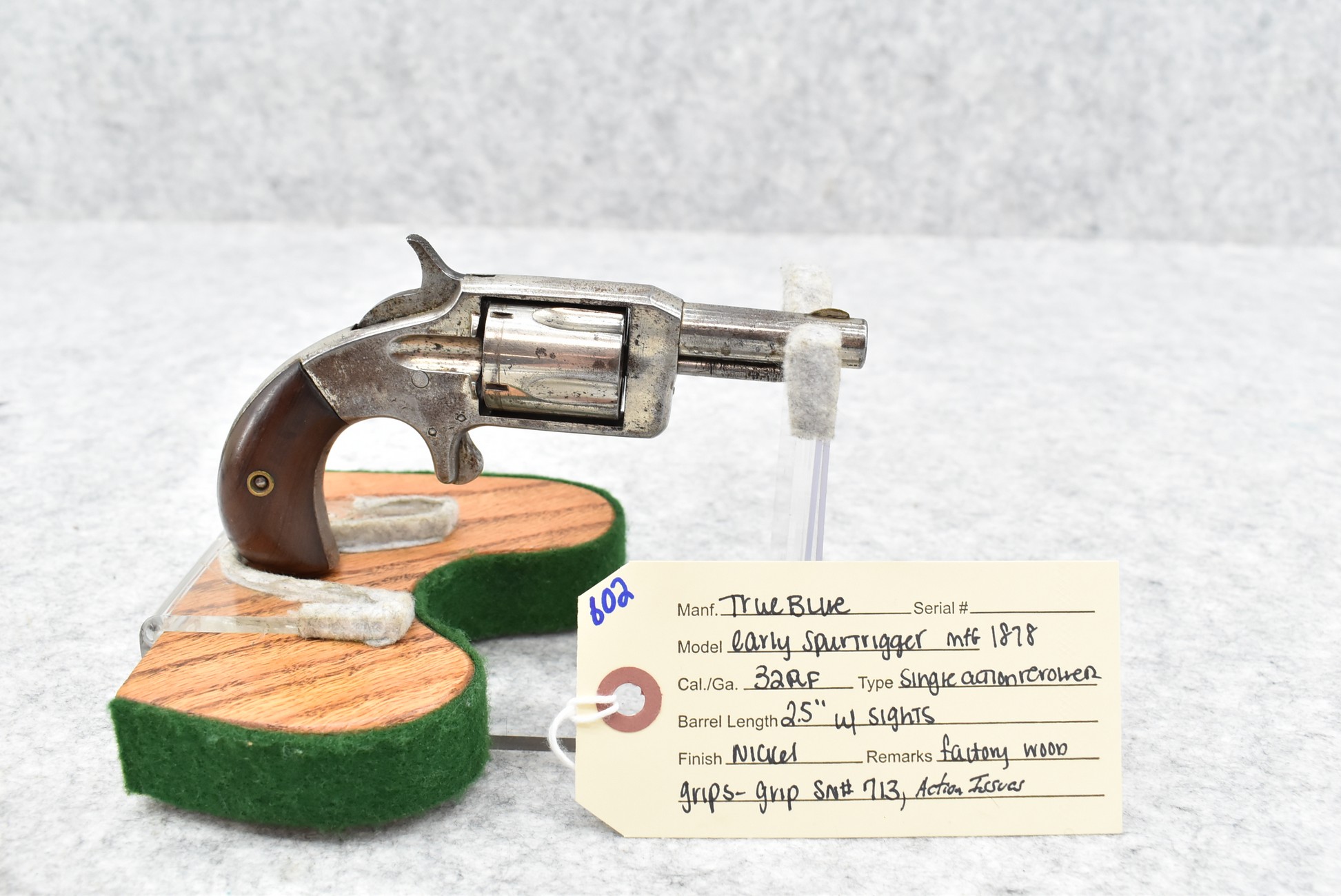 602. True Blue – 32 RF Cal. Spur Trigger Single Action Revolver – w/2.5” Barrel w/Sights – Nickel Finish – w/Factory Wood Grips – Note: Action Issues