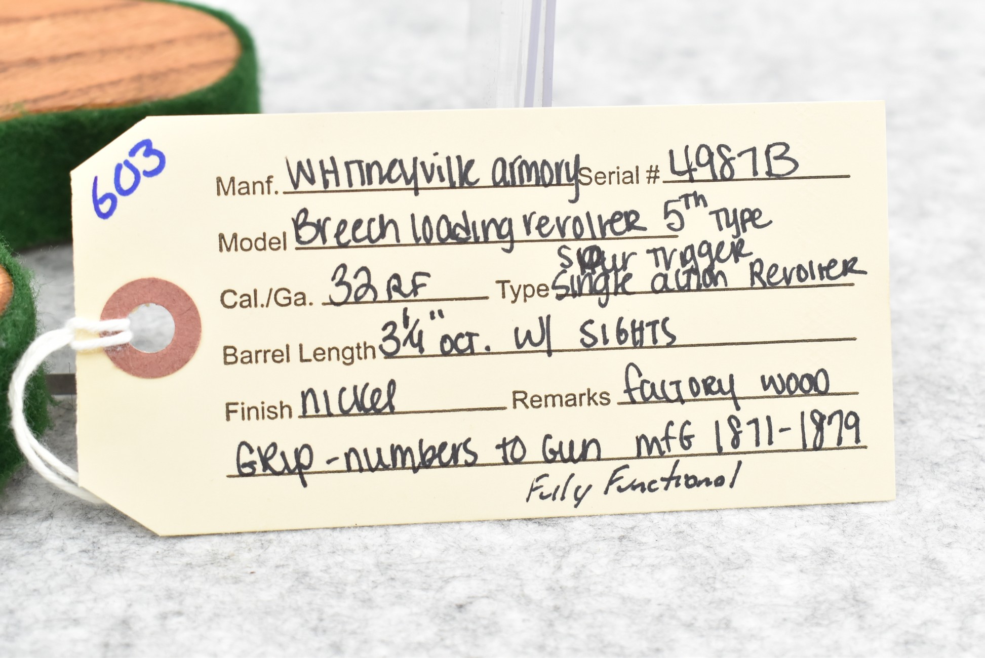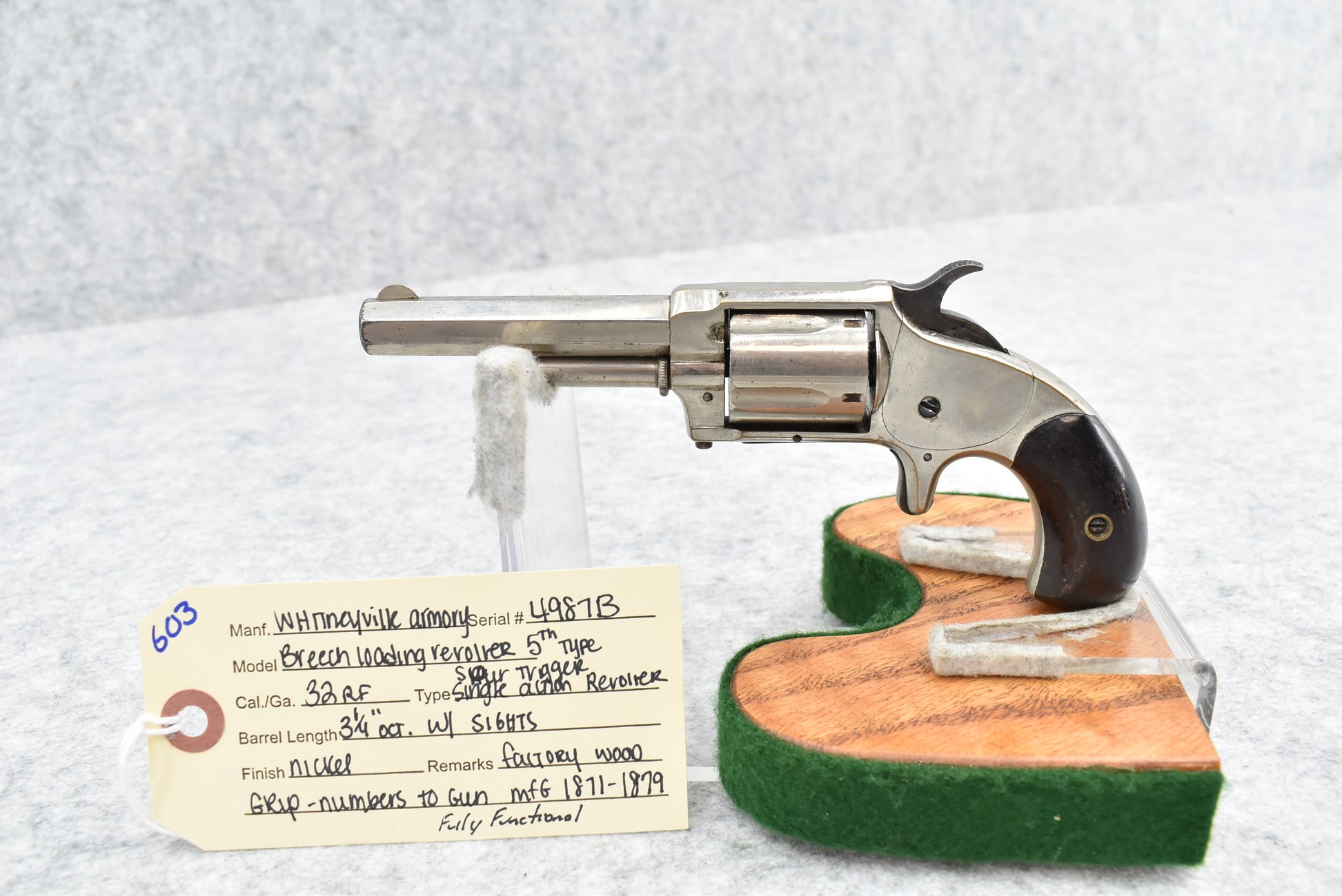 603. Whitneyville Armory – Breech Loading Revolver 5th Type – 32 RF Cal. Spur Trigger Single Action Revolver – w/3 ¼” Octagon Barrel w/Sights – Nickel Finish – w/Factory Wood Grip That Numbers to Gun – Mfg. Between 1871-1879 – Fully Functional